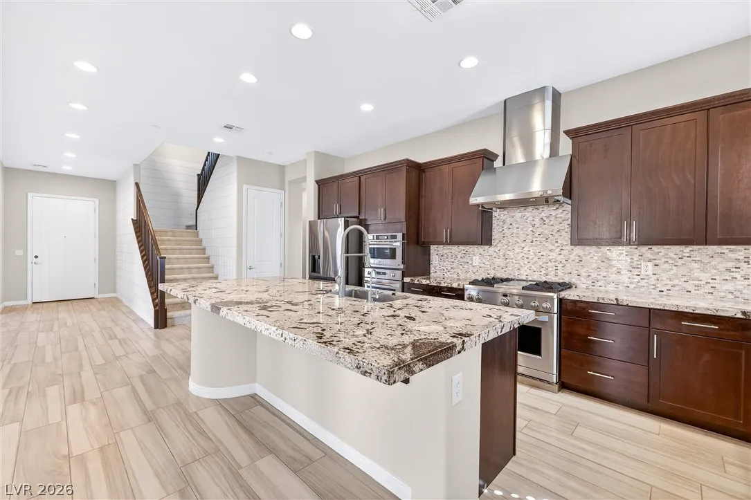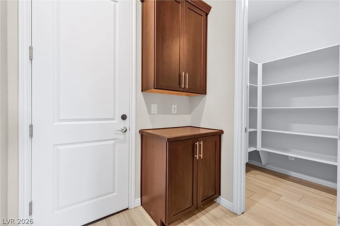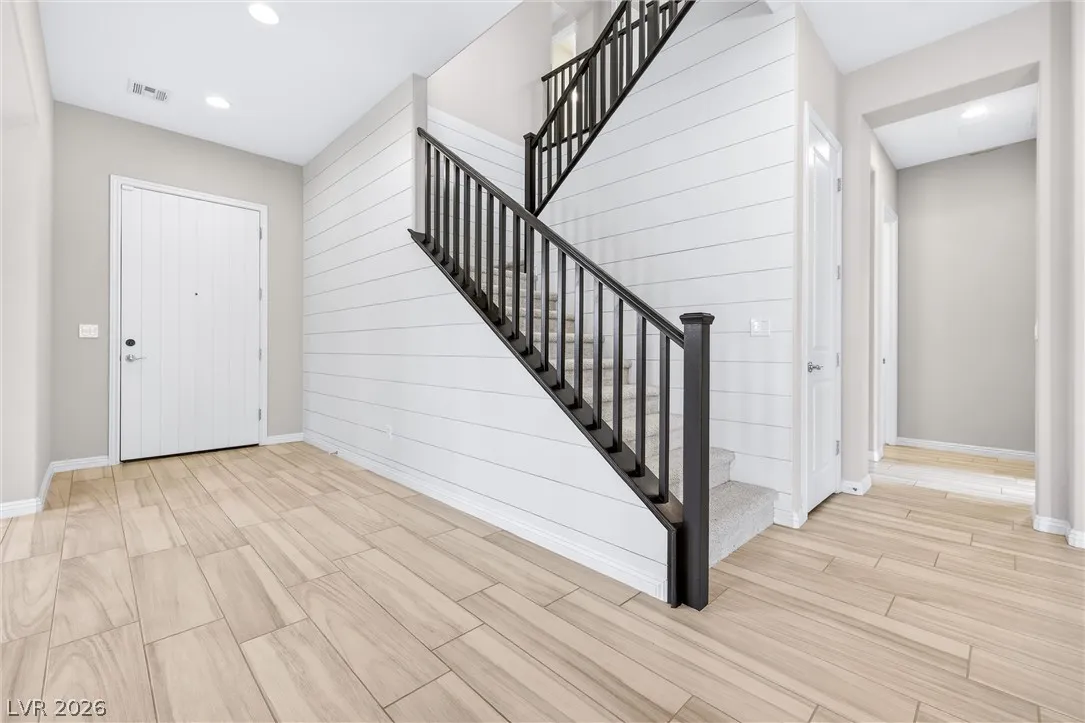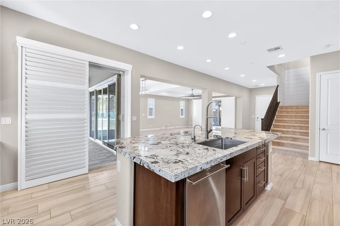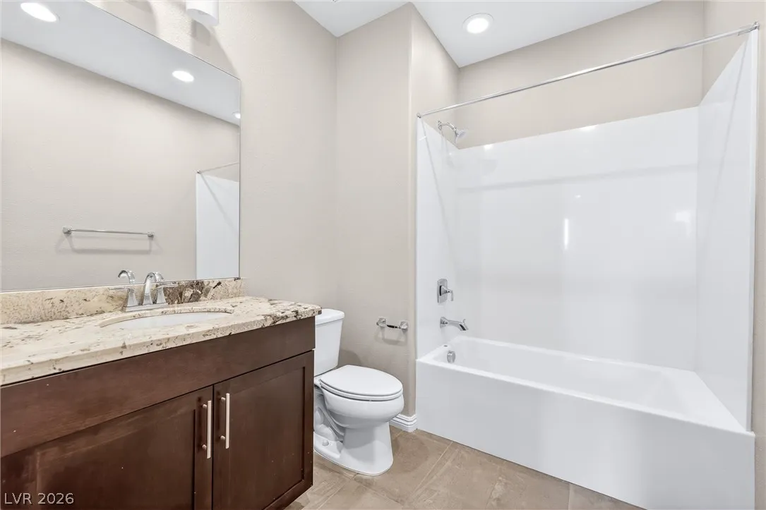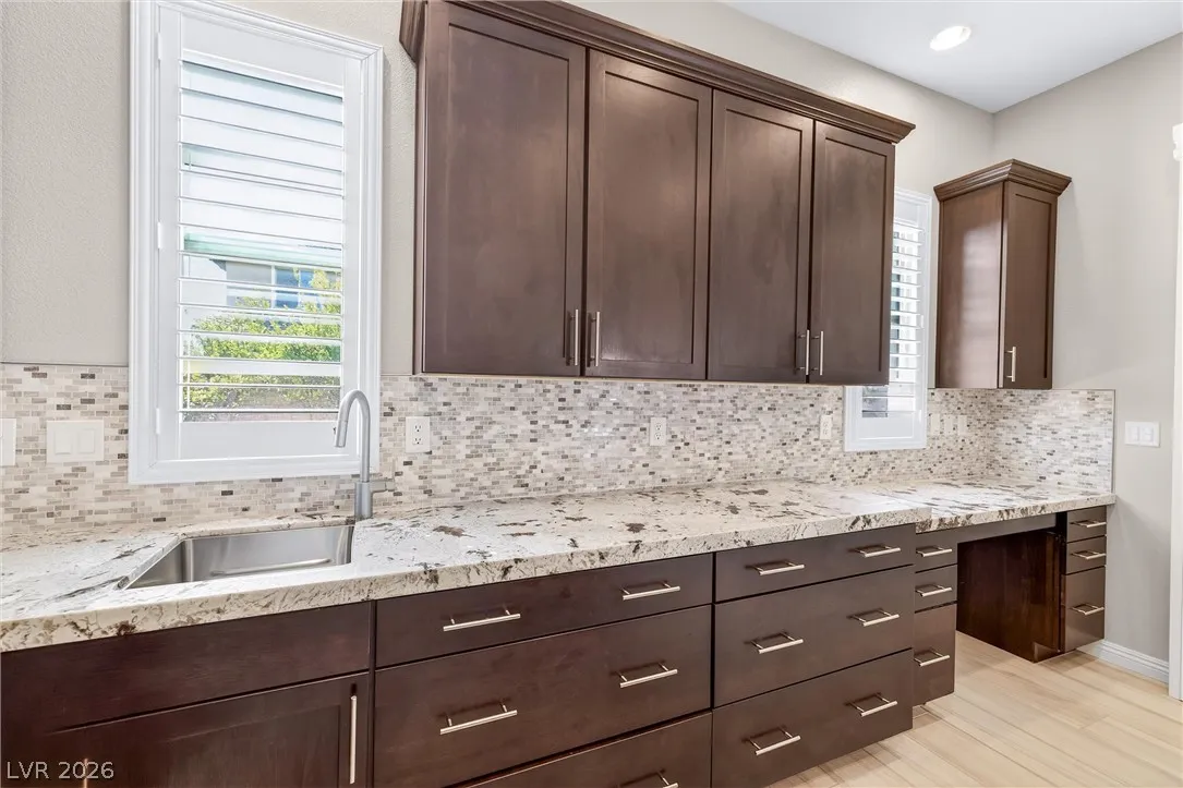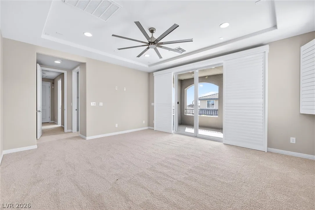 Spacious 5 bedroom, 4 bathroom home situated on a cul-de-sac with a 3-car garage and private courtyard entry. The kitchen showcases stainless steel appliances, a brand-new refrigerator, dual sinks, and a statement island, opening to the main living area and covered patio for seamless indoor-outdoor living. One bedroom and a 3/4 bath are located downstairs, ideal for guests or multigenerational living. Upstairs, the primary suite features a private balcony with Strip views, custom closet, and an oversized bathroom with walk-in shower and separate soaking tub. One secondary room is wired for surround sound. All secondary bedrooms include walk-in closets, with one offering an ensuite bath. Oversized laundry room with brand-new washer and dryer. Backyard designed for resort-style living with raised pool and spa, covered Alumawood patio with misting system, BBQ stub, artificial turf, and mature fruit trees.