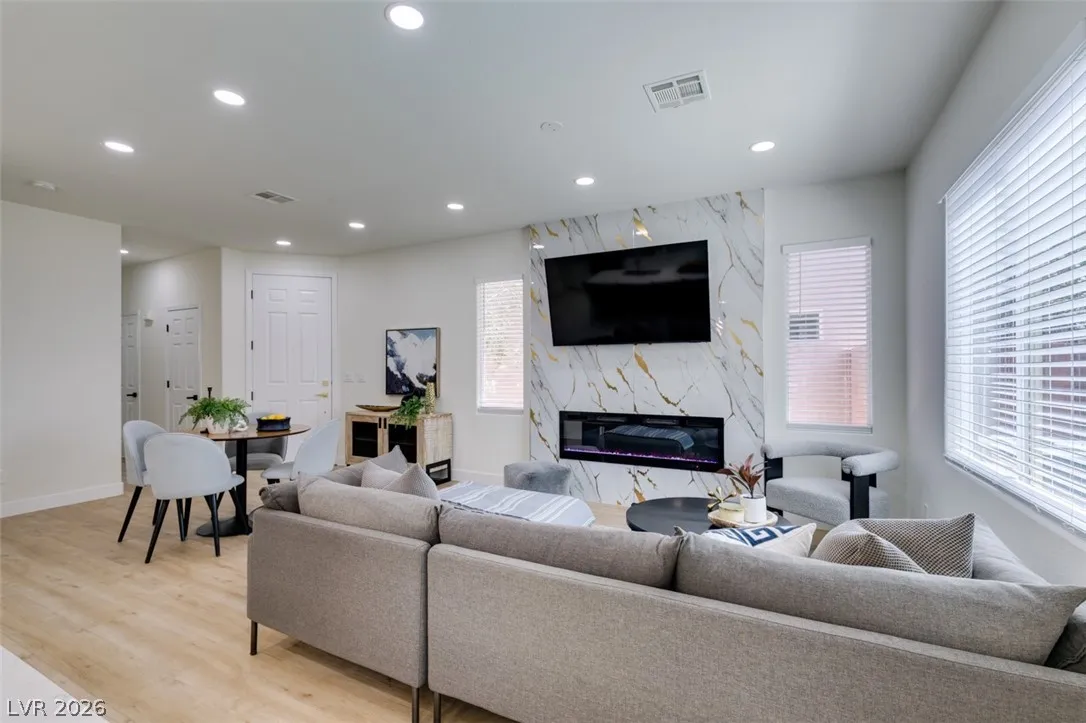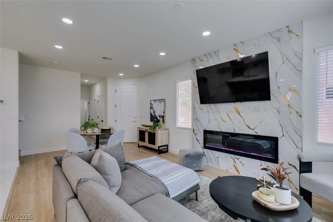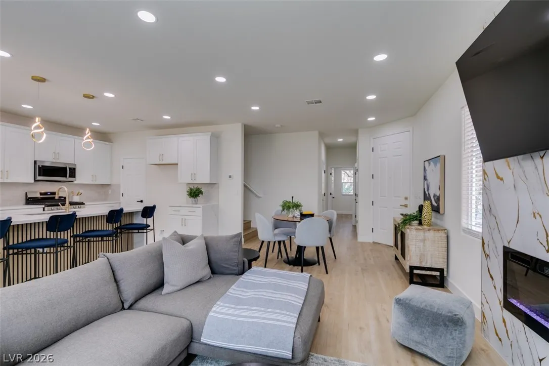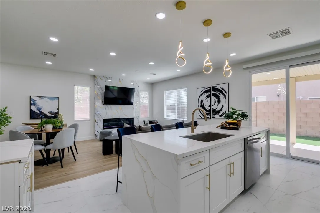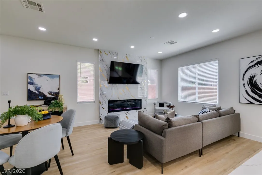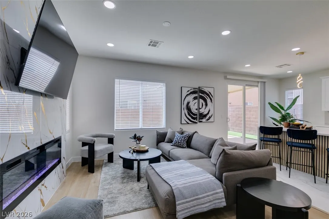 Completely reimagined to feel like a luxury new build, this stunning home features an open-concept layout with a custom fireplace wall, built-in TV, and sleek electric fireplace. Extensive LED recessed lighting and modern fixtures highlight the fully remodeled kitchen, built from the ground up with a large waterfall island, custom cabinetry, and brand-new Samsung stainless steel appliances. Walls have been removed to create a bright, expansive living space. Quartz countertops, marble flooring, 2″ blinds, and modern ceiling fans elevate the interior. The powder room includes a statement wall, and the primary suite showcases a spa-like bath finished floor-to-ceiling in stone, featuring a rain shower, custom glass enclosure, and elegant gold accents. Private backyard with new turf and covered patio—perfect for relaxing or entertaining.