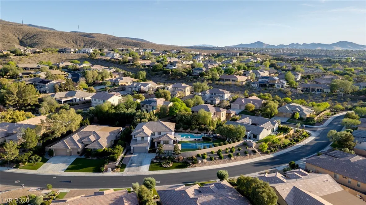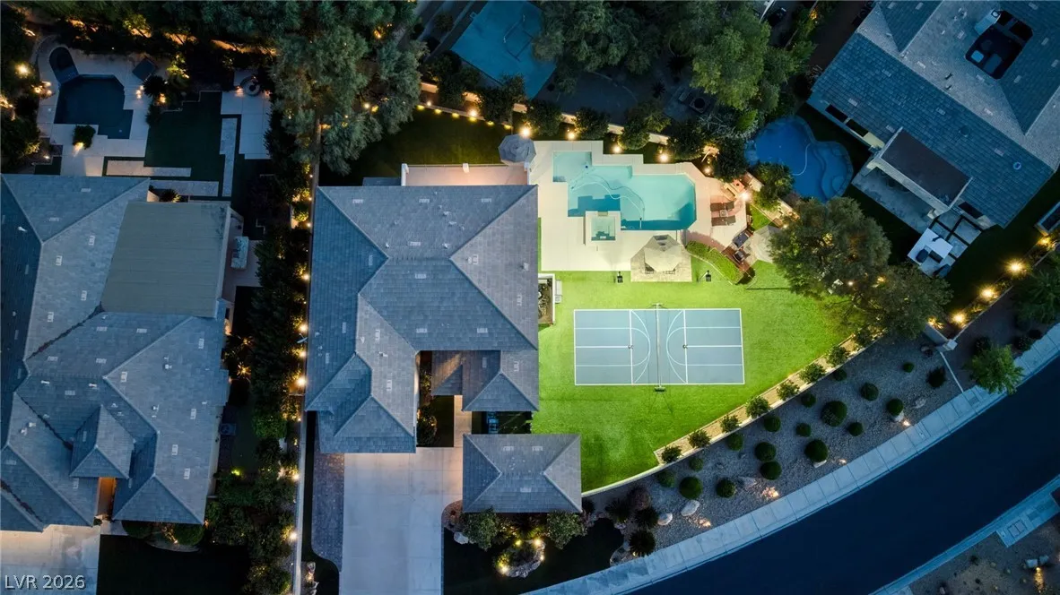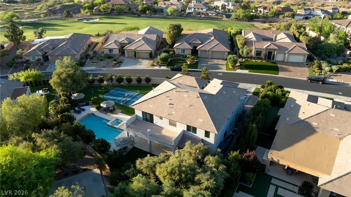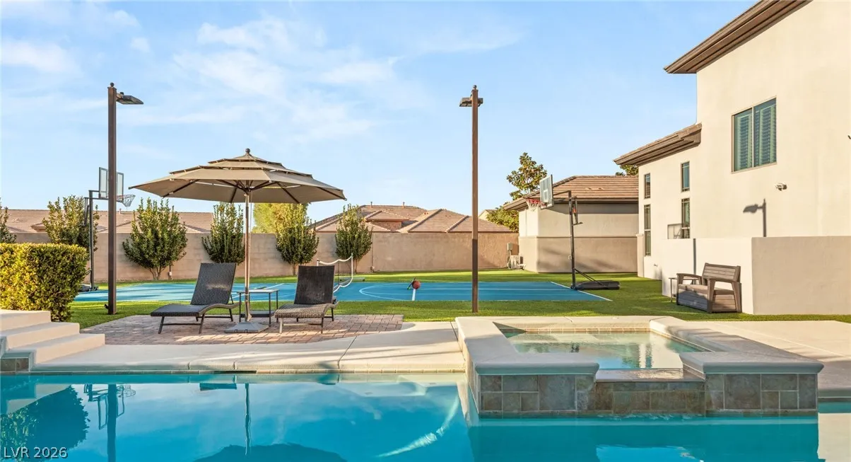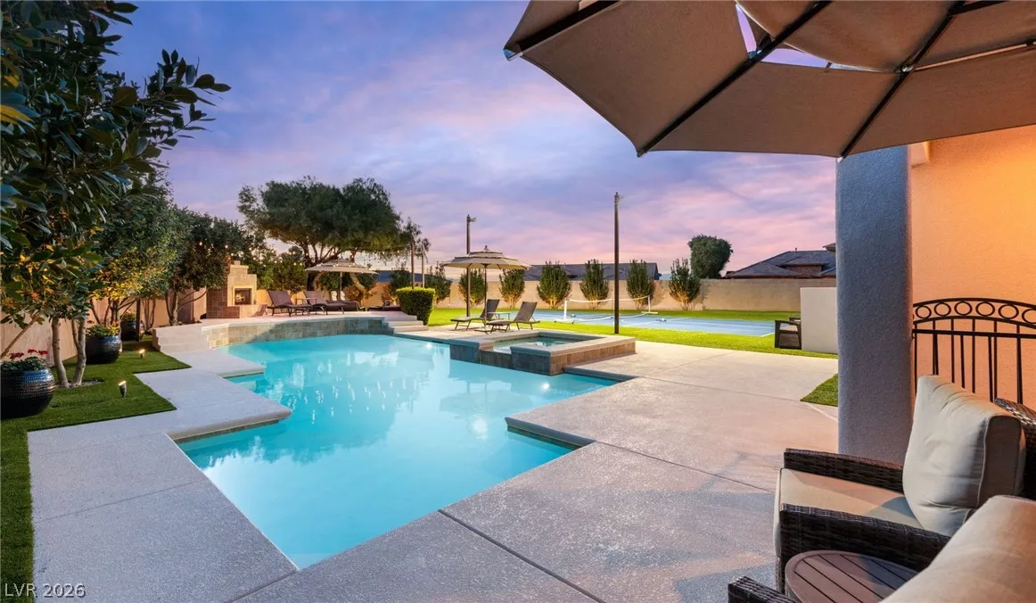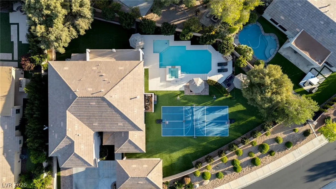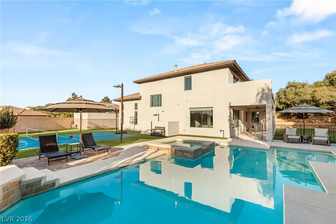 Located in the prestigious guard-gated Anthem Country Club, this exceptional estate at showcases luxury living on an expansive .41-acre pie-shaped lot with a truly private, park-like setting. The resort-style backyard is an entertainer’s dream—featuring a private Pickleball/sports court, heated pool and spa, outdoor fireplace, covered patio, and lush mature landscaping offering ultimate privacy and incredible curb appeal. Spanning approximately 4,000 square feet, this impeccably maintained residence offers 5 bedrooms +den +loft, 4.5 bathrooms, and a 3-car garage with air conditioning. The beautifully renovated kitchen is the heart of the home, complemented by porcelain wood-look flooring throughout and refined finishes at every turn. The primary suite is a true retreat, featuring a modernized spa-inspired bathroom and a private balcony with breathtaking Strip views. A rare opportunity to own a unmatched indoor-outdoor living in one of Henderson’s most sought-after communities.