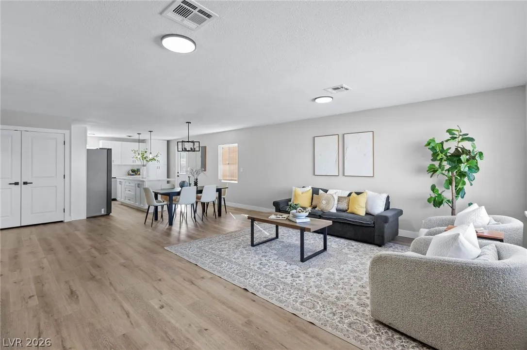 Welcome to this beautifully fully remodeled Henderson gem! This 3-bedroom home has been thoughtfully updated from top to bottom, featuring brand-new LVP flooring, a completely renovated kitchen, and an updated bathroom, all wrapped in fresh modern paint throughout. The wide open-concept living, dining, and kitchen area creates an inviting space perfect for everyday living and entertaining. The stunning