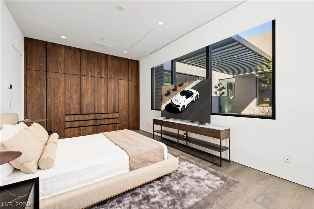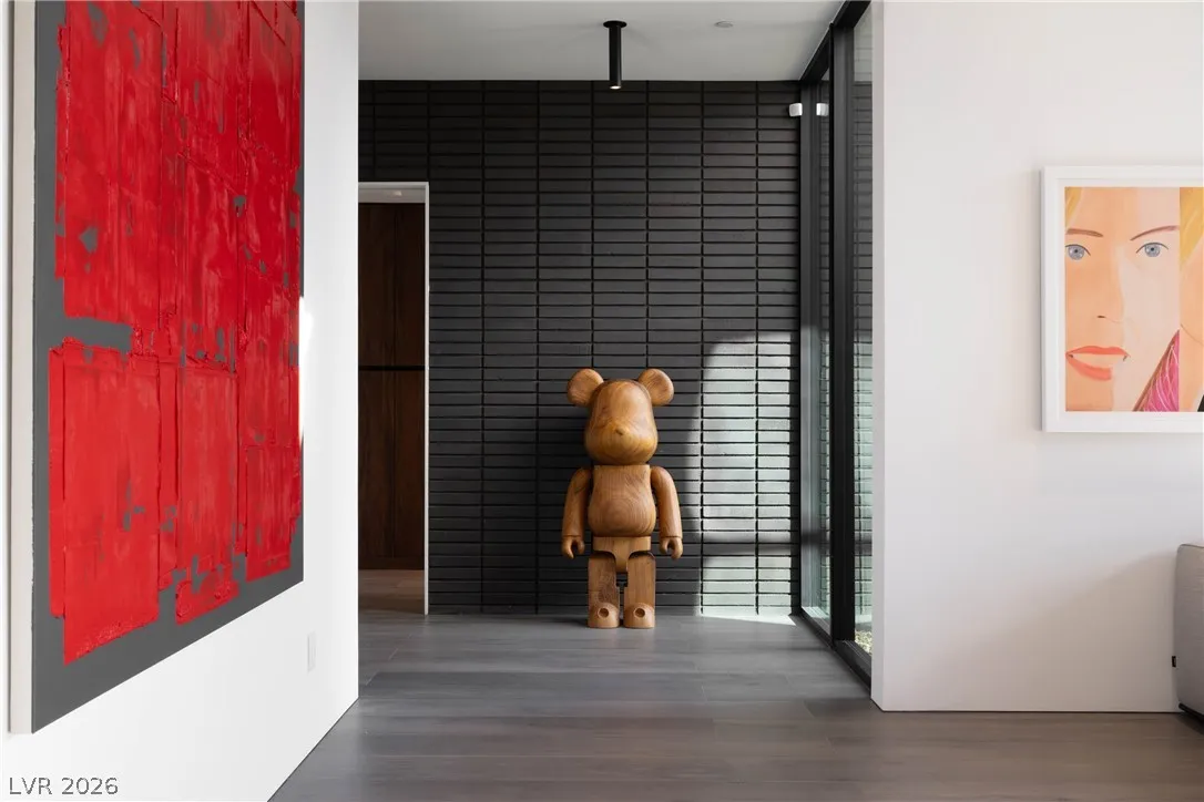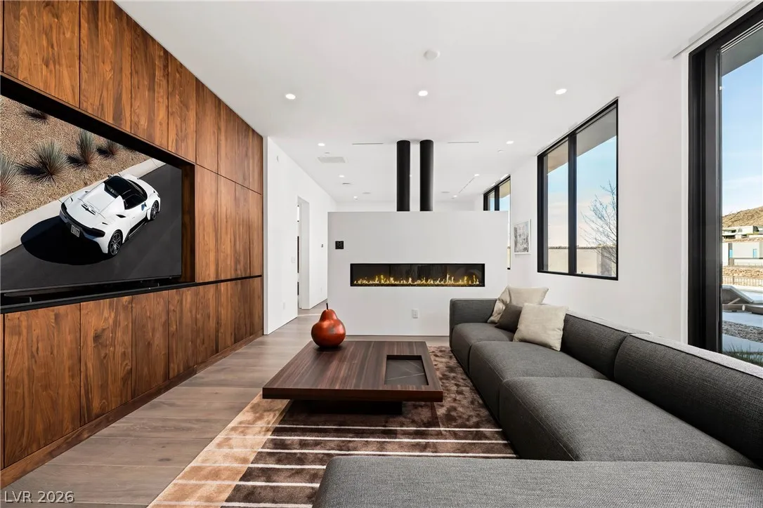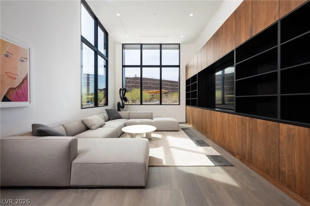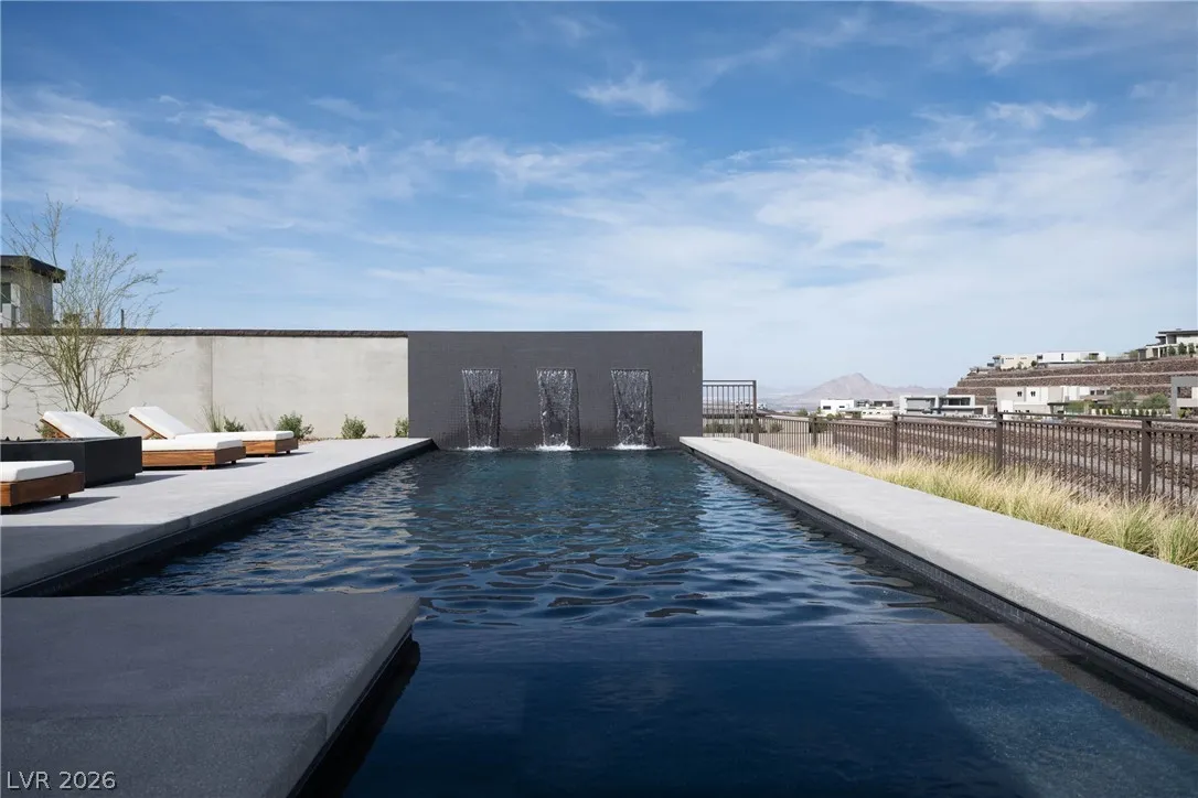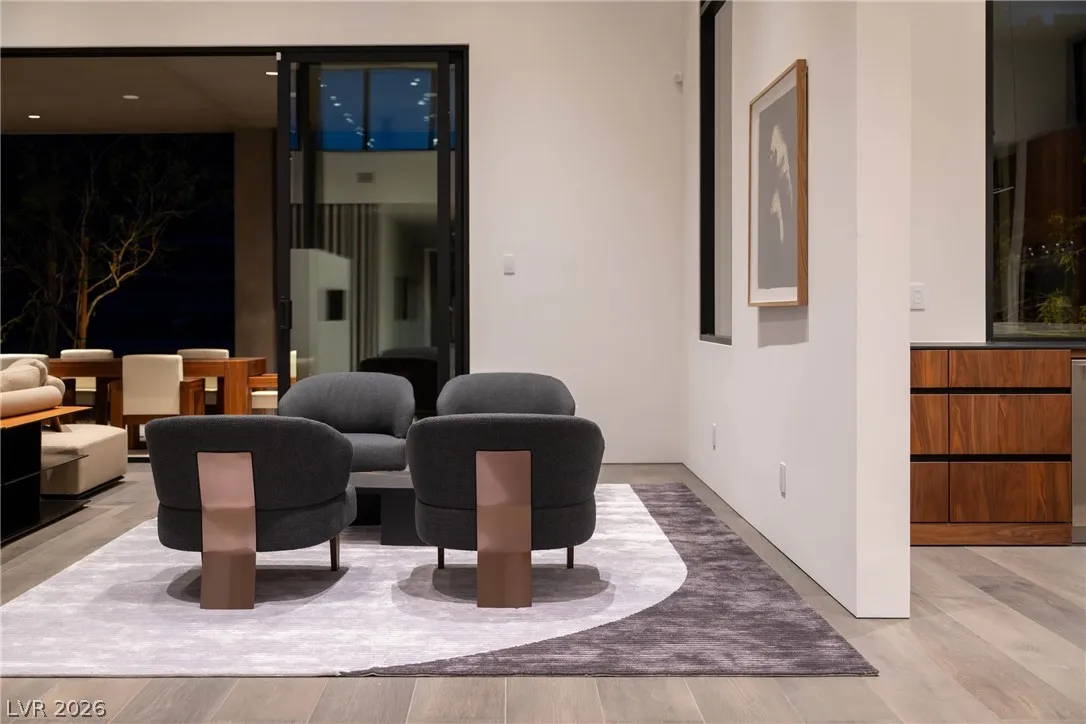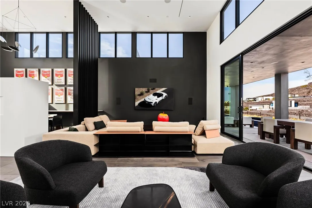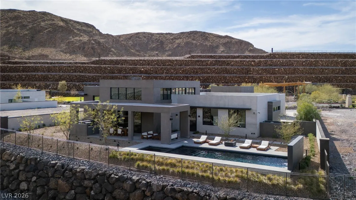 Located in Henderson’s most exclusive community, Ascaya, this newly completed custom residence expresses modern minimalist architecture through precision, proportion, and restraint. Clean lines, expansive glass, and seamless zero-threshold tile define interiors anchored by an 18-foot great room ceiling and dramatic gallery-like hallways designed for art display. Trimless doors, solid walnut cabinetry, flush vents, and Savant home automation create a refined, uninterrupted aesthetic. The kitchen features Sub-Zero and Wolf appliances, an extended quartzite island, and a separate entertaining bar. The expansive primary suite includes a private lounge and fireplace. Outdoors, a resort-style pool and spa with water features, fire pit, and outdoor kitchen create a private retreat. Custom furniture and curated art were designed specifically for the home. 5,601 sq ft, 4 bed, 5 bath, single level with climate-controlled four-car garage, located across from Ascaya’s family park.