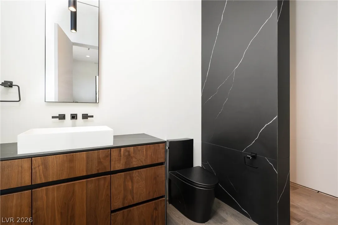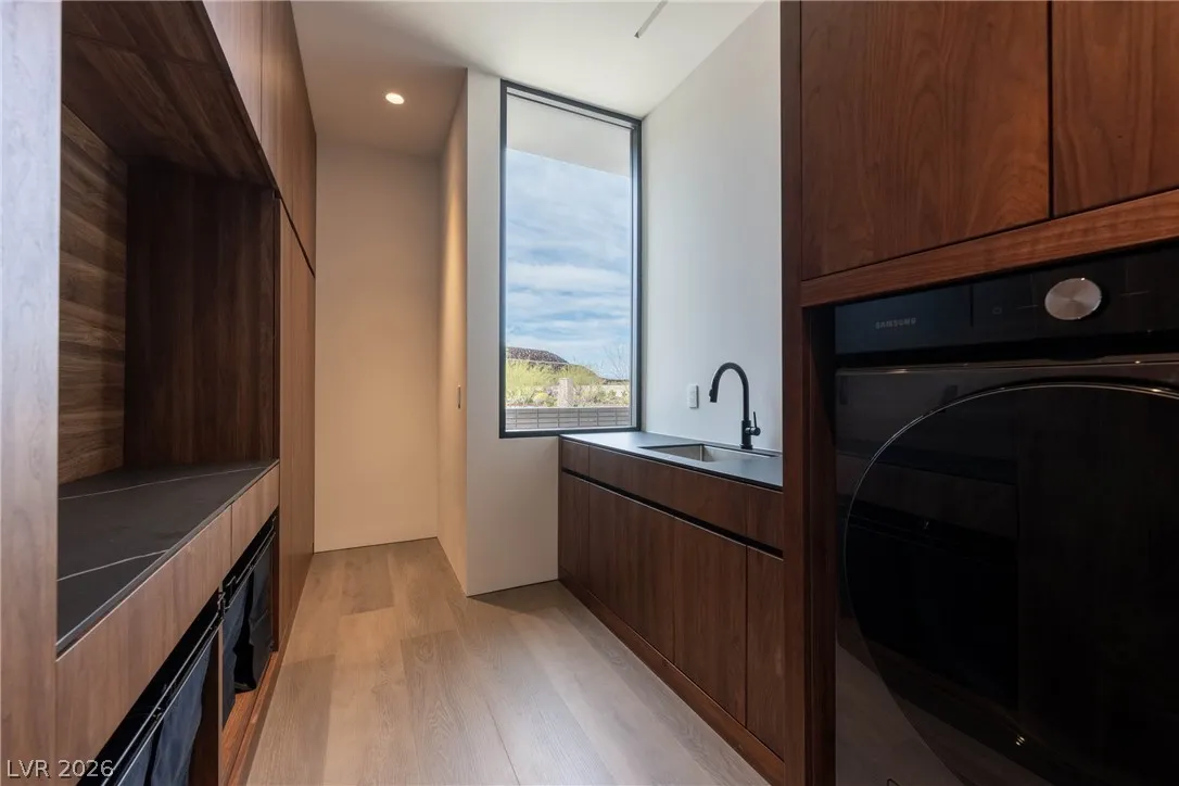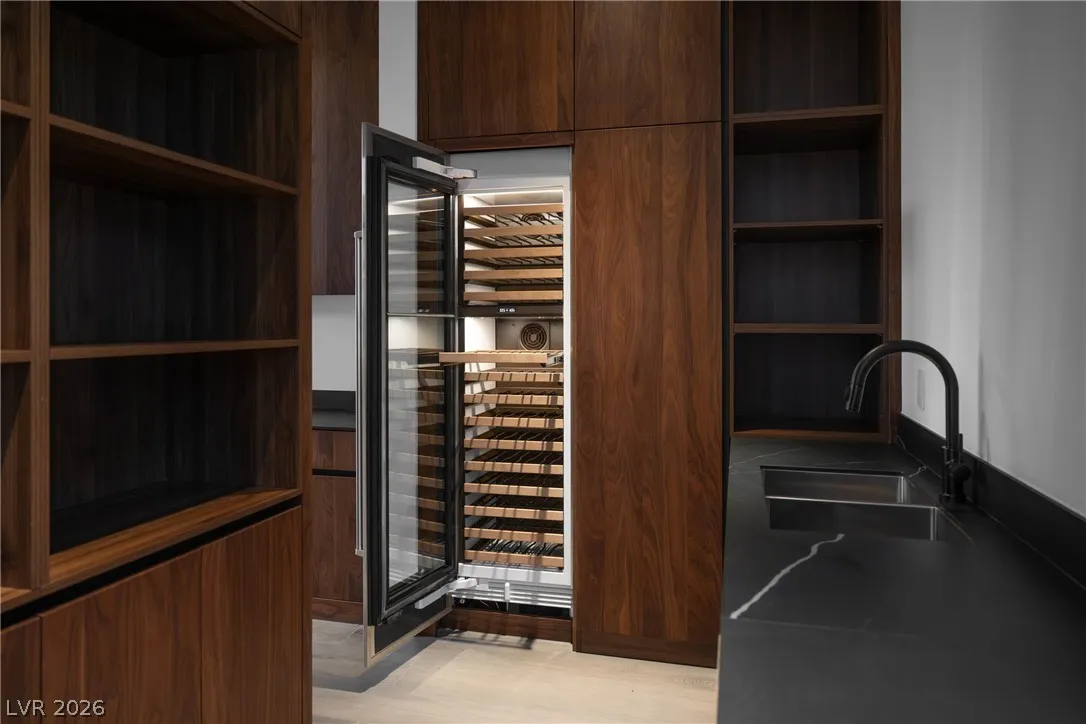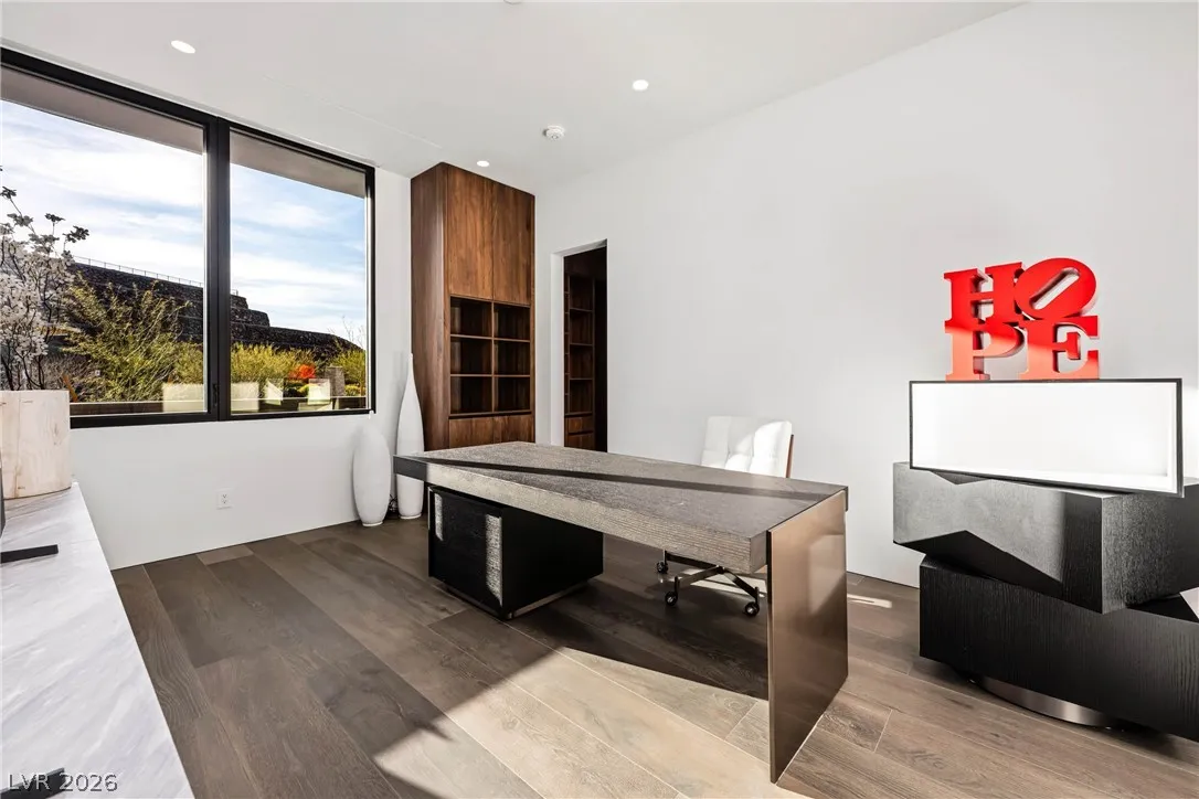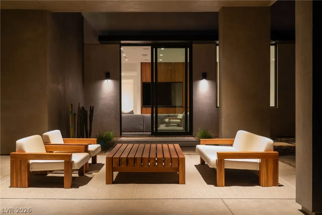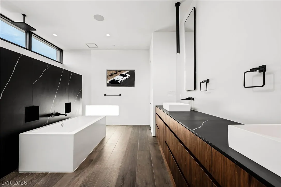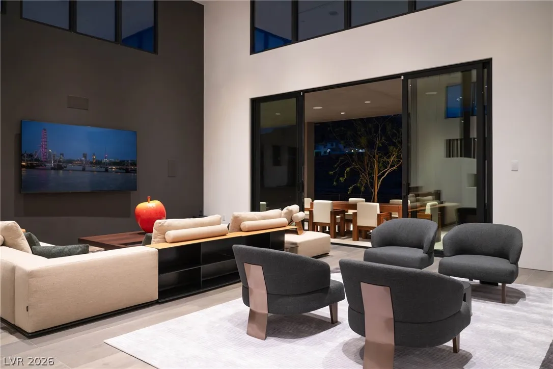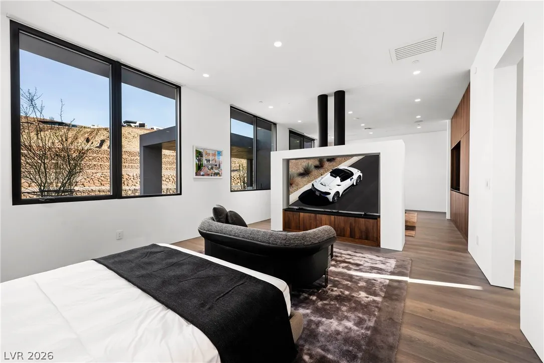 Located in Henderson’s most exclusive community, Ascaya, this newly completed custom residence expresses modern minimalist architecture through precision, proportion, and restraint. Clean lines, expansive glass, and seamless zero-threshold tile define interiors anchored by an 18-foot great room ceiling and dramatic gallery-like hallways designed for art display. Trimless doors, solid walnut cabinetry, flush vents, and Savant home automation create a refined, uninterrupted aesthetic. The kitchen features Sub-Zero and Wolf appliances, an extended quartzite island, and a separate entertaining bar. The expansive primary suite includes a private lounge and fireplace. Outdoors, a resort-style pool and spa with water features, fire pit, and outdoor kitchen create a private retreat. Custom furniture and curated art were designed specifically for the home. 5,601 sq ft, 4 bed, 5 bath, single level with climate-controlled four-car garage, located across from Ascaya’s family park.
