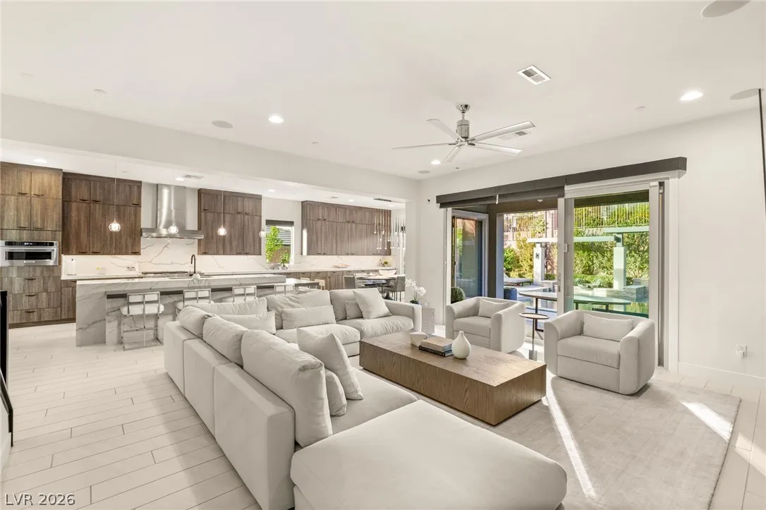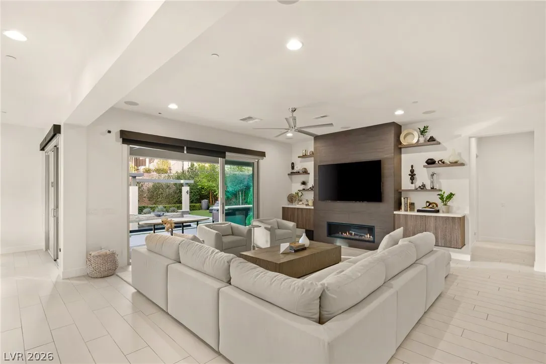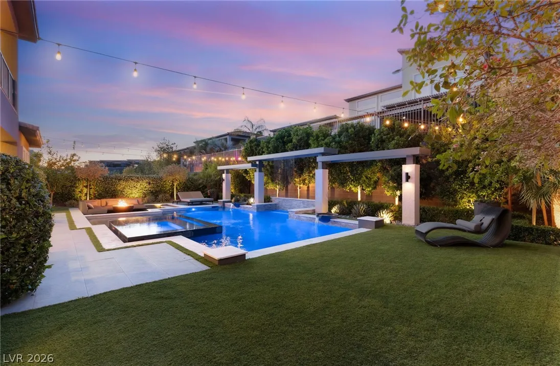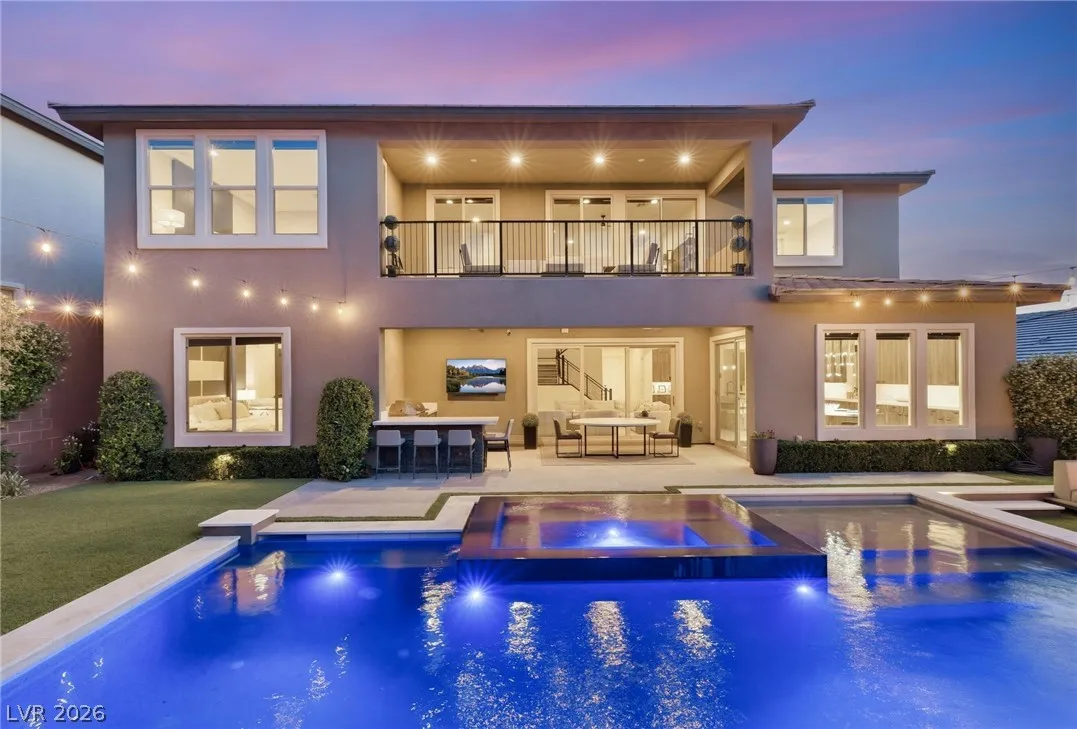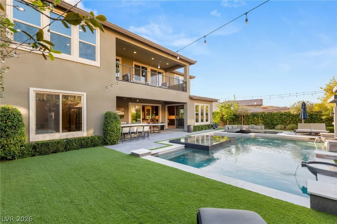 Model-level finishes and resort-caliber outdoor living define this exceptional residence. Designed with intention, the home features a true culinary kitchen with a professional KitchenAid range, built-in refrigerator, custom cabinetry, and premium Ferguson lighting throughout. The gathering room offers a statement fireplace with built-in media center, while a spacious loft and primary suite share a private balcony that elevates indoor-outdoor living. The primary retreat includes a sitting room and spa-inspired bath with freestanding tub, oversized custom shower, and California Closets. Enjoy whole-home sound system, smart home integration, automatic and blackout window coverings, new water filtration, and custom garage cabinetry. Outside, a tiled covered patio overlooks a private resort backyard with pool, spa, dramatic rain waterfall, outdoor kitchen, fire pit, mature trees for privacy, and café lighting. Elevated. Intentional. Unforgettable.
