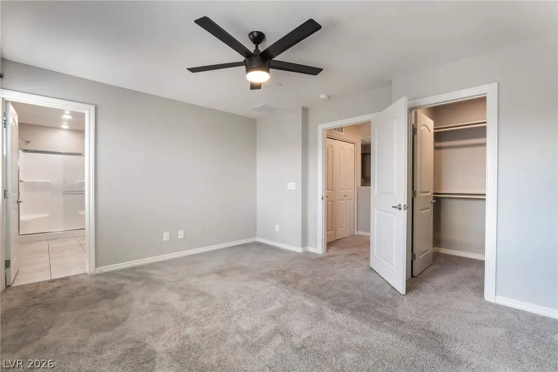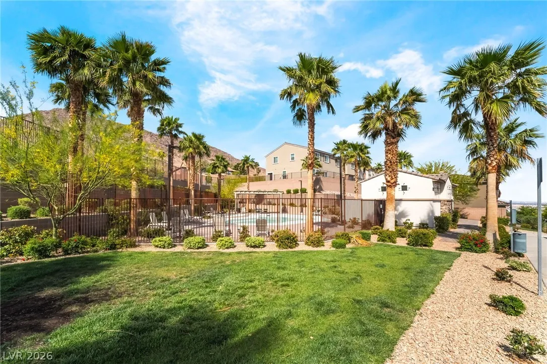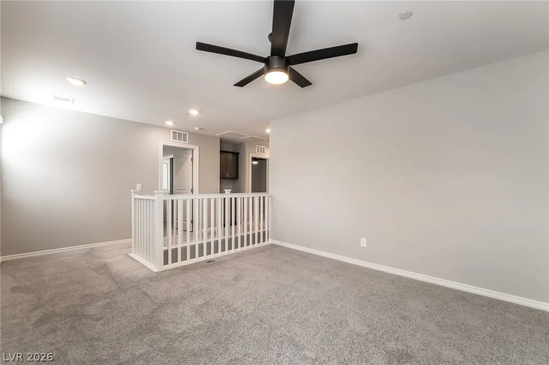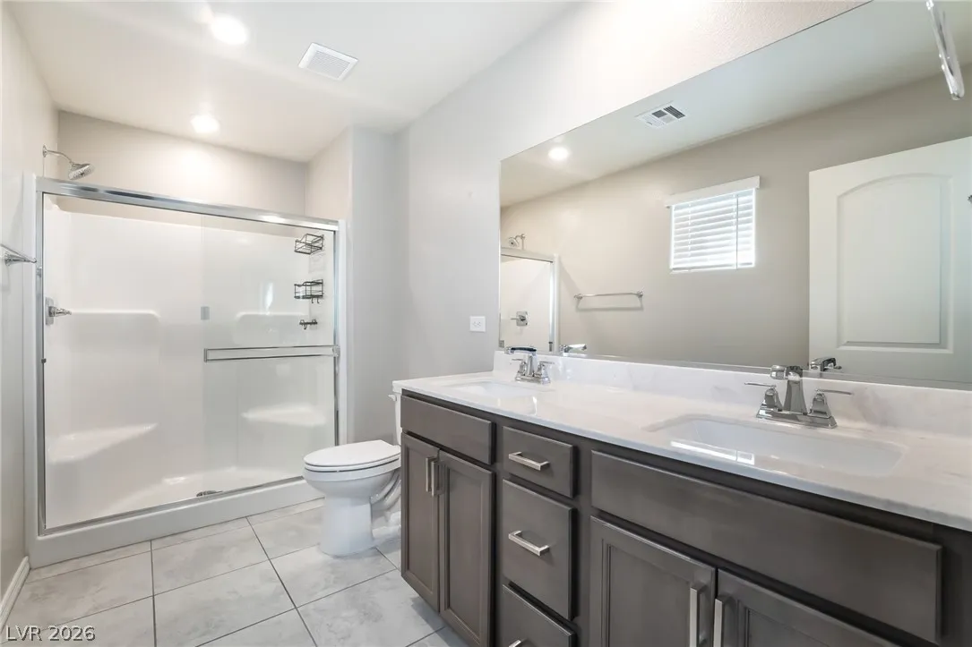 This thoughtfully designed two-story home showcases a modern open-concept layout with tile flooring throughout the main level, creating a cohesive and inviting living space. The kitchen stands out with custom cabinetry, a large island, quartz countertops, and stainless steel appliances, offering both style and functionality for daily living and entertaining. Upstairs features a versatile loft area, ideal for a home office, media space, or additional lounge. The primary suite includes a walk-in closet and a well-appointed ensuite bath with dual sinks and a walk-in shower, while the secondary bedrooms are comfortably sized. The backyard is finished with pavers and artificial turf, providing a clean, low-maintenance outdoor setting.