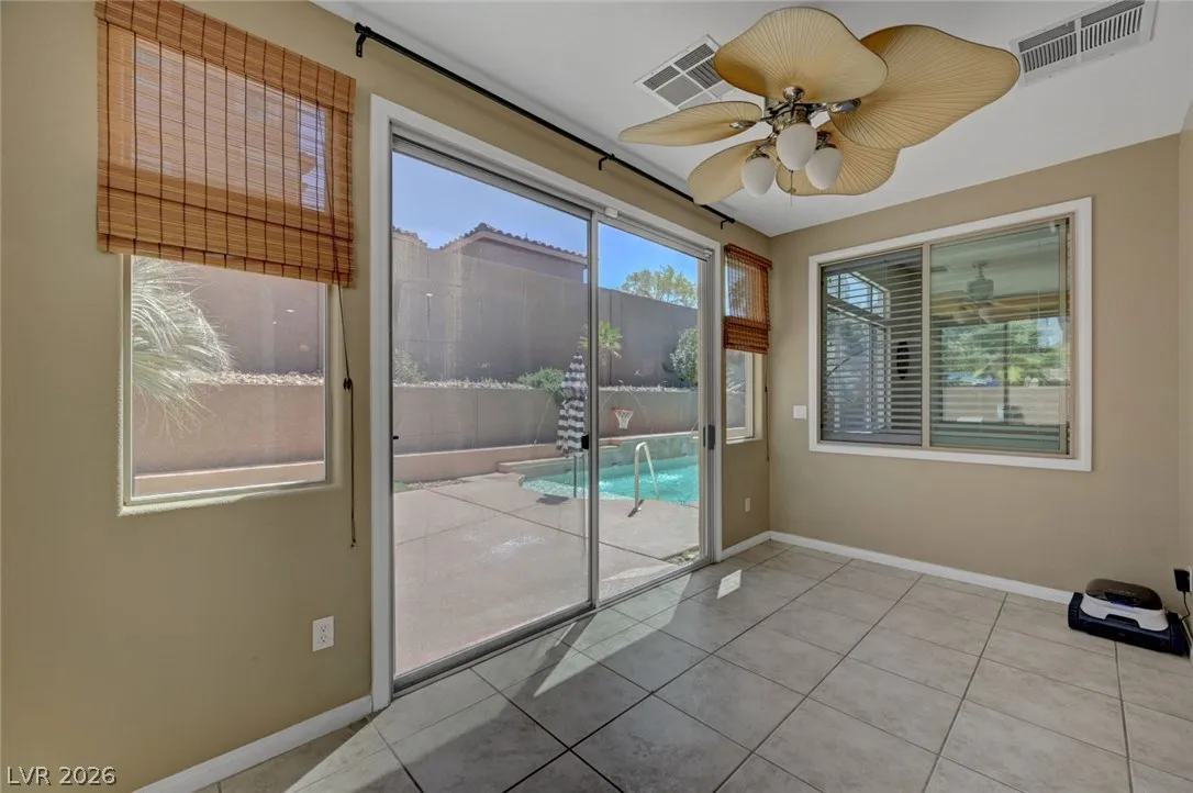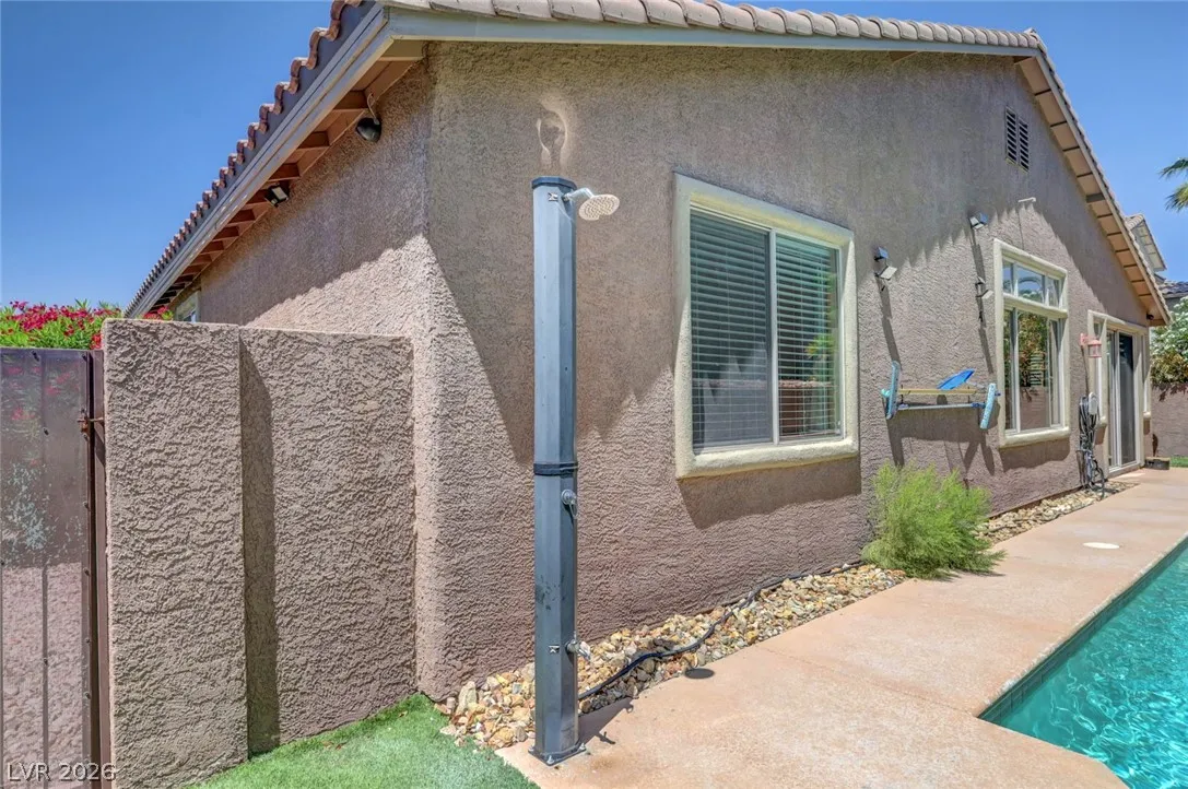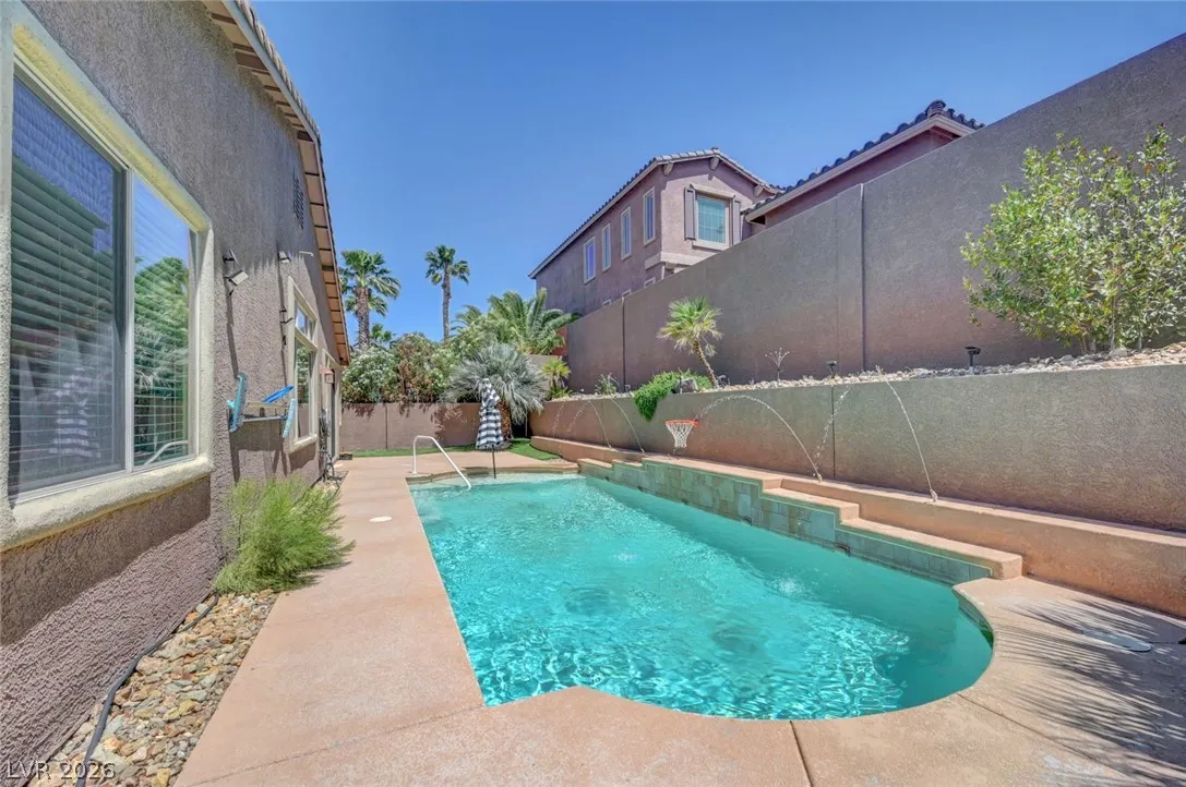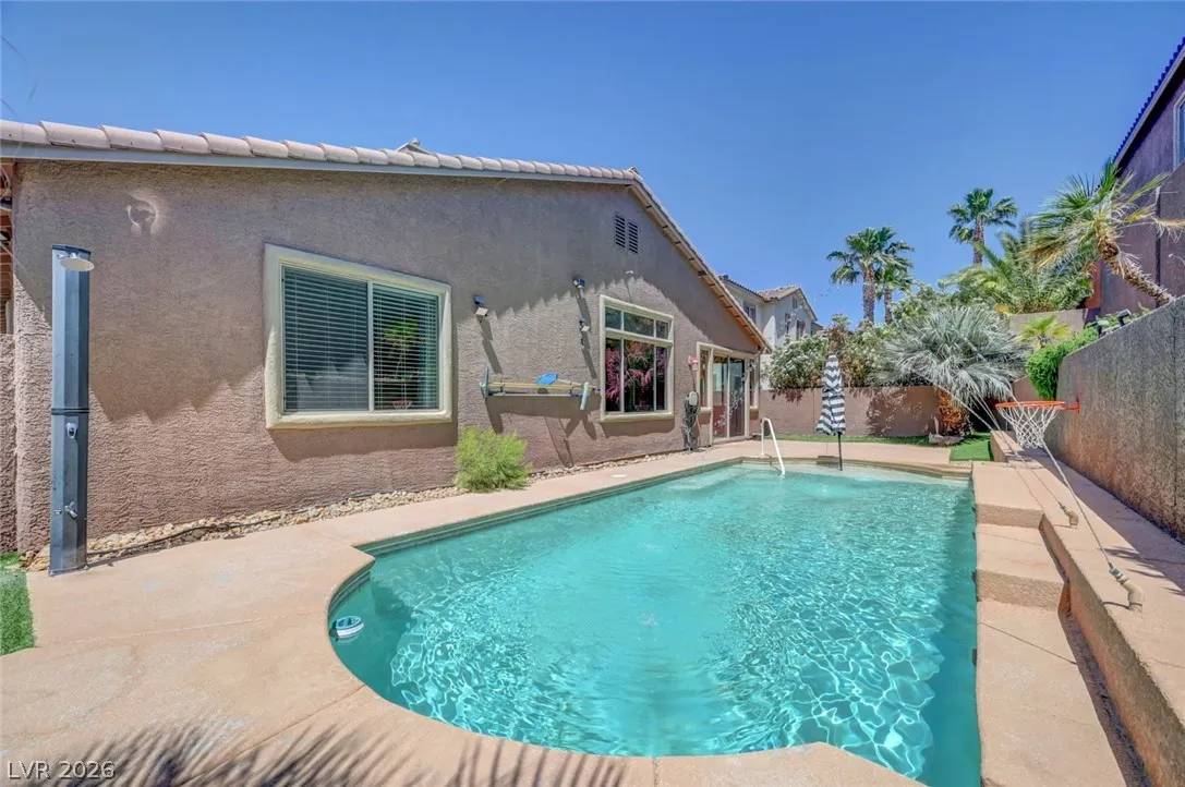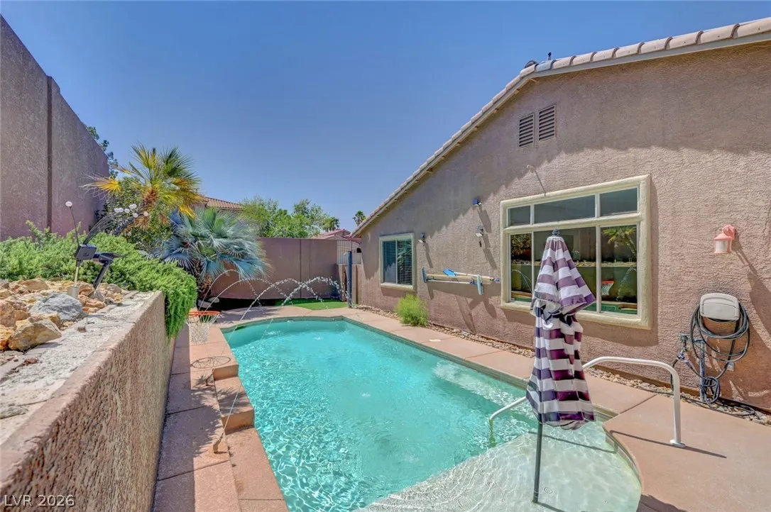 Beautiful single story home on a generous corner lot featuring a spacious open floor plan with vaulted ceilings. This move in ready gem offers a private primary suite, formal dining room, and an inviting living room with custom built-in entertainment center, surround sound, and a cozy fireplace. The large, airy kitchen showcases granite countertops, a center island, abundant cabinetry, and includes all appliances. Enjoy seamless indoor/outdoor living with a 220 sqft sunroom overlooking your backyard oasis – complete with a heated pool, spa jets, waterfall, and solar pool shower, all enhanced by paid off iSwim Solar Heating. Additional highlights include dual AC climate control for year round comfort, EV charging, a peaceful courtyard, and a 3-car garage with 1 car garage separate. Ideally & conveniently located near both schools & Heritage Park, this home reflects true pride of ownership and is perfect for both relaxing and entertaining. A true must see!