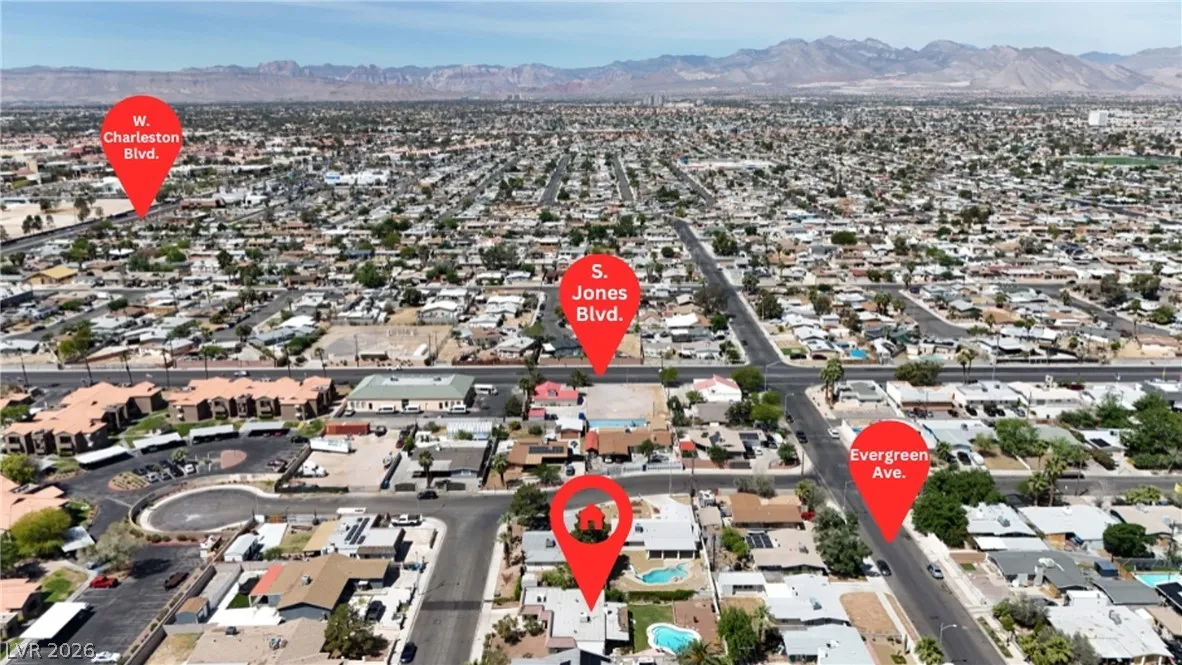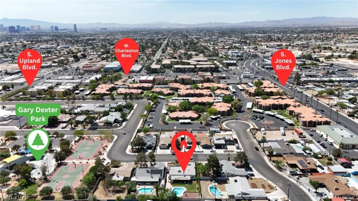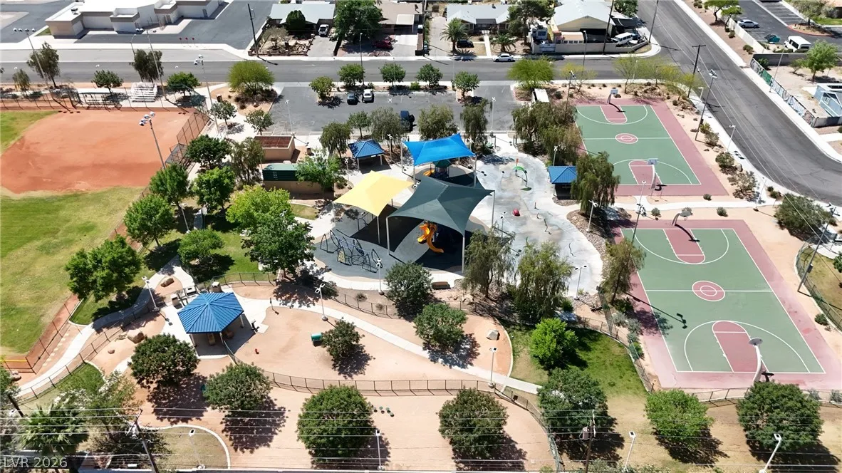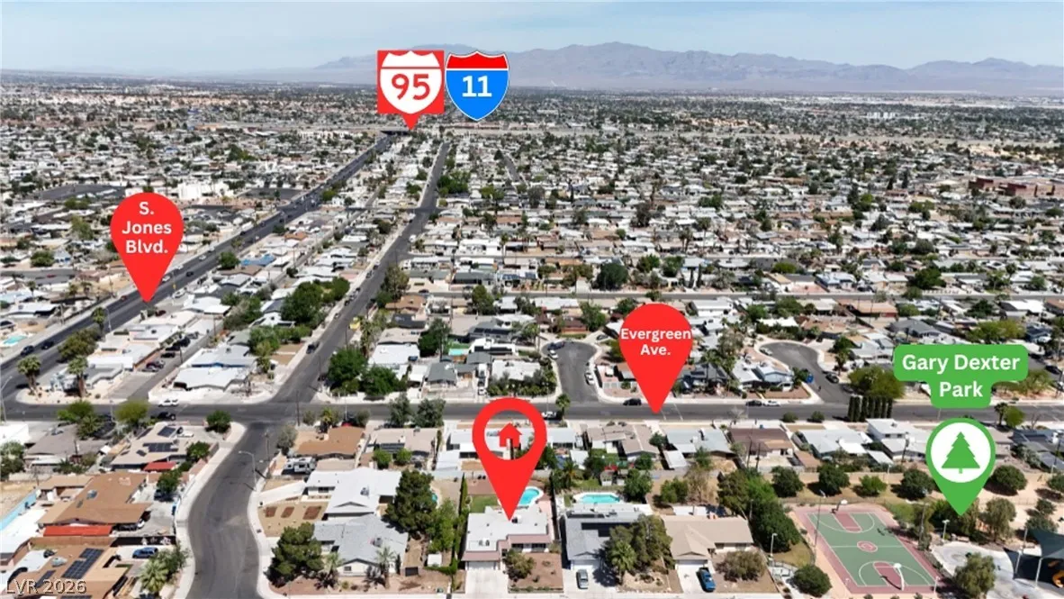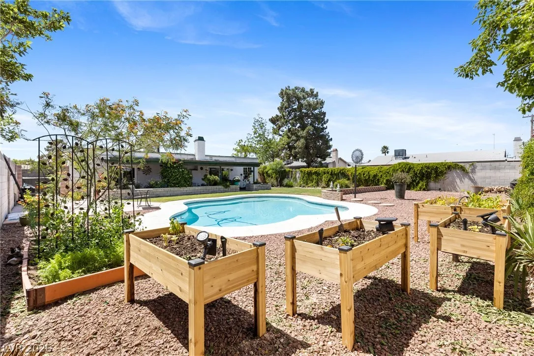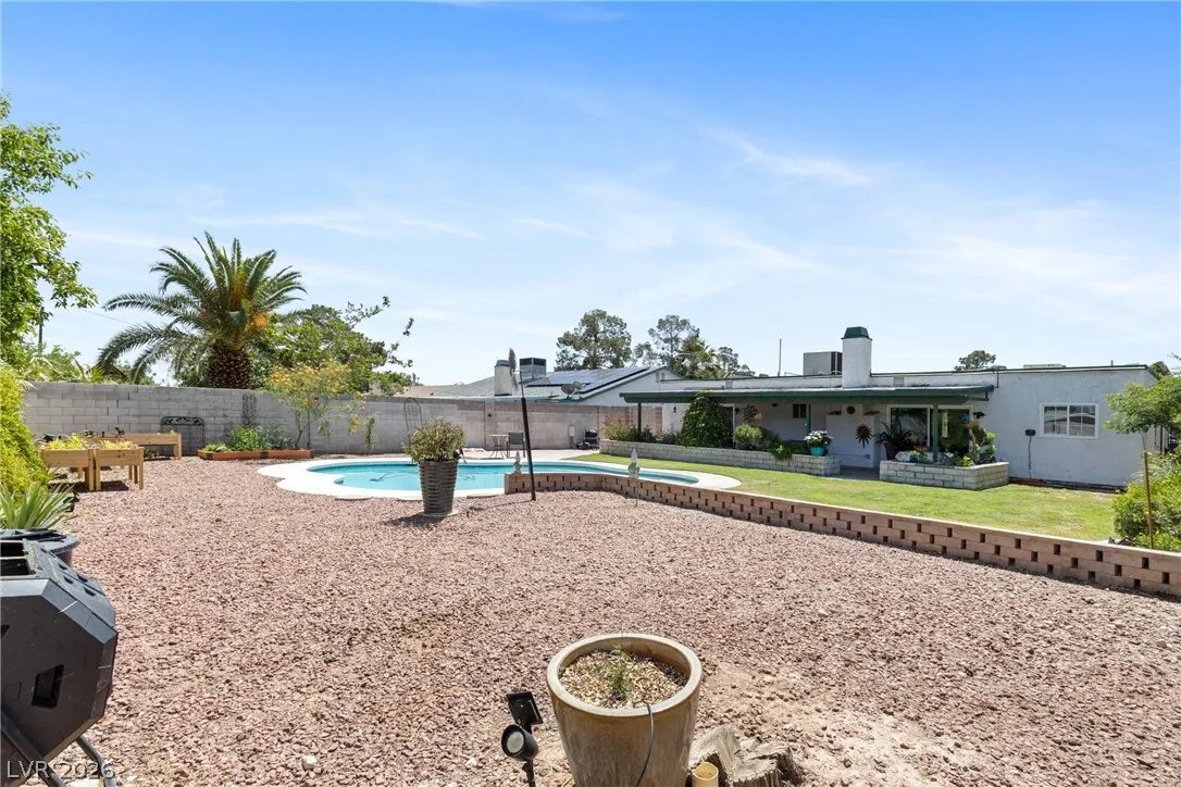 Welcome to this charming single-family residence nestled on a HUGE lot over 9,100 square feet in a sought-after Las Vegas neighborhood with **no HOA**! Perfect for entertaining or relaxing, the expansive backyard boasts a large swimming pool and a spacious covered patio—ideal for enjoying those sunny days. Parts of the exterior of the home is lined with gorgeous mature Bougainvillea. The open floor plan inside seamlessly connects the living areas, creating an inviting atmosphere for gatherings. Featuring 3 bedrooms and 2 bathrooms, the third bedroom is currently styled as an office, offering flexible living options to suit your needs. A safe in the primary closet adds extra convenience and security. Enjoy the ease of a two-car garage and ample parking space. Just down the street, you’ll find a beautiful park with a playground, dog park, basketball courts, and a baseball field. Plus, you’re just minutes from the 95 highway and local amenities. Don’t miss this exceptional opportunity!