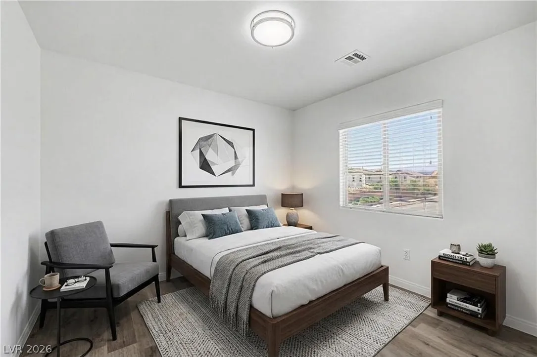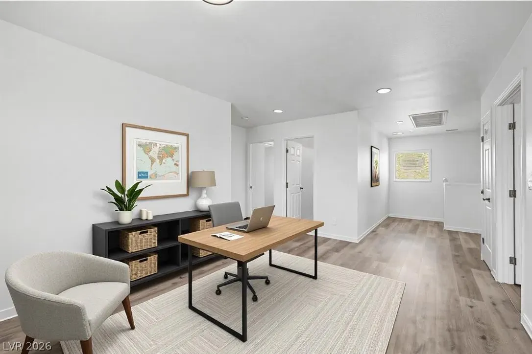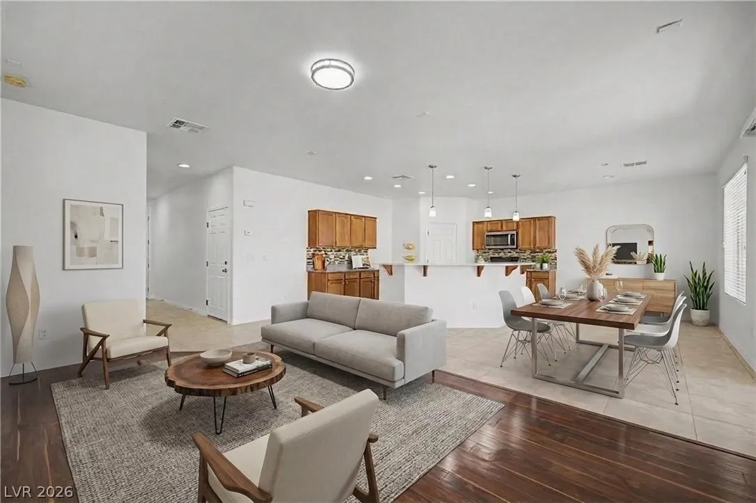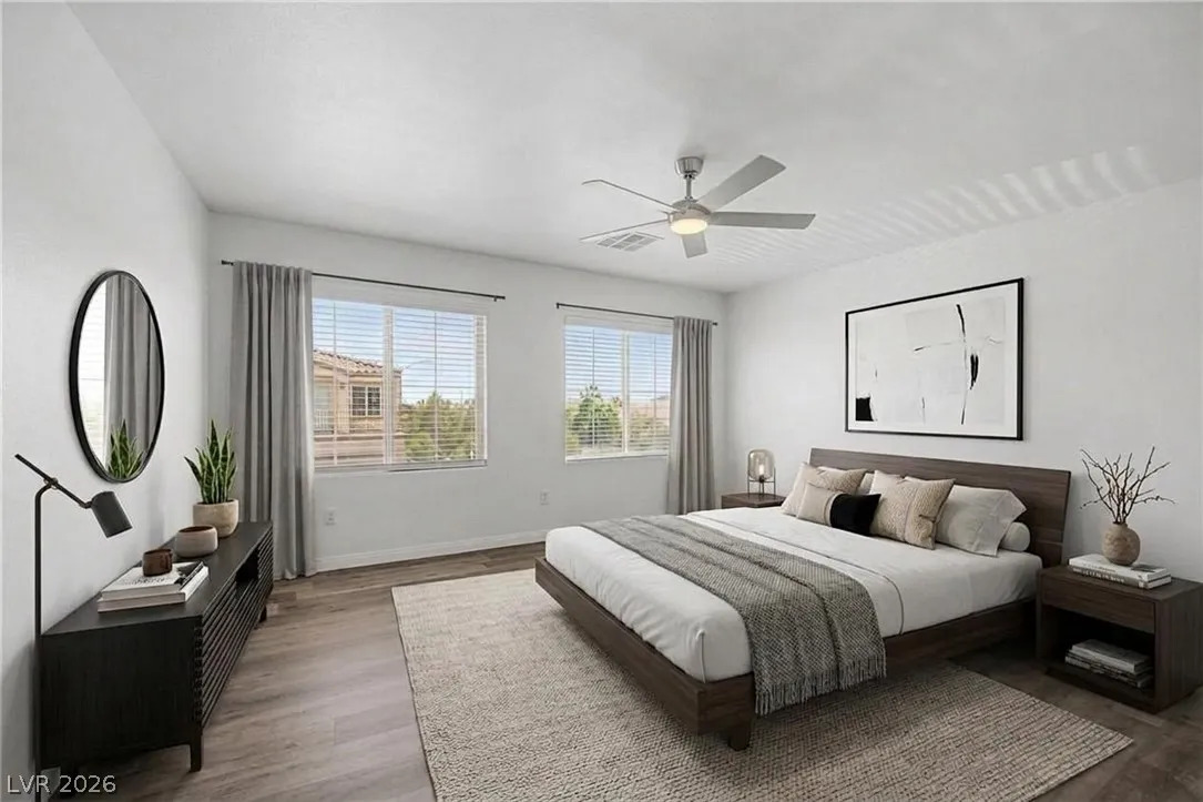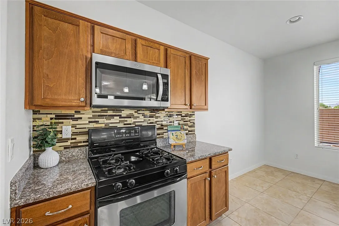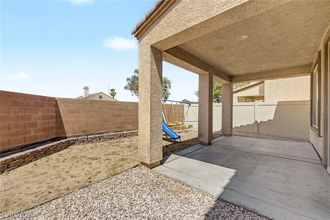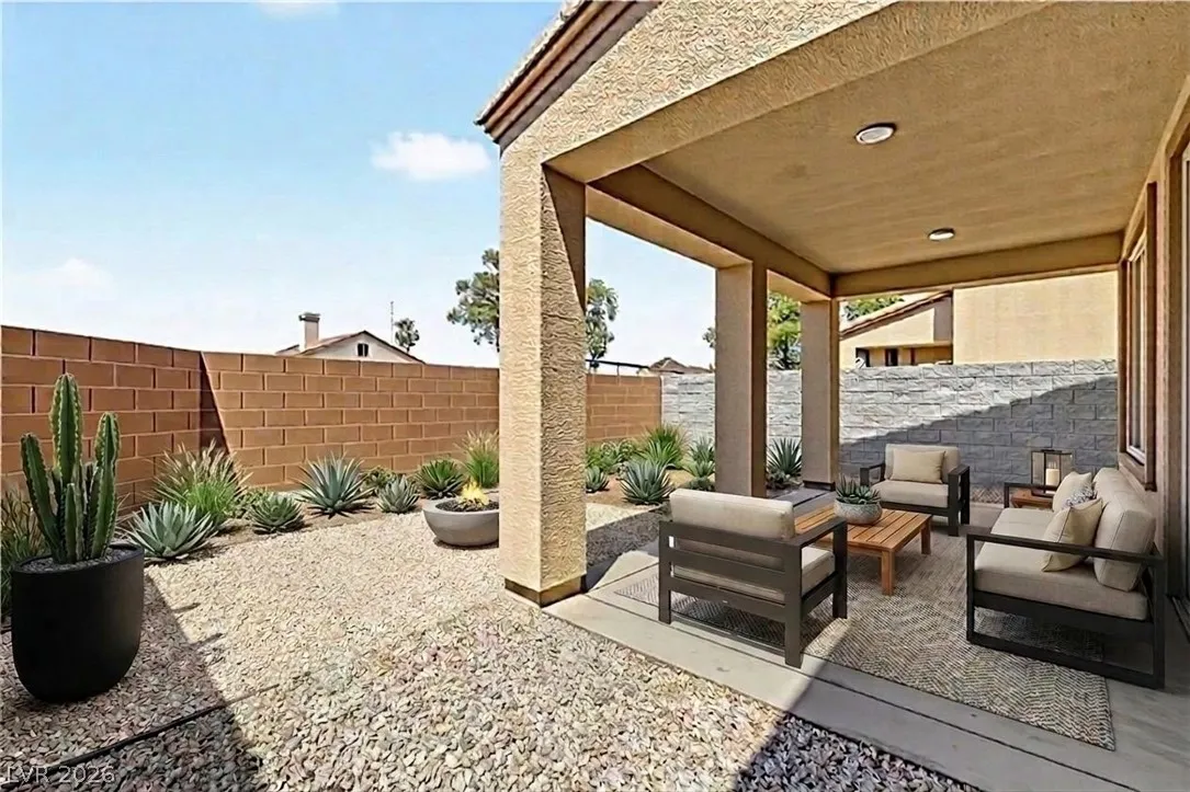 Turnkey 3-bedroom home with a 2-car garage in the desirable Southwest! Light-filled open floor plan with freshly painted interiors and new updated lighting creates a clean, modern feel you will love. No carpet—stylish tile and wood-look flooring throughout, plus ceiling fans and window blinds. Kitchen features granite countertops, stainless steel appliances, pantry, mosaic backsplash, and custom island with breakfast bar. Main level includes chic powder room. Upstairs offers spacious loft ideal for office or media room. Large primary suite with walk-in closet and soaking tub. Private backyard with covered patio and play area. Extra-large driveway fits multiple vehicles and large trucks. Prime Southwest location near 215 Beltway, minutes to airport and Strip, with shopping, dining, and entertainment nearby. Super clean, move-in ready—this one won’t last! Low-maintenance living. Ideal for homeowners or investors alike—schedule your showing today!