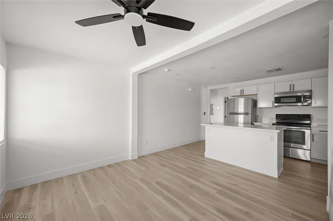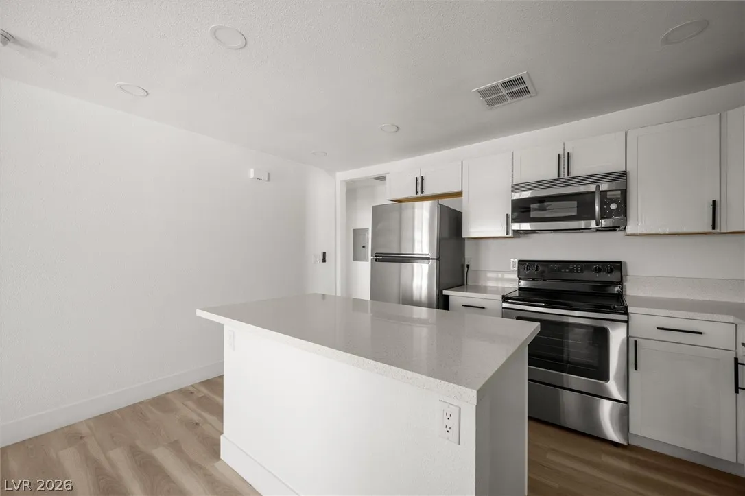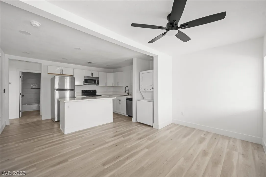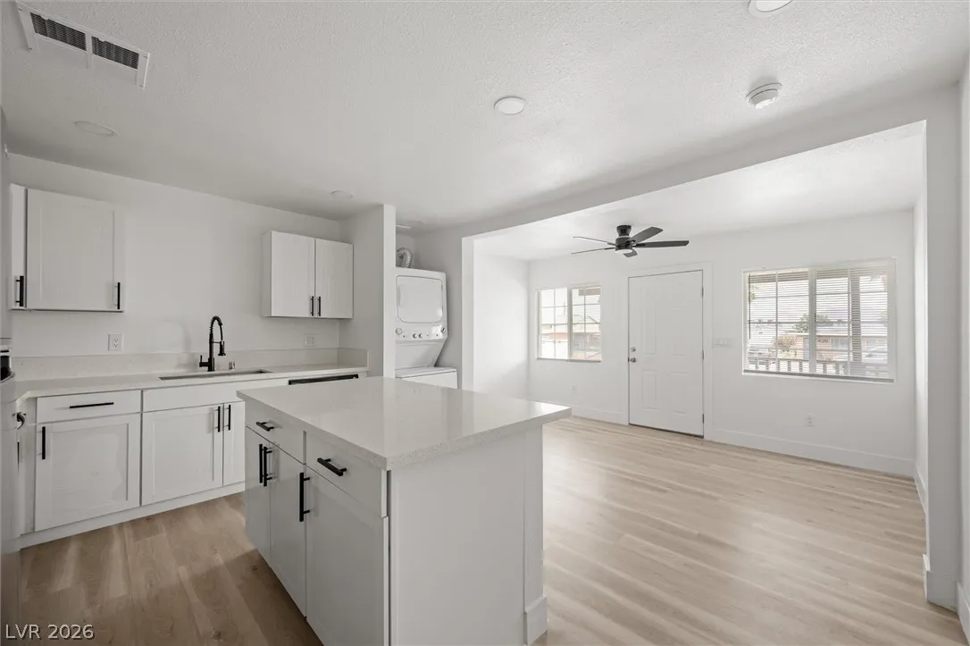 Step inside to an open-concept layout featuring stylish laminate flooring, recessed lighting, and a bright, contemporary feel throughout. The upgraded kitchen is designed to impress with white shaker cabinets, quartz countertops, and stainless steel appliances—including a refrigerator, range, microwave, and in-unit stacked washer & dryer for added convenience. This unit is Appx 800 Sq ft.