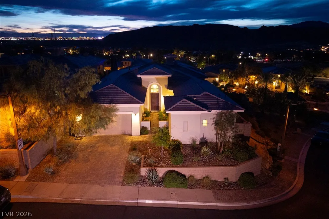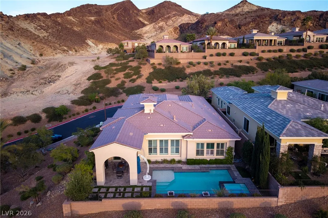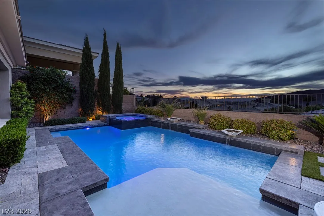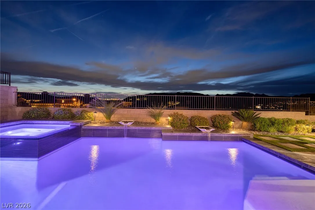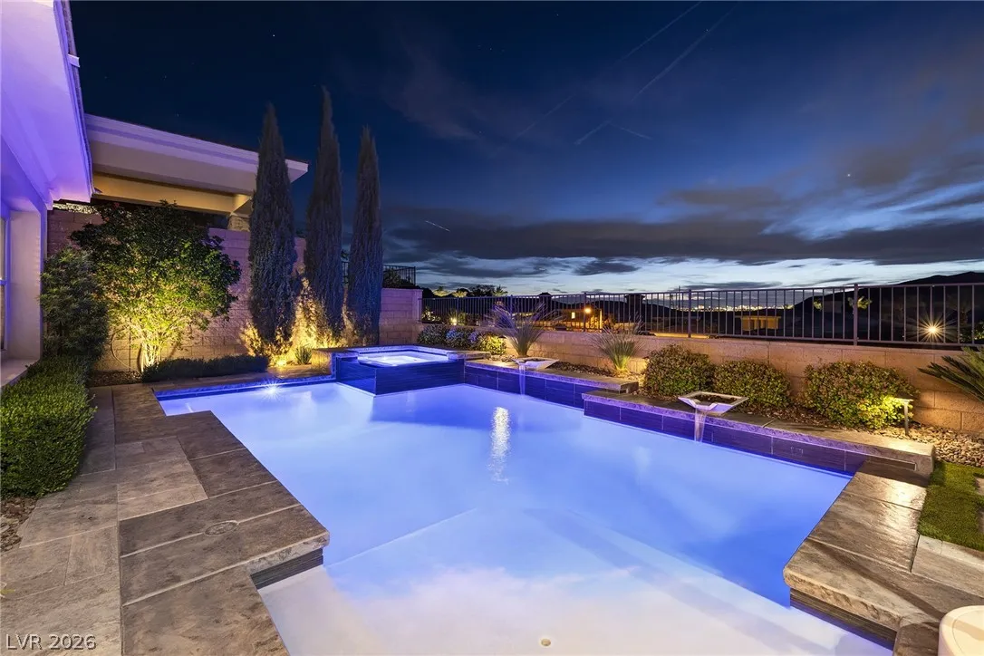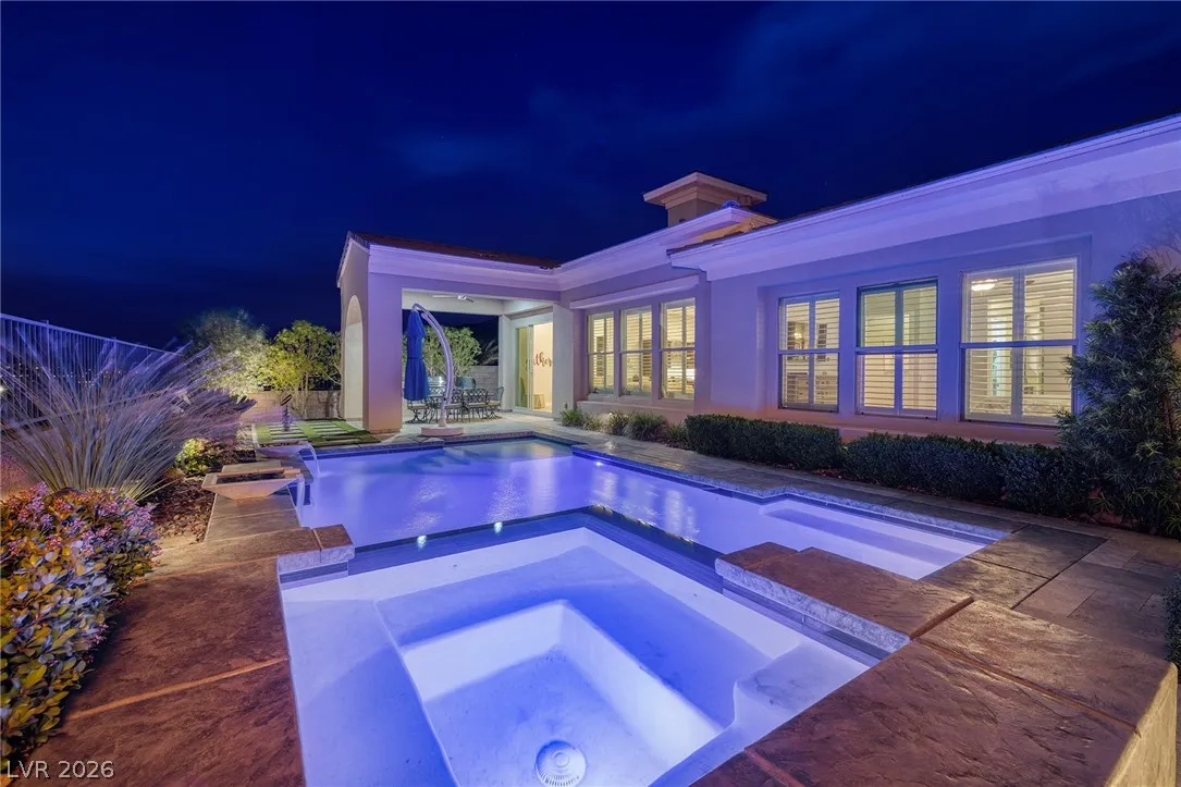 Experience modern luxury in this single-story contemporary highly upgraded home with breathtaking views. High ceilings and well-lit open spaces fill the home. The elegant finishes make this a gem in LLV’s Monte Lucca 49-home boutique neighborhood. Recessed lighting, tile flooring and designer tile surrounding the fireplace create a welcoming ambiance. The well-appointed kitchen’s fine cabinetry sets the stage for stainless-steel appliances including built in double ovens and microwave. The granite waterfall island make it a perfect environment for entertaining. Relish in a spectacular master suite, with spa bathroom, sitting area, and walk-in closet. The backyard sanctuary has a patio cover, outstanding pool & spa is a beautiful water feature. Includes walk-in pantry, laundry room, garages feature 4’ extended size and a $25,000 Sports Club membership provided by Gene Northup at close!