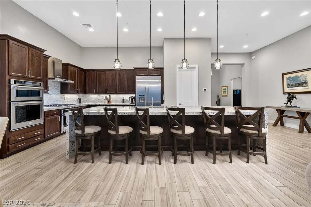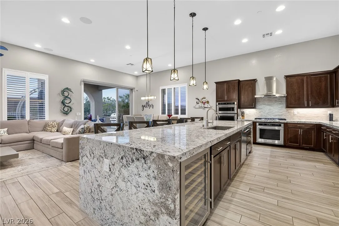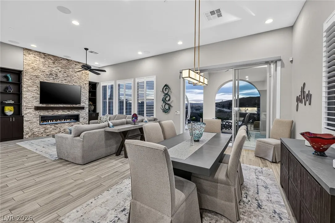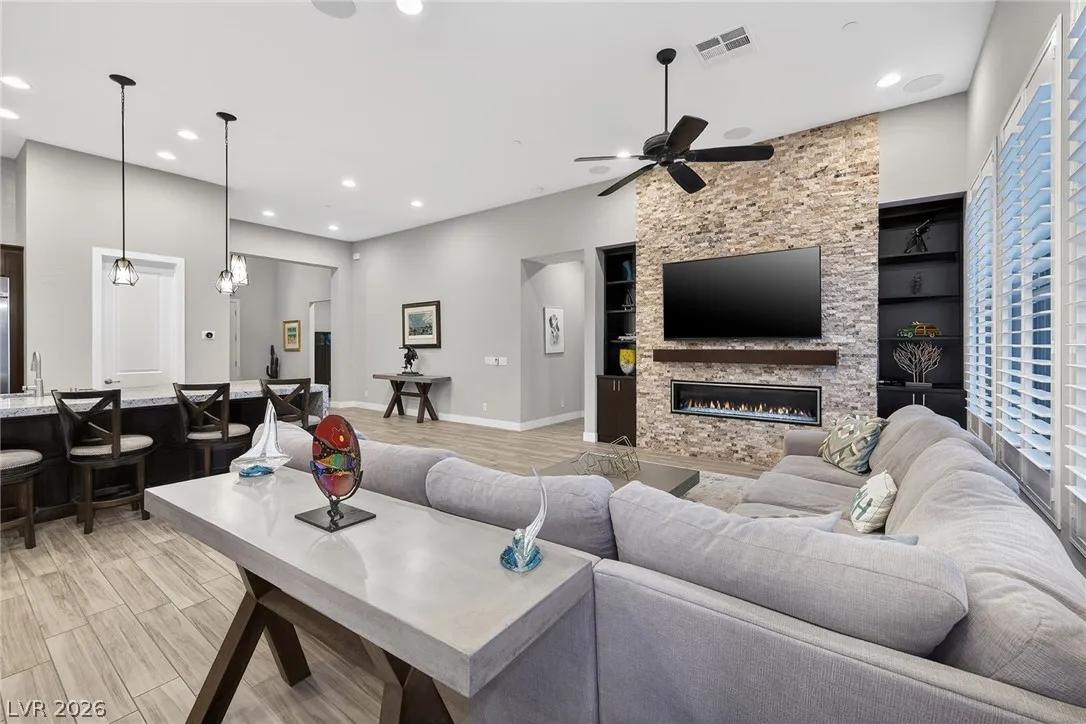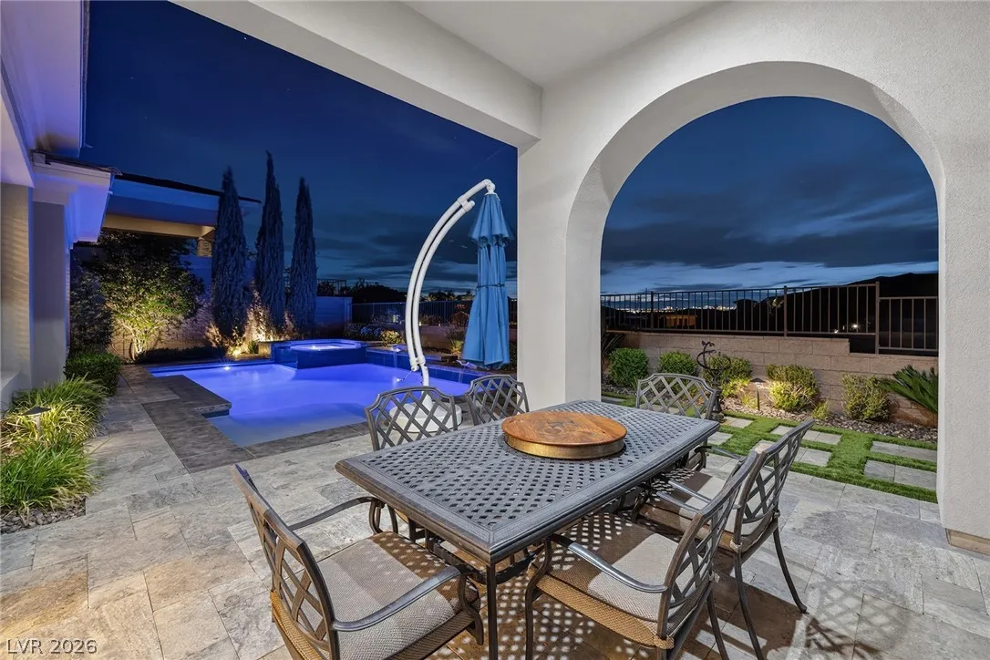 Experience modern luxury in this single-story contemporary highly upgraded home with breathtaking views. High ceilings and well-lit open spaces fill the home. The elegant finishes make this a gem in LLV’s Monte Lucca 49-home boutique neighborhood. Recessed lighting, tile flooring and designer tile surrounding the fireplace create a welcoming ambiance. The well-appointed kitchen’s fine cabinetry sets the stage for stainless-steel appliances including built in double ovens and microwave. The granite waterfall island make it a perfect environment for entertaining. Relish in a spectacular master suite, with spa bathroom, sitting area, and walk-in closet. The backyard sanctuary has a patio cover, outstanding pool & spa is a beautiful water feature. Includes walk-in pantry, laundry room, garages feature 4’ extended size and a $25,000 Sports Club membership provided by Gene Northup at close!