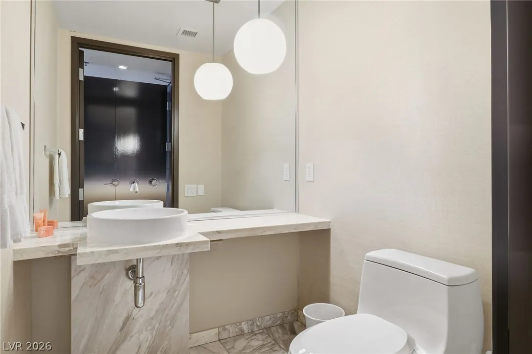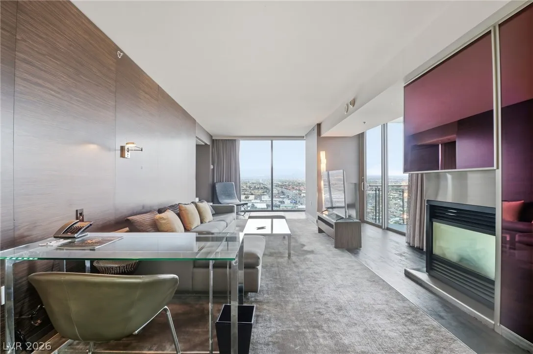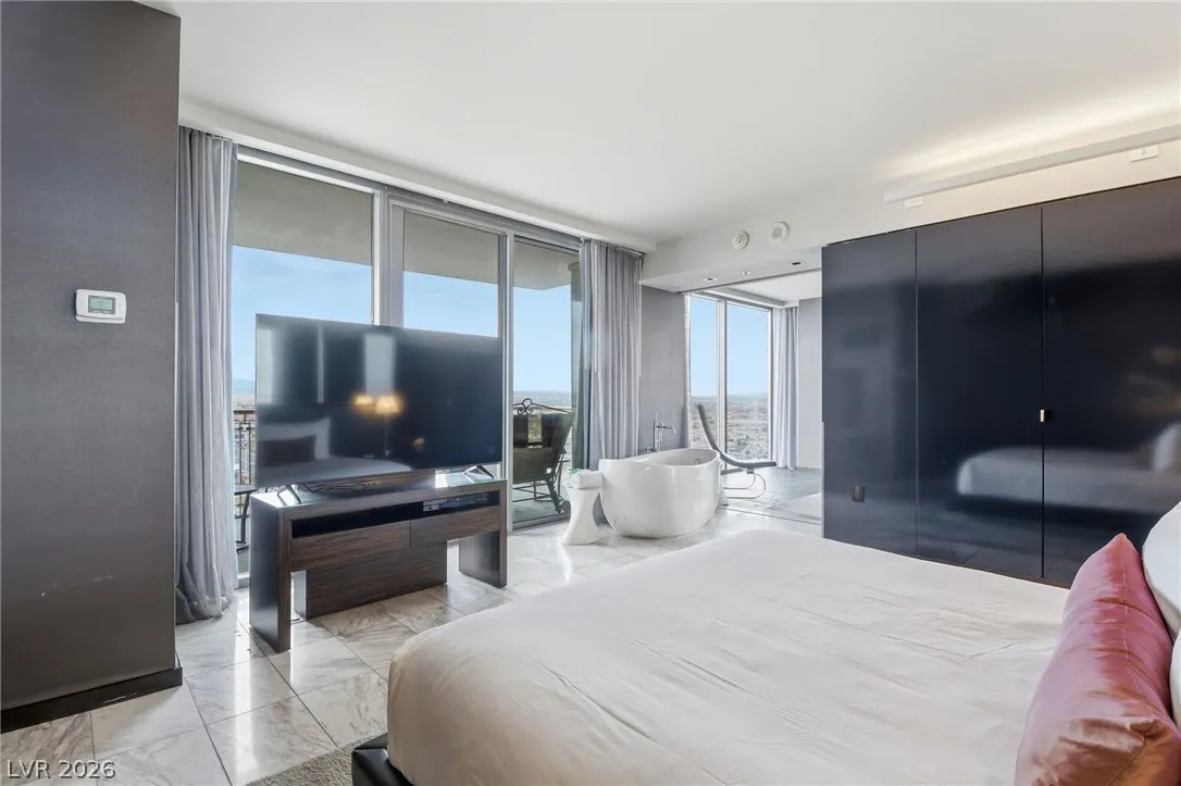 Enjoy the stunning views from the living room terrace from the Sphere all the way to the North and to the West and South from the 2nd terrace off the Bedroom. This 23rd floor One Bedroom, One and a Half Bath Unit is Fully Furnished and includes: Stainless Steel Appliances, Two Terraces w/Strip, Sphere, City, Mountain and Sunset Views, King Size Bed, Flat Screen TV’s in Living Room and Bedroom, Island Kitchen with Stove, Refrigerator, Microwave, Full Size Washer and Dryer, Hardwood & Marble Flooring, Bath with Large Shower, Separate Soaking Tub, and ALL Household items! Large living room with fireplace and desk for workspace. All Located Within The World Class Palms Resort with Restaurants, Spa, Pool, Cabanas, Concierge & Fitness Center! Owner benefits include dining and spa discounts. Owners can elect to participate in the hotel rental program or keep it private. Unit is currently licensed and rented as AirBNB. Perfect for weekend getaways in Vegas.