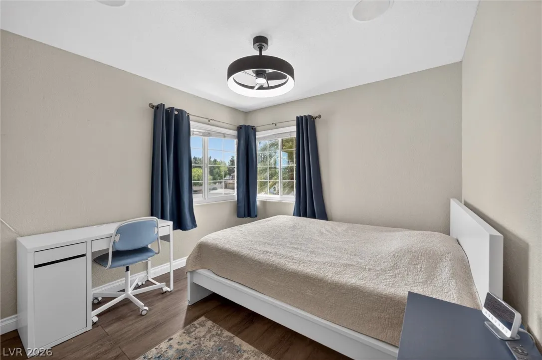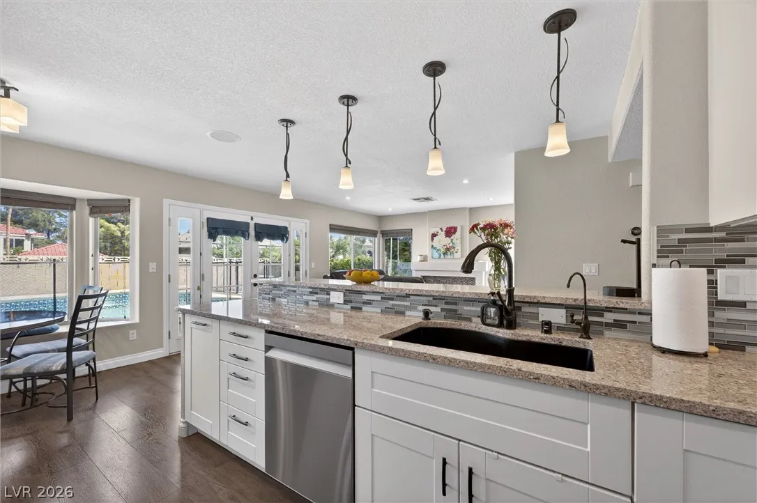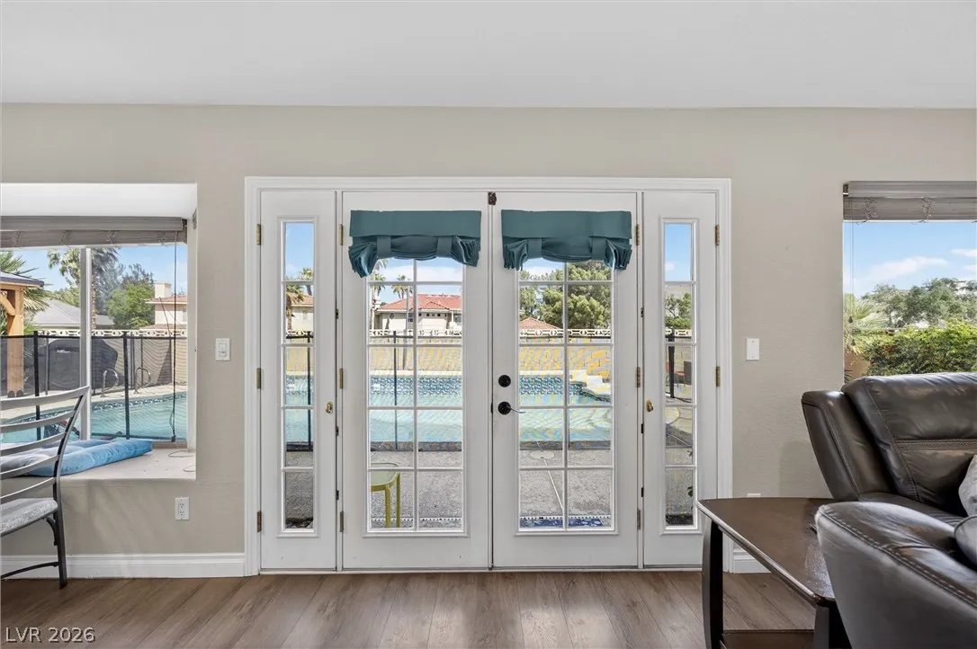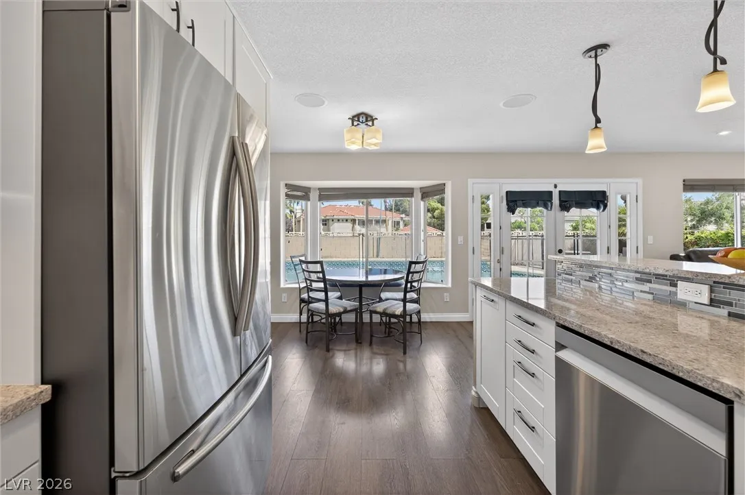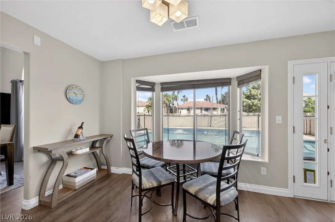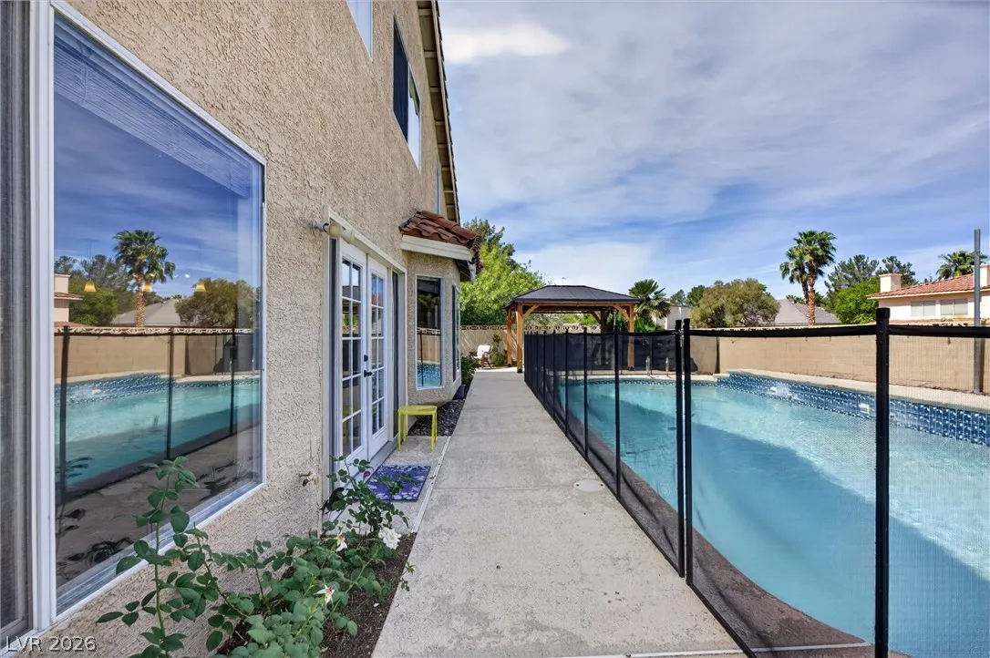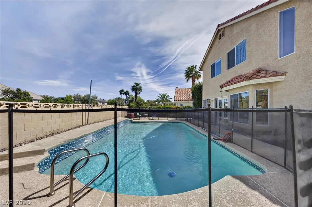 ABSOLUTELY STUNNING 2 STORY IN HENDERSON!!!! This home has been nicely upgraded and well taken care of. Rare find with 5 bedrooms and 3 baths. One bedroom and 3/4 Bath downstairs. Wood Laminate flooring throughout except the stairs. Completely Remodeled Kitchen with Custom Cabinetry and Quartz Countertops; Stainless Steel Appliances. The kitchen has an extended breakfast bar and separate eat in nook. Remodel Primary Bathroom with custom shower and soaker tub. Several windows have been replaces, Newer HVAC/Furnace, Owned Water Filtration System with R/O, Newer Pool pump with Heater (Heater needs gas hook up), Newer Garage door with Side Smart Garage Door Opener. Custom French Doors with side window openings leading the private backyard. Enjoy a splash in the SPARKING Pool! Custom Built-in Pergola. NO BEHIND NEIGHBORS!