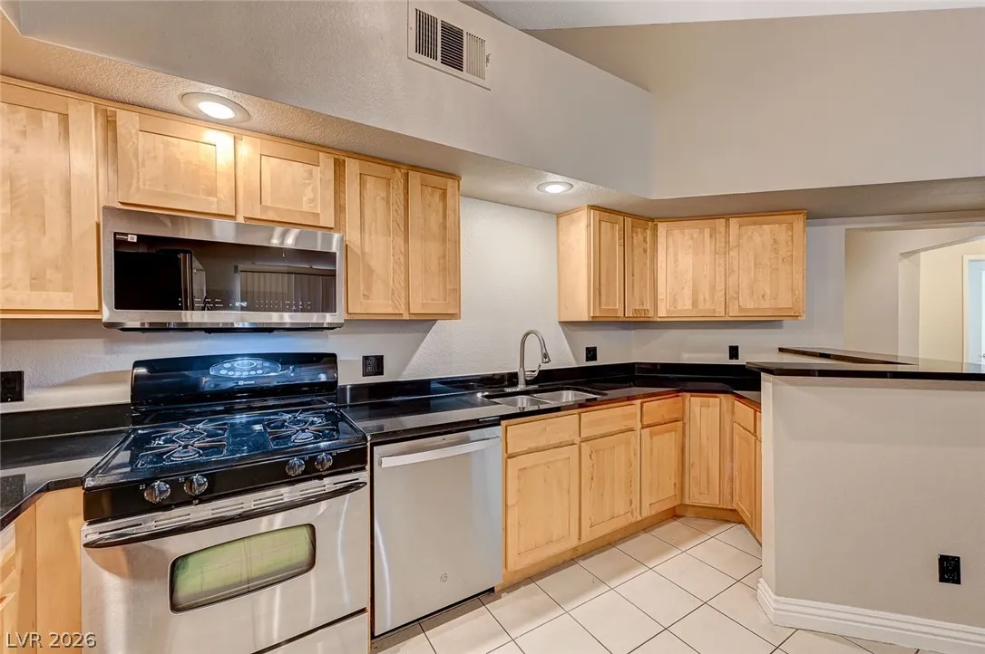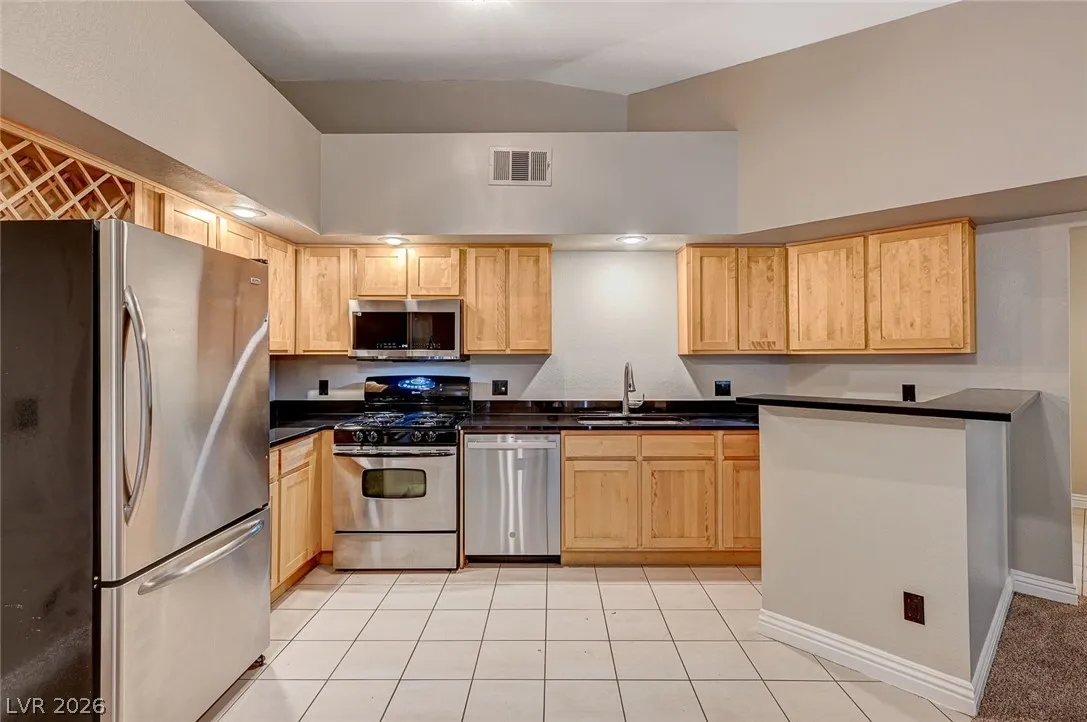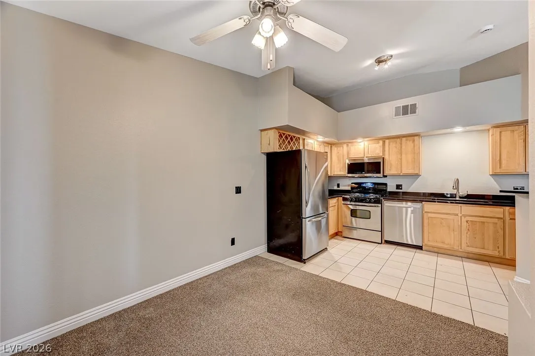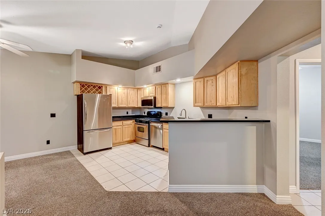 The open kitchen is both functional and welcoming with stainless steel appliances, a breakfast bar, and generous cabinet and counter space, flowing easily into the dining area.