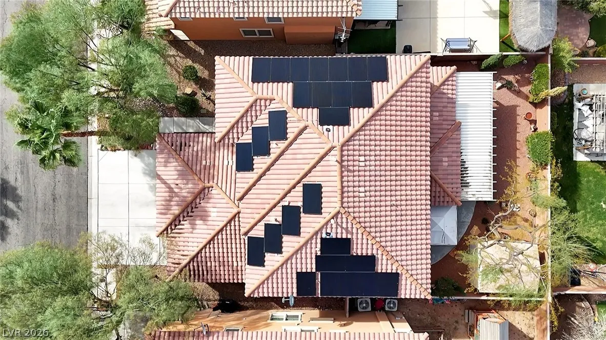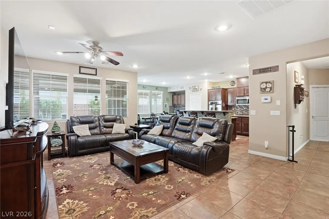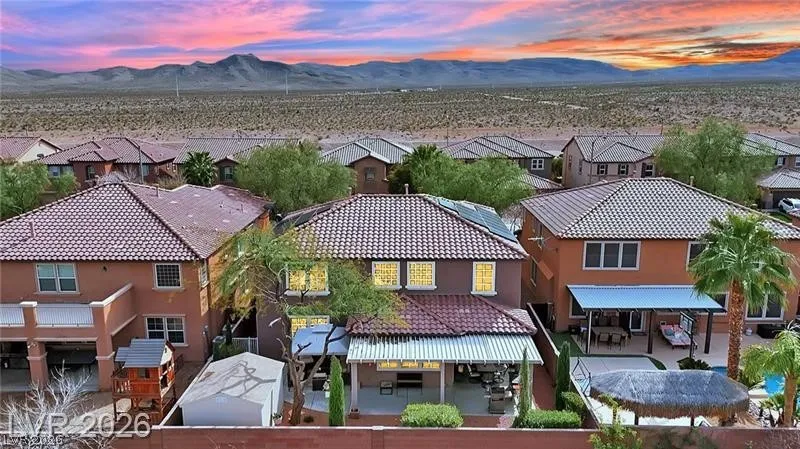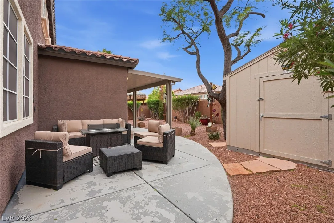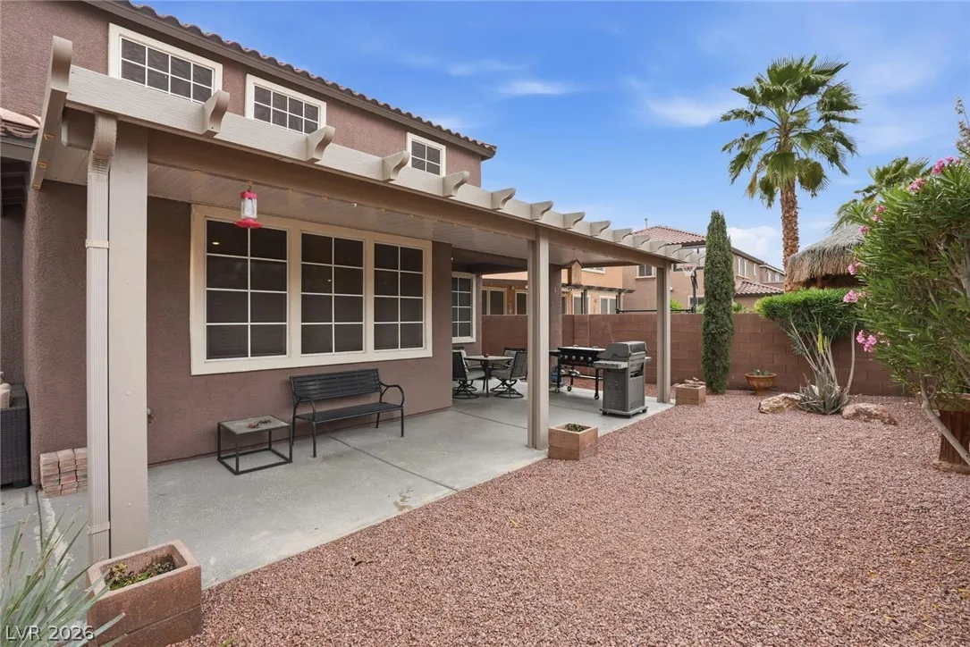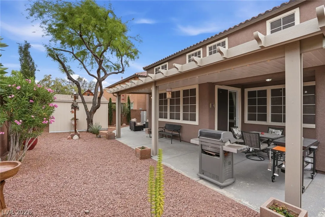 Beautifully upgraded 5-bedroom, 3.5-bath home offering nearly 3,100 sq. ft. in the sought-after Chaco Canyon neighborhood of Mountains Edge. Designed for both everyday comfort and entertaining, this spacious home features an open-concept layout with a large living room, breakfast area, and kitchen with stainless steel appliances. The downstairs primary suite offers added convenience and includes a luxurious walk-in whirlpool tub. Upstairs, a generous loft with upgraded wood flooring provides flexible space for a second living area, office, or hobbies. Energy-efficient features include solar, solar screens, fresh exterior paint, a replaced main AC unit, and a new water heater. Step outside to a covered backyard awning, low-maintenance desert landscaping, and a large storage shed—perfect for enjoying the Las Vegas lifestyle.