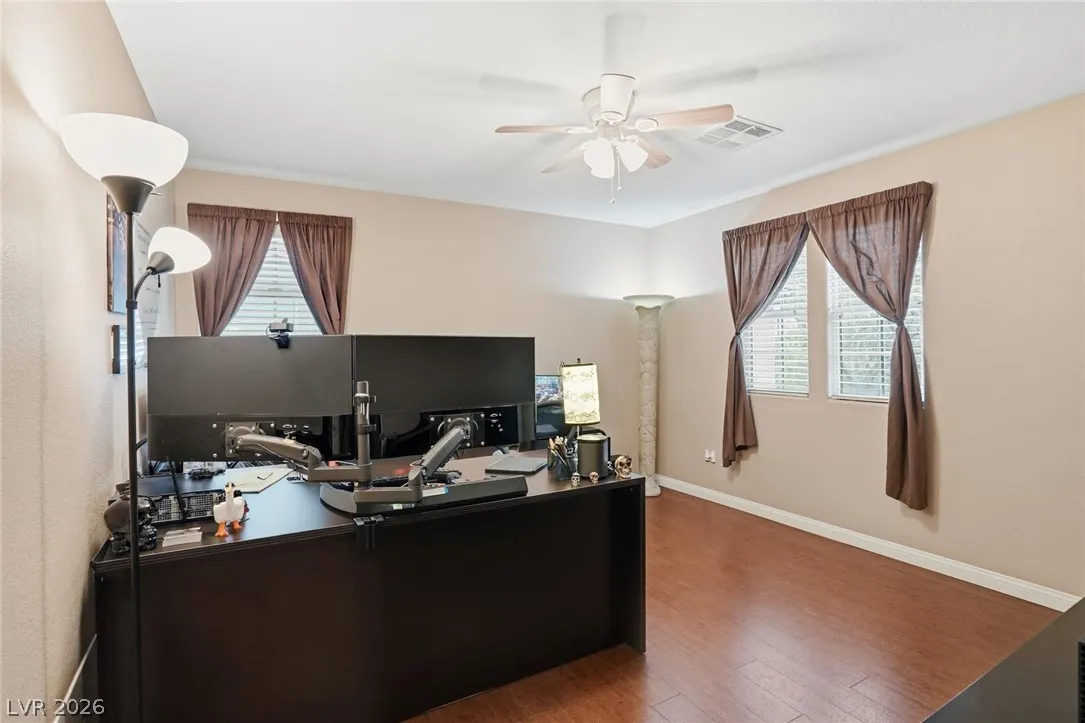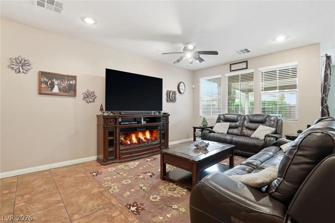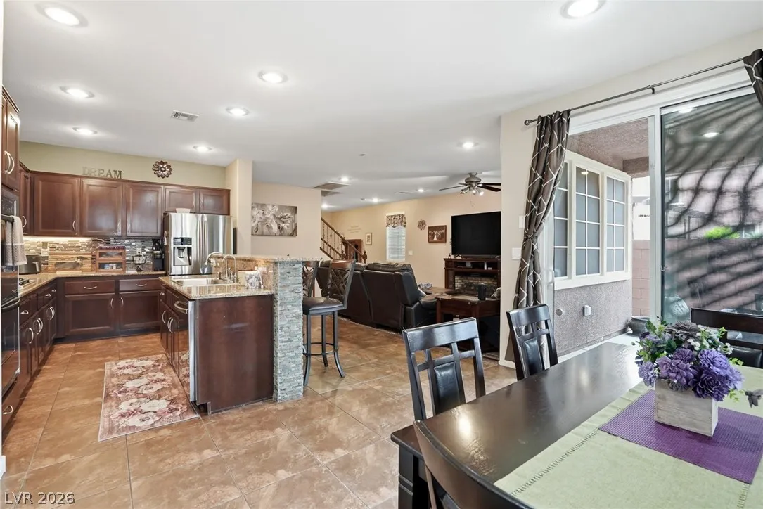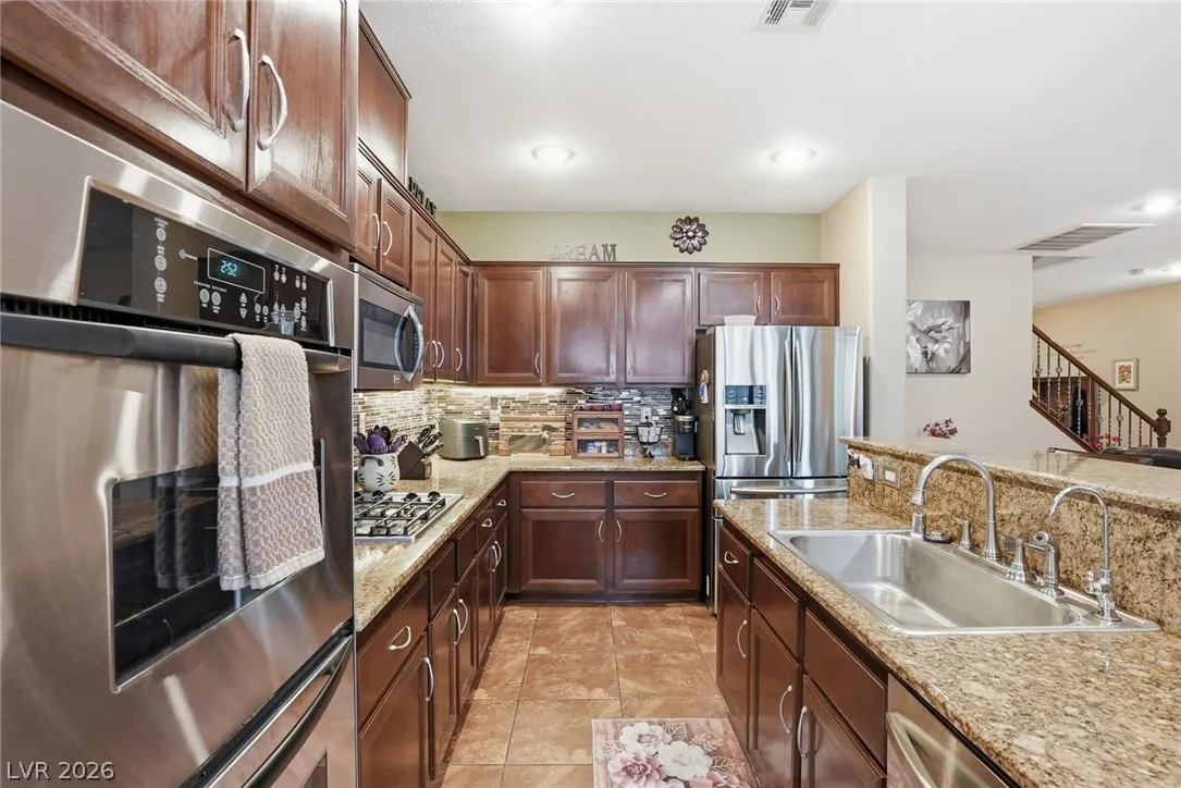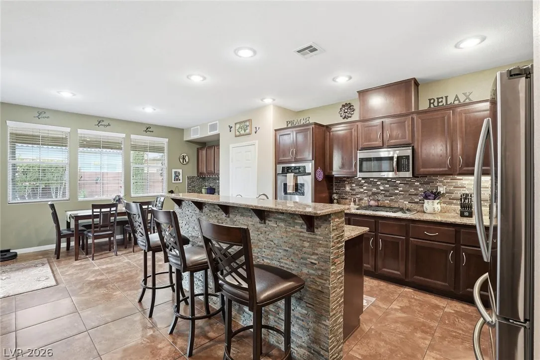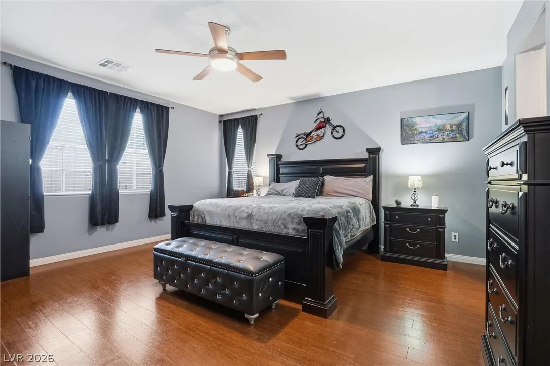 Beautifully upgraded 5-bedroom, 3.5-bath home offering nearly 3,100 sq. ft. in the sought-after Chaco Canyon neighborhood of Mountains Edge. Designed for both everyday comfort and entertaining, this spacious home features an open-concept layout with a large living room, breakfast area, and kitchen with stainless steel appliances. The downstairs primary suite offers added convenience and includes a luxurious walk-in whirlpool tub. Upstairs, a generous loft with upgraded wood flooring provides flexible space for a second living area, office, or hobbies. Energy-efficient features include solar, solar screens, fresh exterior paint, a replaced main AC unit, and a new water heater. Step outside to a covered backyard awning, low-maintenance desert landscaping, and a large storage shed—perfect for enjoying the Las Vegas lifestyle.