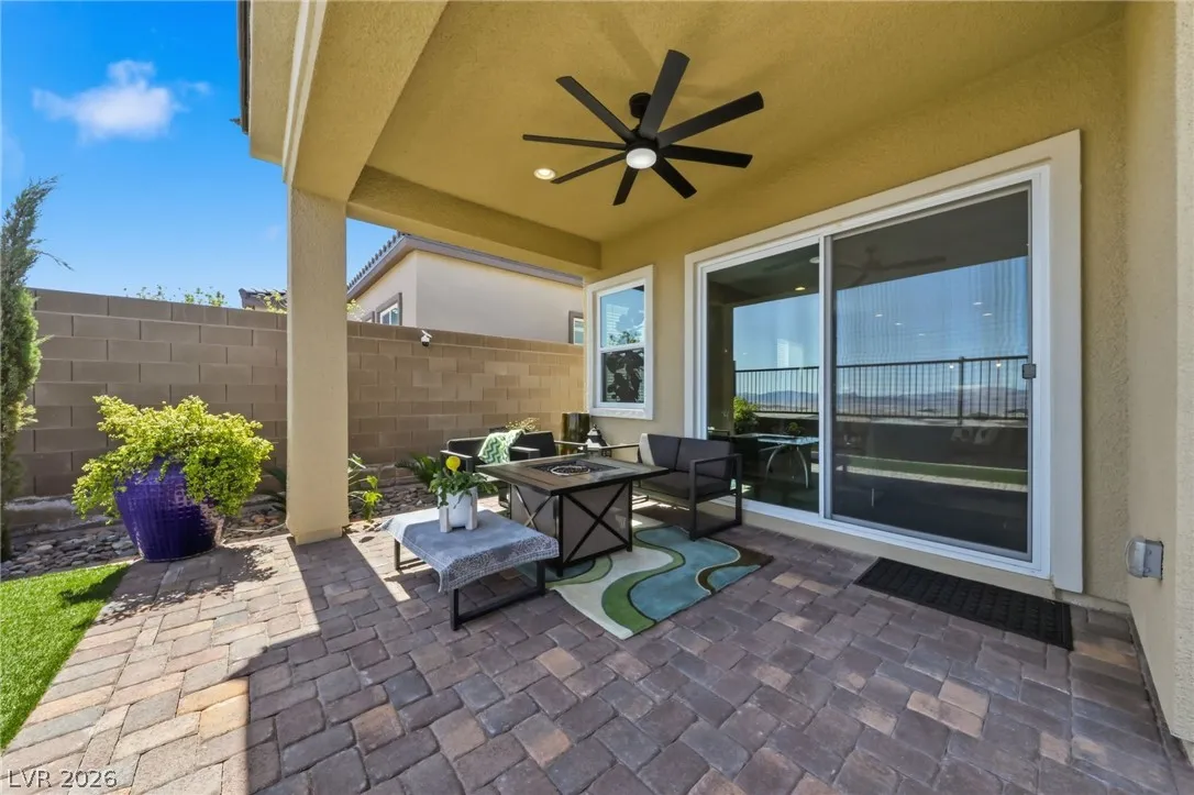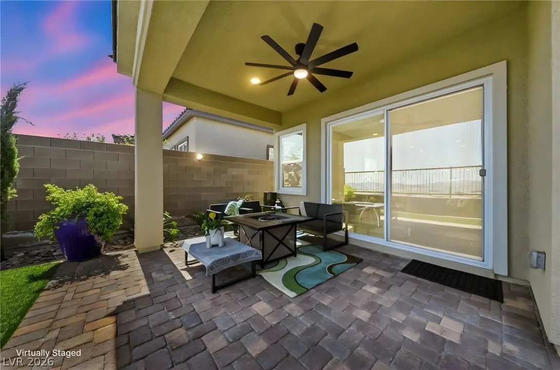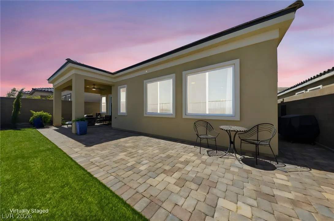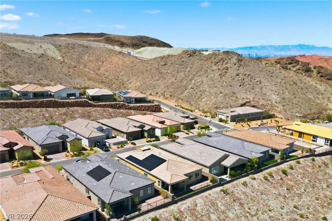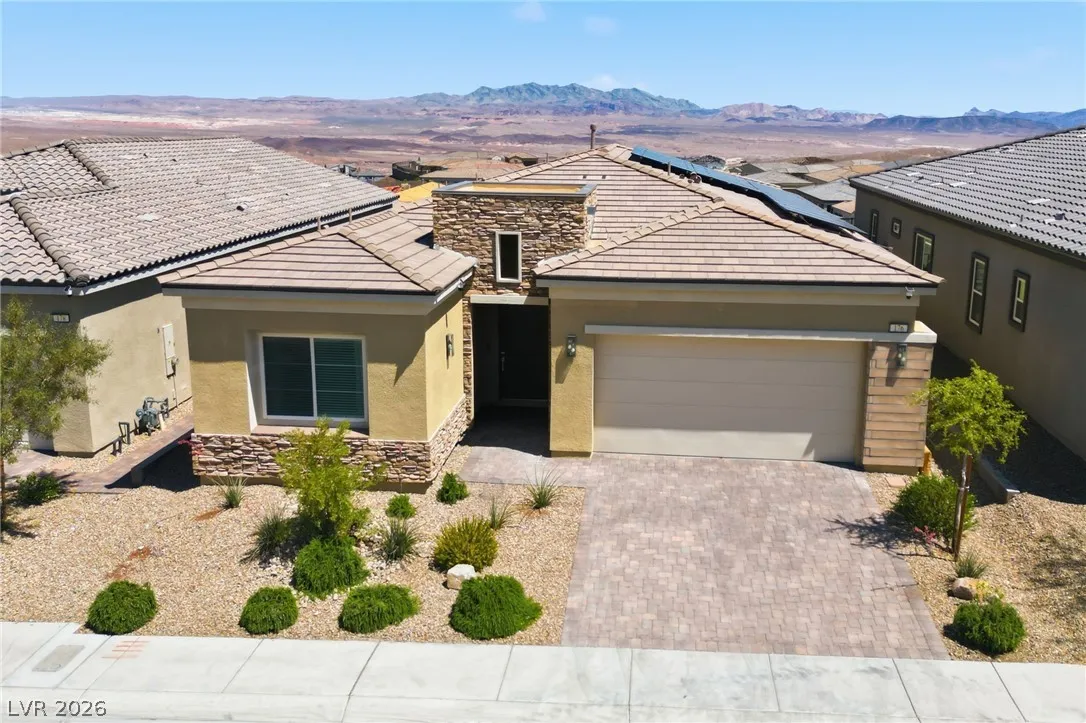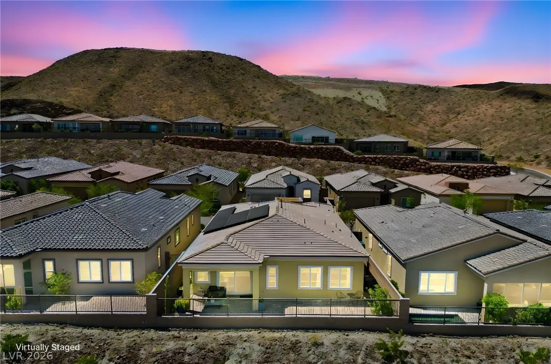 Enjoy single-story living in a gated community with unobstructed mountain views, plus a thoughtfully upgraded set of comfort and efficiency features throughout. Designed with energy savings in mind, the home includes a solar power lease to help reduce monthly electric costs, along w/a tankless water heater for on-demand hot water efficiency, a dedicated EV charging outlet, and a whole-home water softener/filtration system for added comfort and performance. The chef’s kitchen is designed to impress with a huge island, quartz countertops, custom cabinets, and convenient pull-out shelving, while custom dining room lighting elevates entertaining. Soaring 10’ ceilings and an electric fireplace make the family room a welcoming place to unwind, and smart-home peace of mind comes with a Eufy video doorbell. Outdoors, you’ll love the landscaped, low-maintenance backyard w/a covered patio for year-round relaxing. The primary suite is finished w/a custom closet for polished, organized storage.