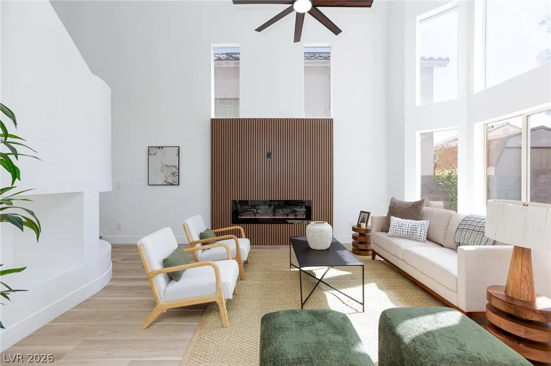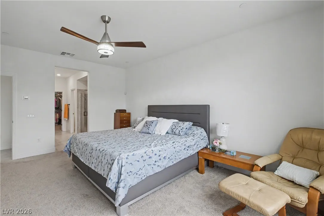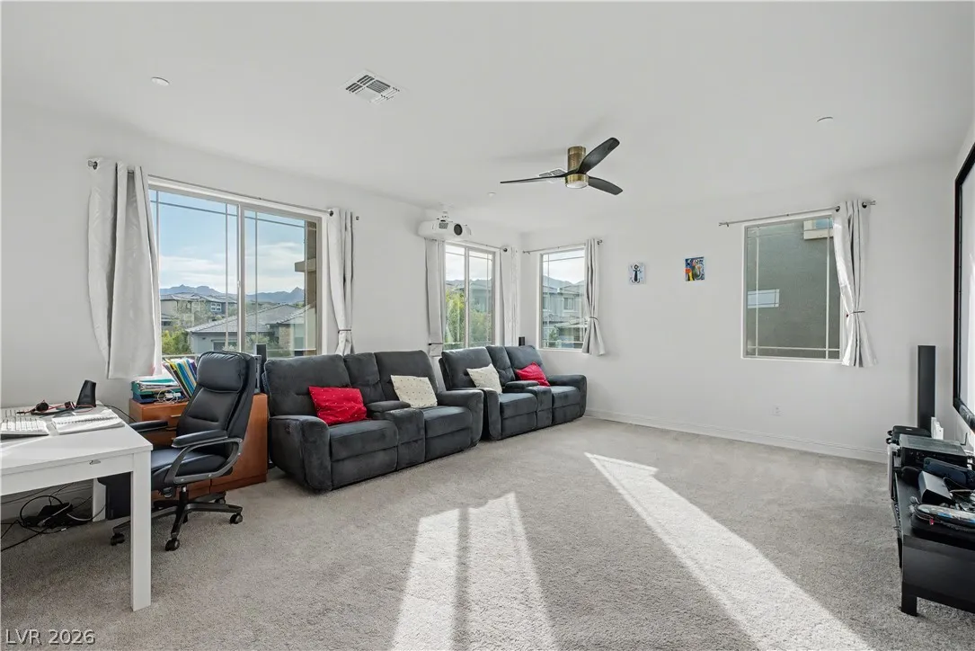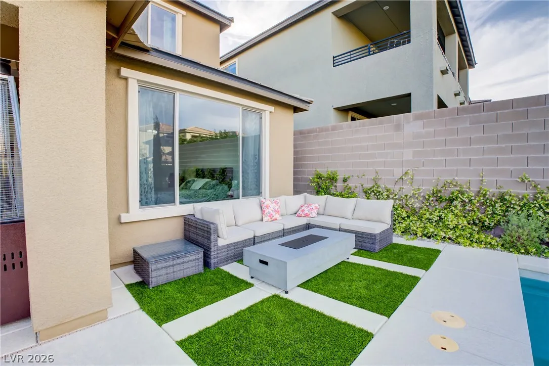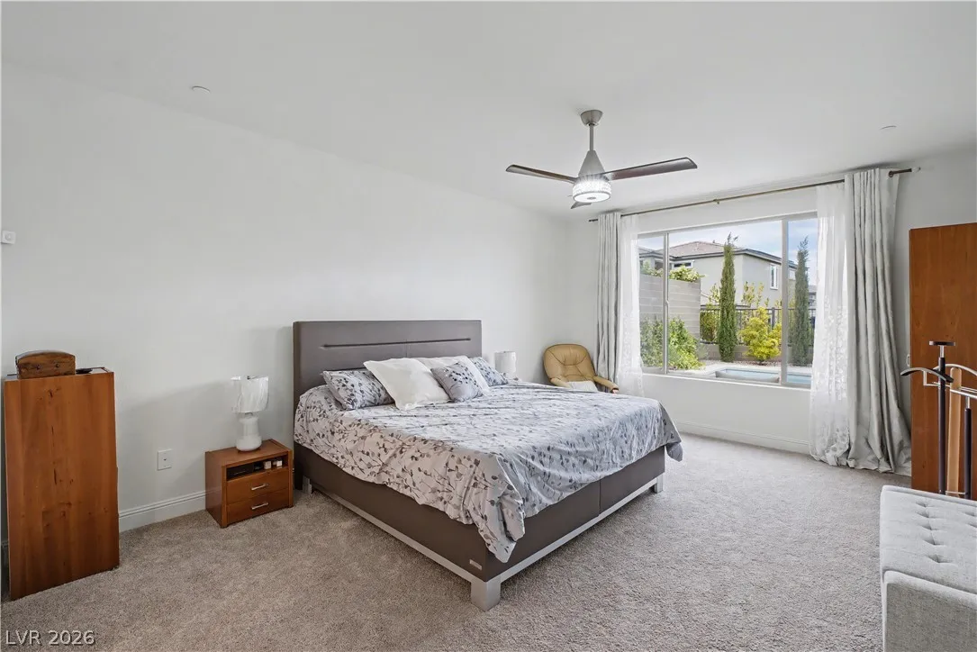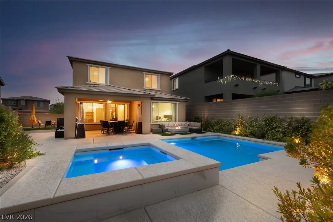 Location, location. This move-in ready home is located in the gated Starling Community adjacent to the Red Rock Mountain area in Summerlin. It offers an open floor plan with a spacious kitchen featuring stainless steel appliances. NEW hardware has been installed throughout the entire home, NEW vanities and sinks in aloof the bathrooms and laundry room, NEW tile in the living room, NEW Carpet on the stairs and in the primary bedroom located on the main level. Head upstairs to a large loft with mountain views. Each bedroom has a walk-in closet and a ceiling fan. In the backyard, step out to a covered patio equipped with a Napoleon outdoor kitchen with stainless steel cabinets featuring a semi-built-in natural gas barbecue, an outdoor fridge and granite countertops. Just steps away are a stunning oasis, a sparkling heated pool and raised spa, and a large seating area with a built-in natural gas fire pit. This home is a must see!!! Call or text 702-207-9897 for an appointment.