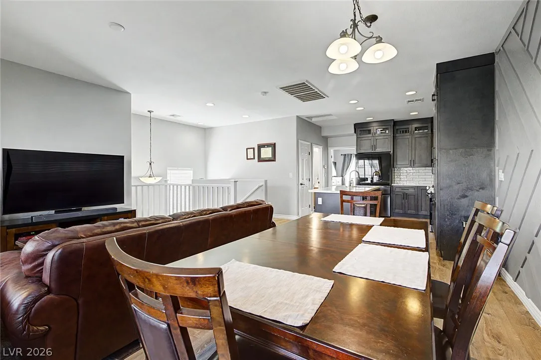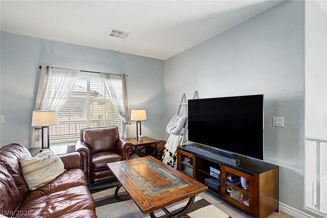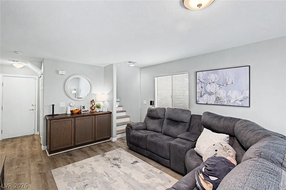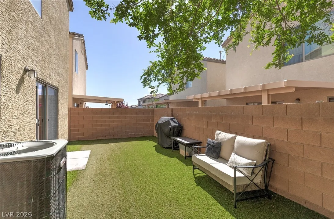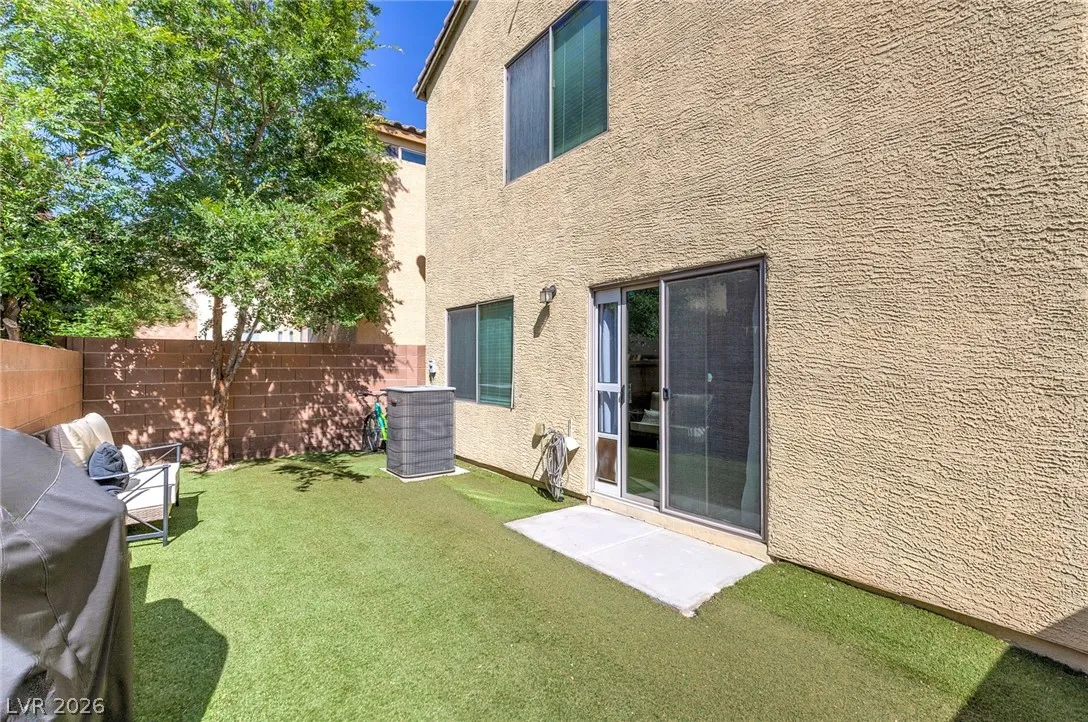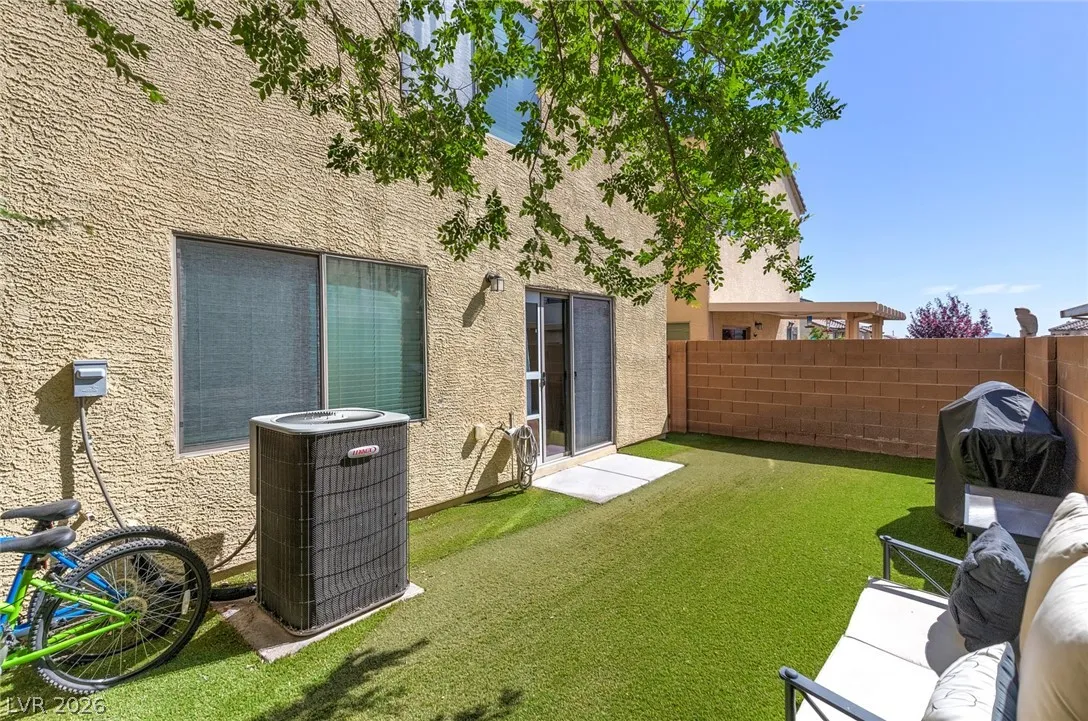 Beautiful 3-bedroom, 2.5-bath home in a gated Centennial Hills community with resort-style amenities including a pool, spa, and park. This split-level layout offers a spacious primary suite, upgraded kitchen with large island, bright living and dining areas, office nook, and private balcony upstairs. Downstairs features a family room, two guest bedrooms, full bath, and laundry closet. Enjoy a low-maintenance backyard with artificial turf and a sliding glass door for indoor-outdoor living. Upgrades include luxury vinyl plank flooring, carpeted bedrooms, and custom wood paneling. Includes a 2-car garage with 240V EV outlet.