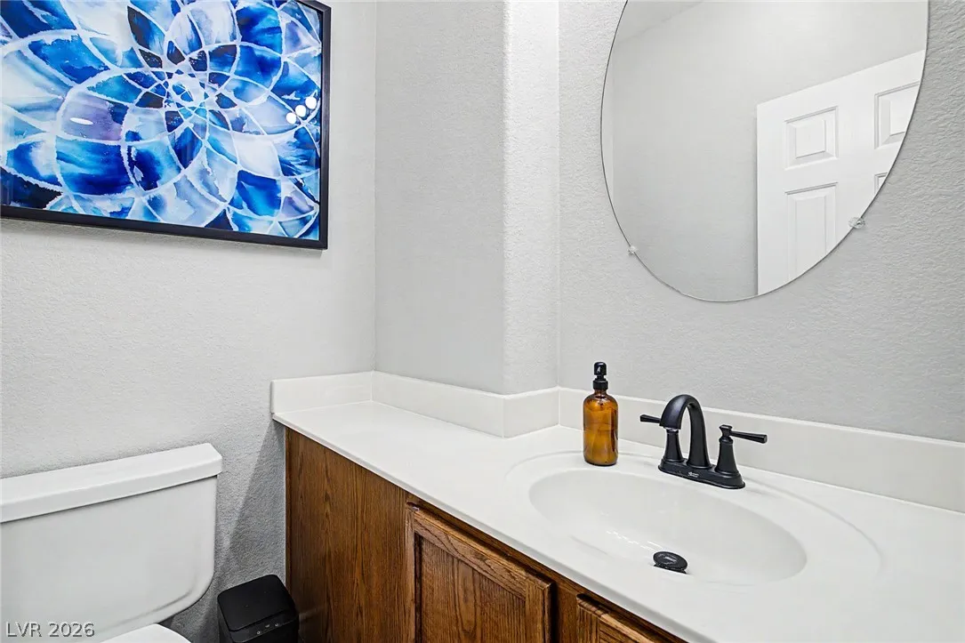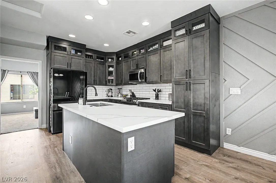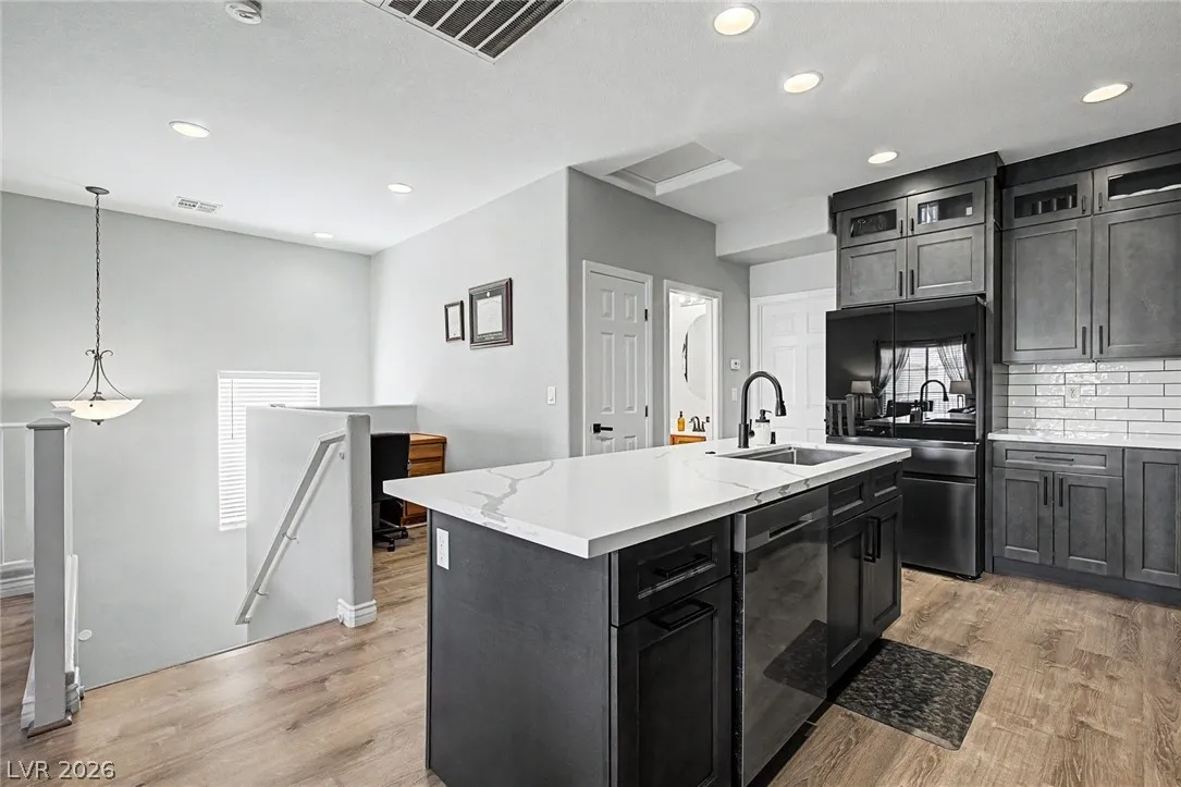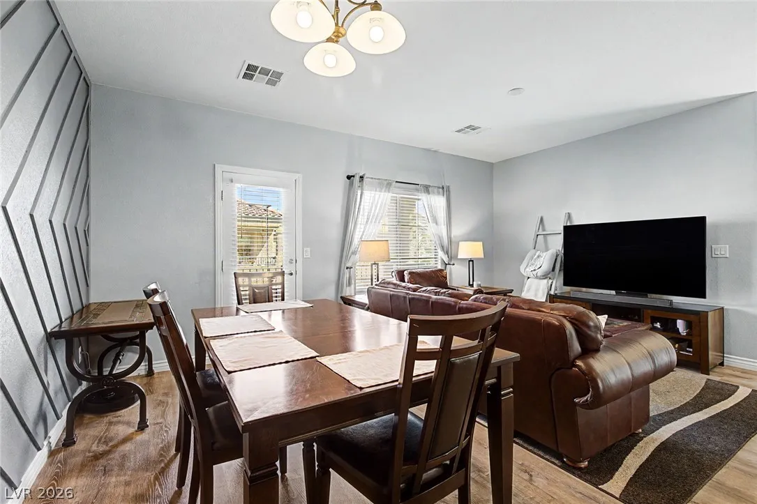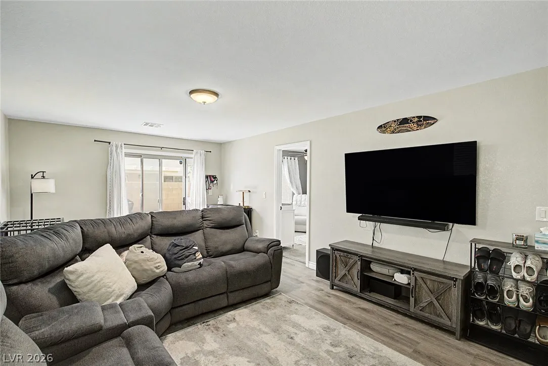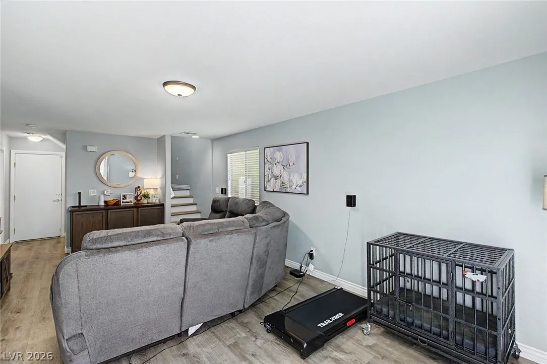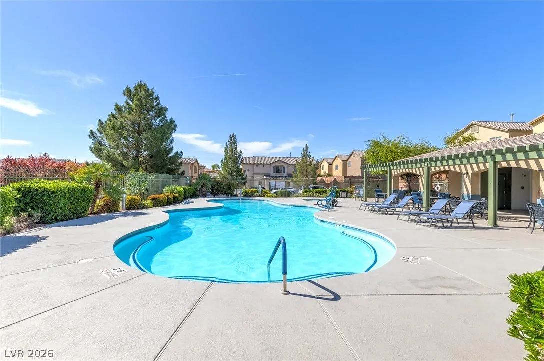 Beautiful 3-bedroom, 2.5-bath home in a gated Centennial Hills community with resort-style amenities including a pool, spa, and park. This split-level layout offers a spacious primary suite, upgraded kitchen with large island, bright living and dining areas, office nook, and private balcony upstairs. Downstairs features a family room, two guest bedrooms, full bath, and laundry closet. Enjoy a low-maintenance backyard with artificial turf and a sliding glass door for indoor-outdoor living. Upgrades include luxury vinyl plank flooring, carpeted bedrooms, and custom wood paneling. Includes a 2-car garage with 240V EV outlet.