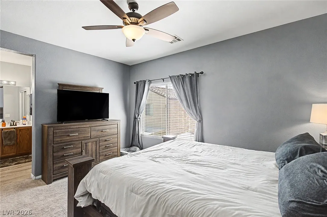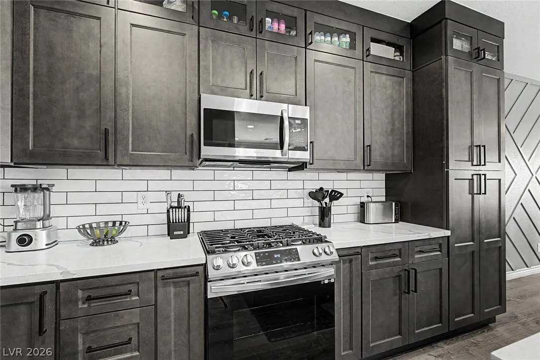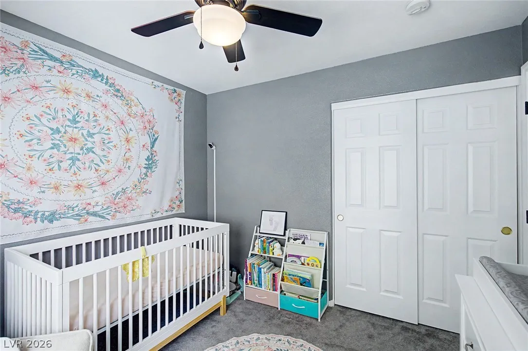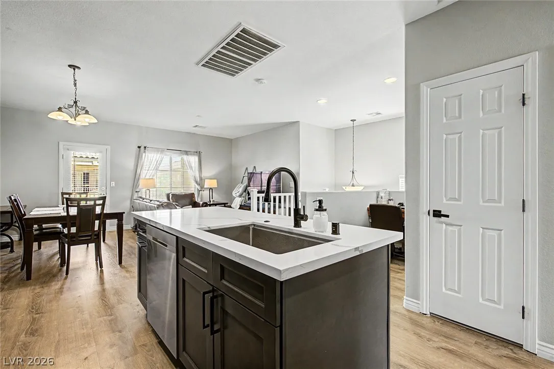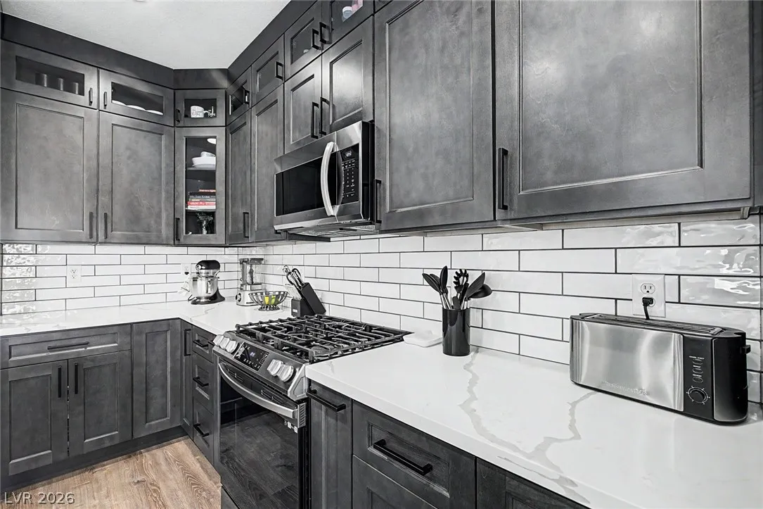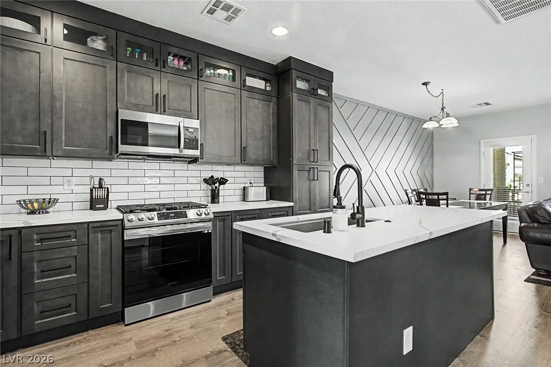 Beautiful 3-bedroom, 2.5-bath home in a gated Centennial Hills community with resort-style amenities including a pool, spa, and park. This split-level layout offers a spacious primary suite, upgraded kitchen with large island, bright living and dining areas, office nook, and private balcony upstairs. Downstairs features a family room, two guest bedrooms, full bath, and laundry closet. Enjoy a low-maintenance backyard with artificial turf and a sliding glass door for indoor-outdoor living. Upgrades include luxury vinyl plank flooring, carpeted bedrooms, and custom wood paneling. Includes a 2-car garage with 240V EV outlet.
