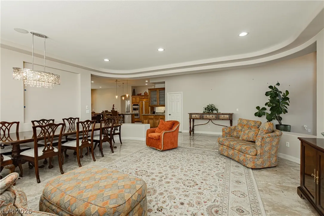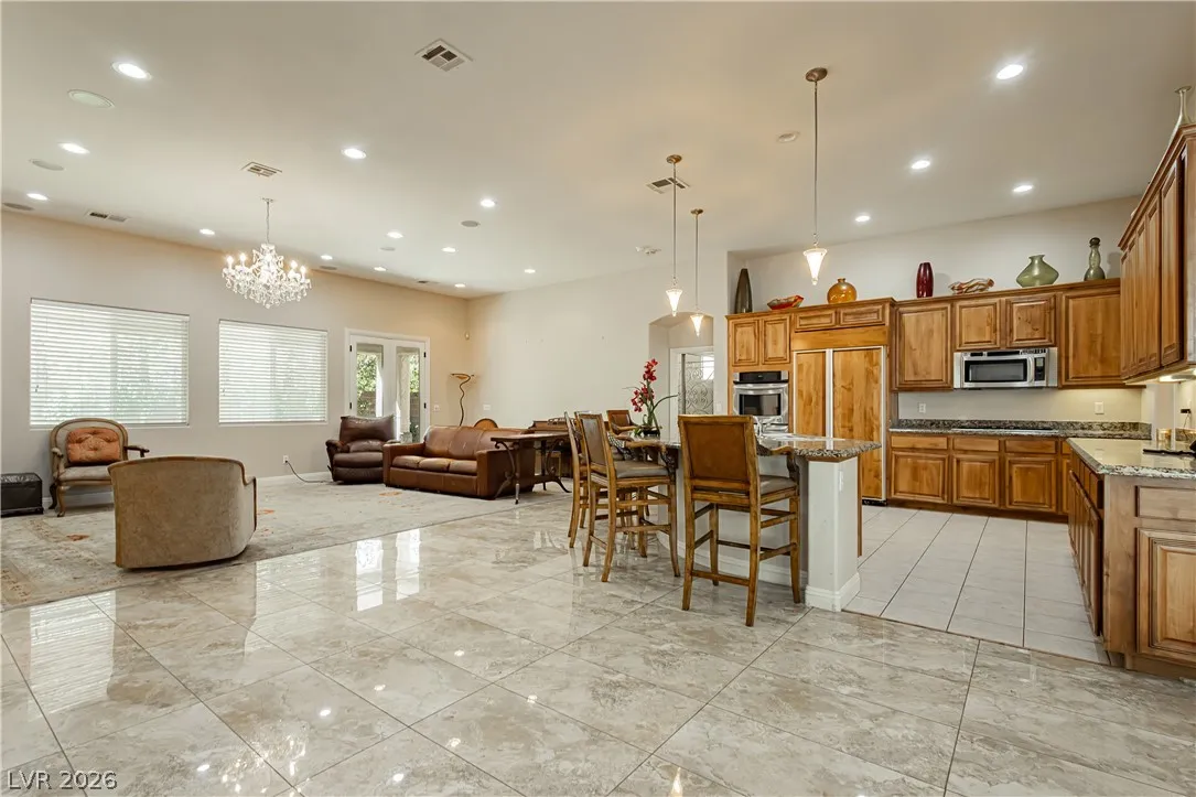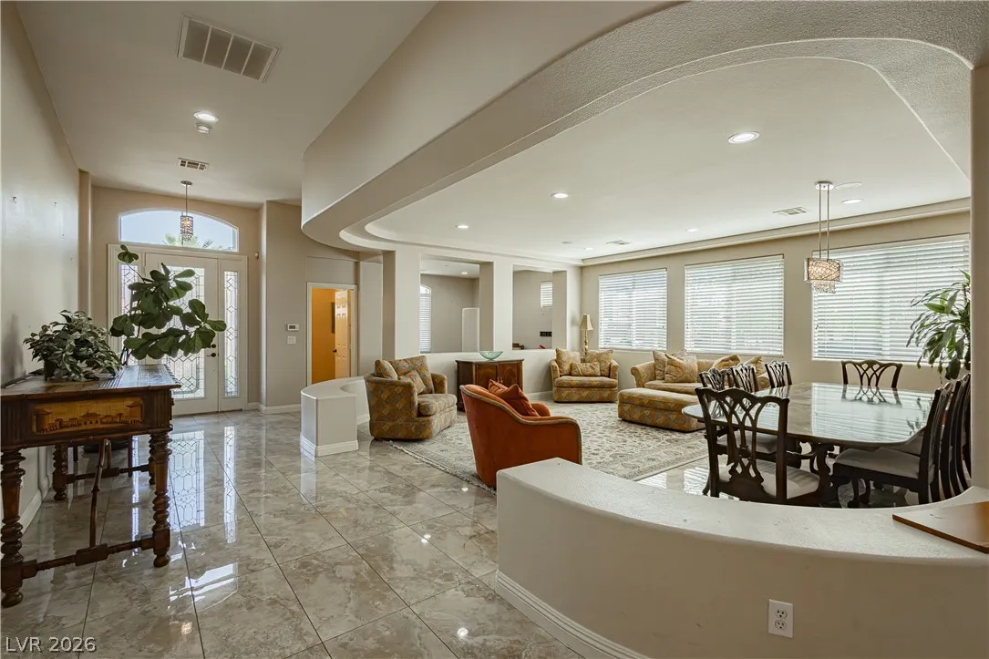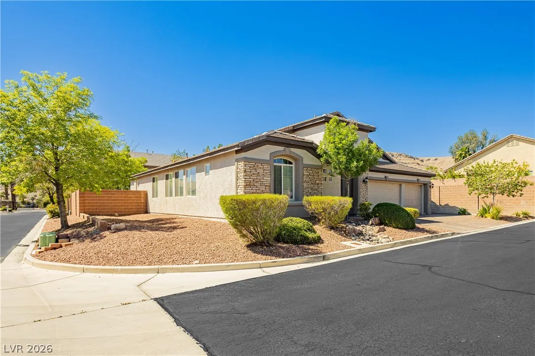 Clean lines, modern finishes, and a prime corner setting define this sleek 3-bedroom, 2.5-bath home in the gated Canyons II at Rhodes Ranch. Thoughtfully placed recessed lighting creates a crisp, well-lit interior that feels both refined and inviting. The open-concept layout flows effortlessly, offering a streamlined space ideal for contemporary living.