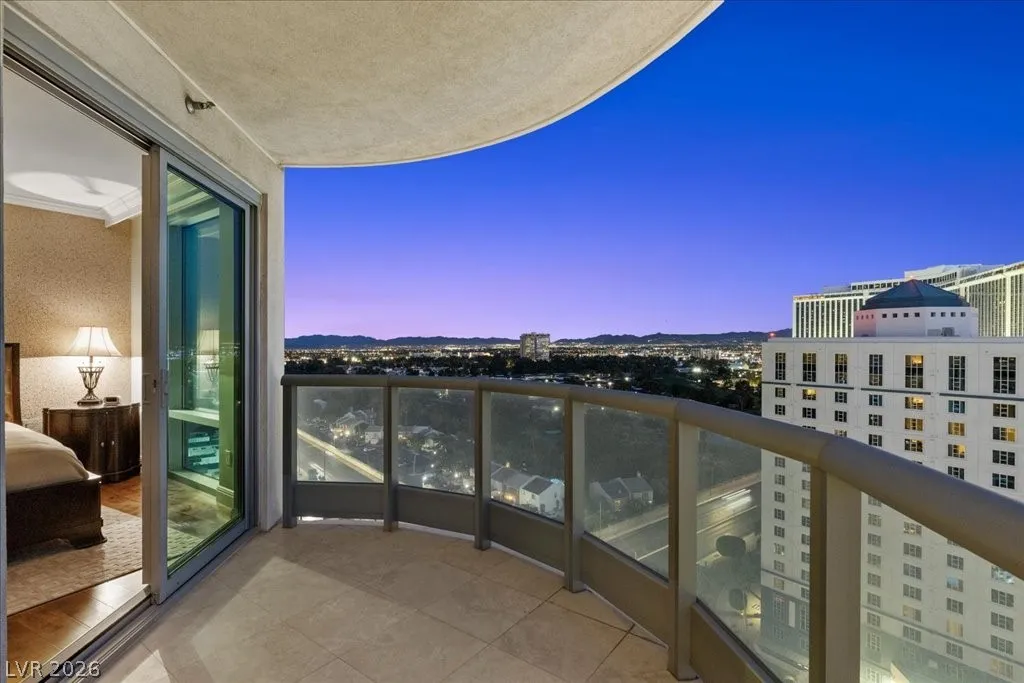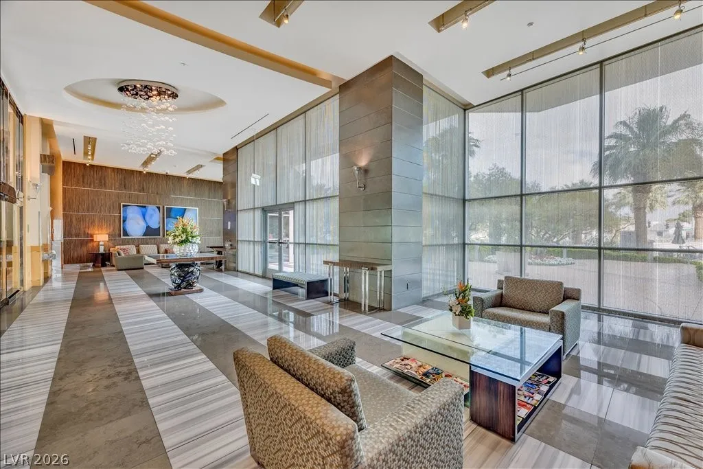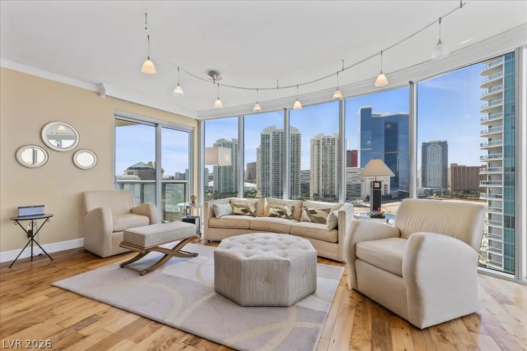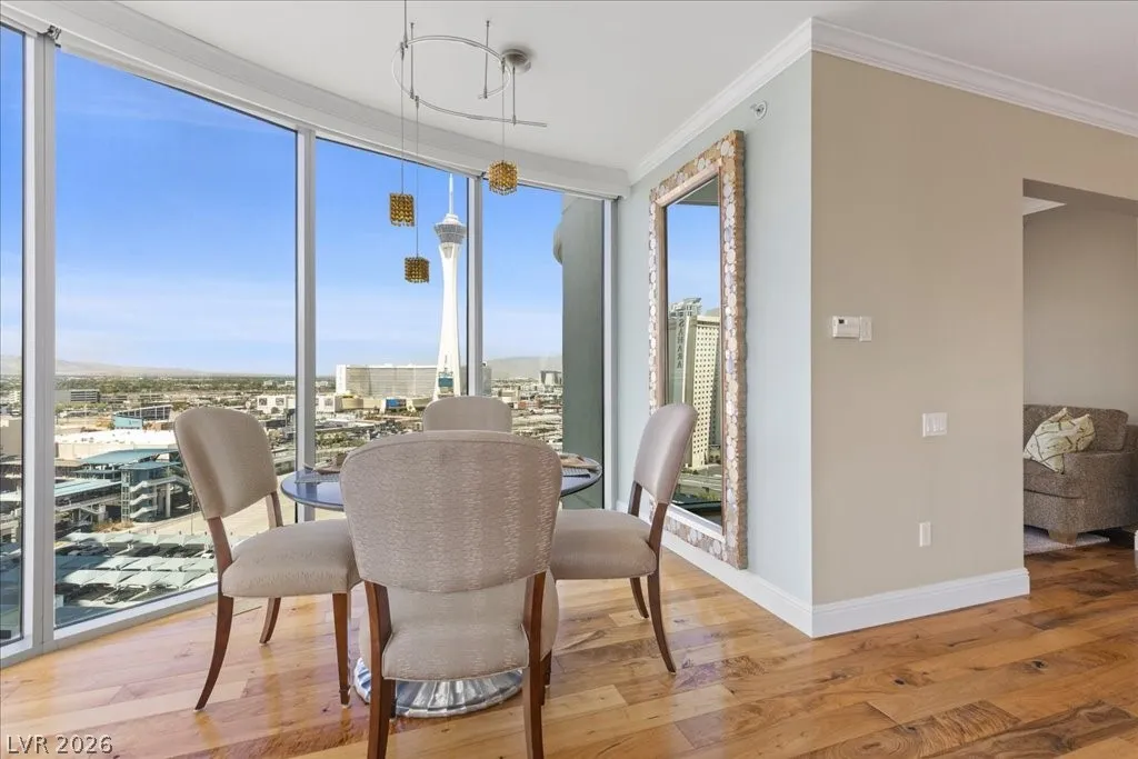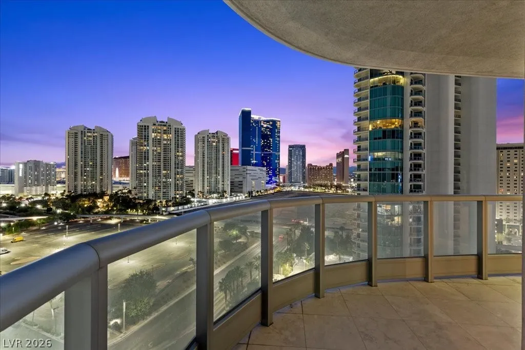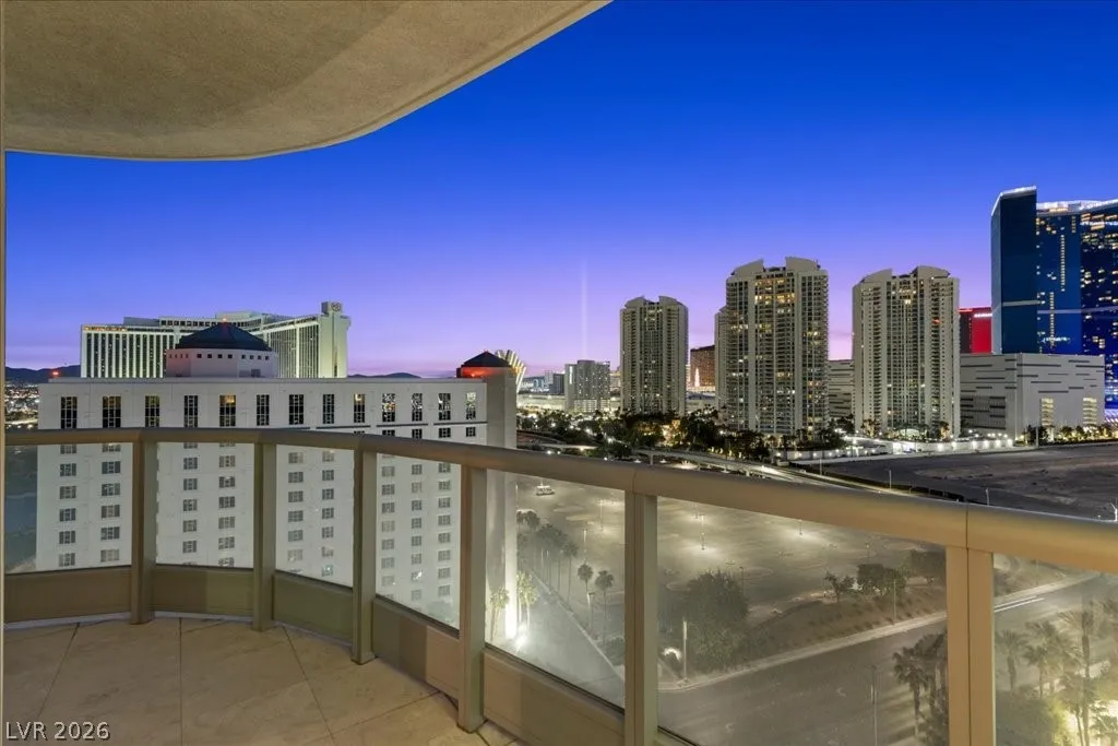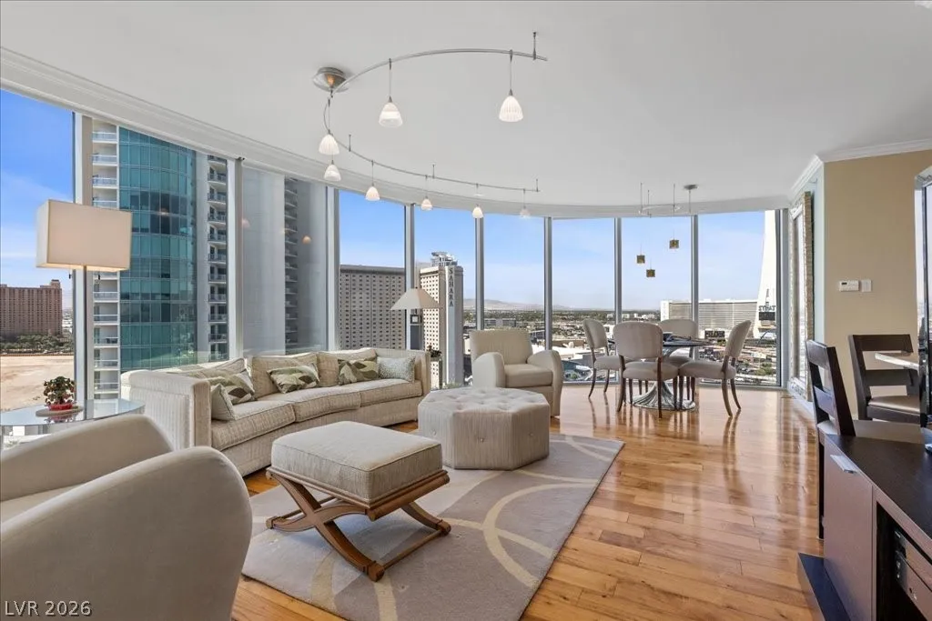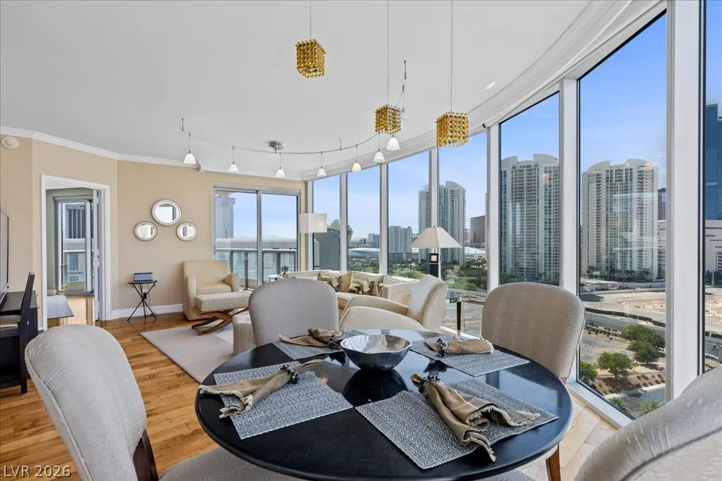 Residence 1608 at Turnberry Towers Las Vegas offers luxury high-rise living with panoramic views of the Las Vegas Strip, city skyline, and resort-style pool. This 2-bedroom + den, 2-bath condo features floor-to-ceiling windows, wood flooring, granite countertops, custom cabinetry, and stainless steel appliances. The open layout is ideal for entertaining, while the spacious primary suite includes terrace access and a marble spa-inspired bath. Timeless design in an iconic high rise in Las Vegas. Turnberry Towers is a guard-gated luxury high-rise community near the Strip, Fontainebleau Las Vegas, and the Las Vegas Convention Center. Amenities include resort-style pools, spa, fitness center, tennis and pickleball courts, valet, and 24-hour security. A premier Las Vegas luxury condo offering resort living in the heart of the city.