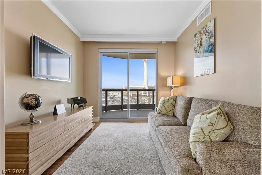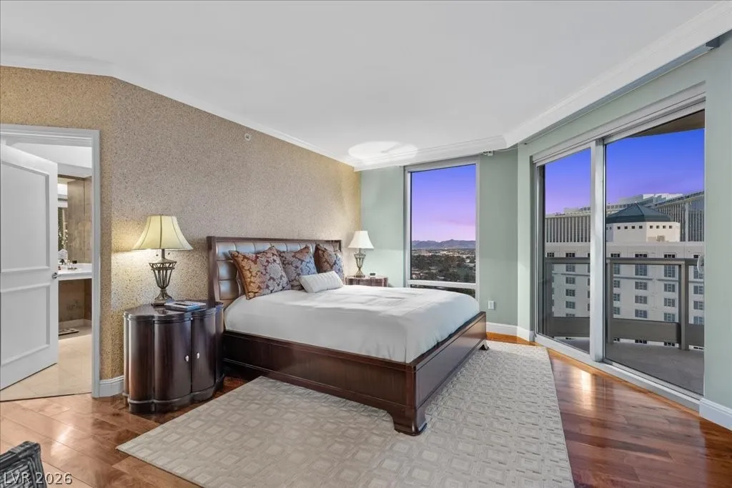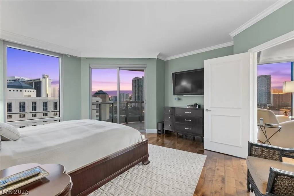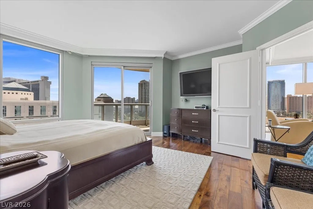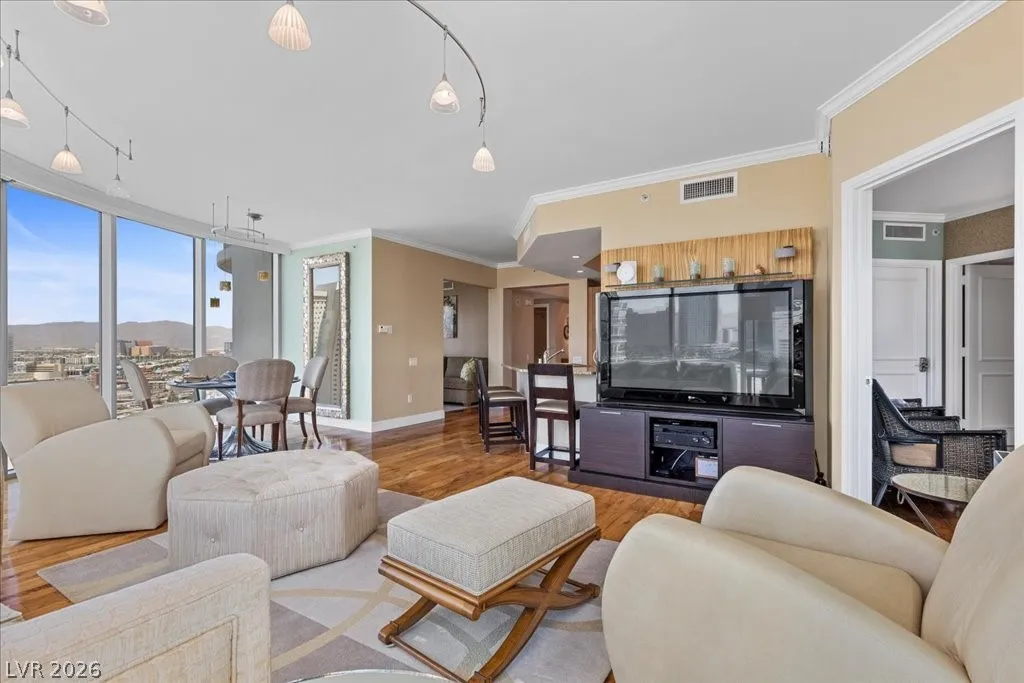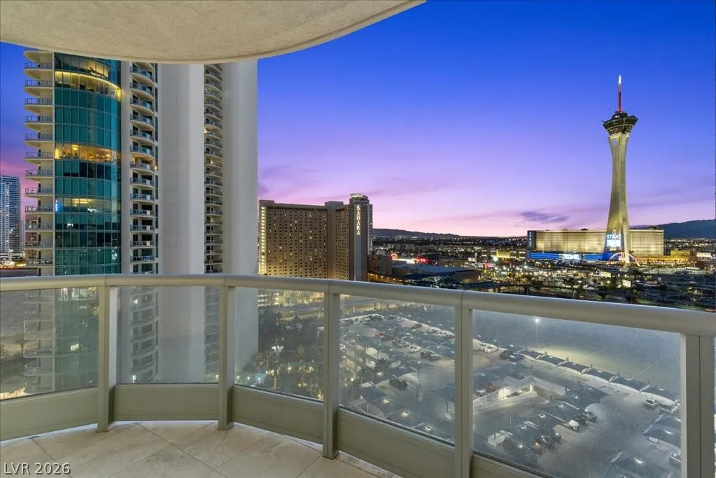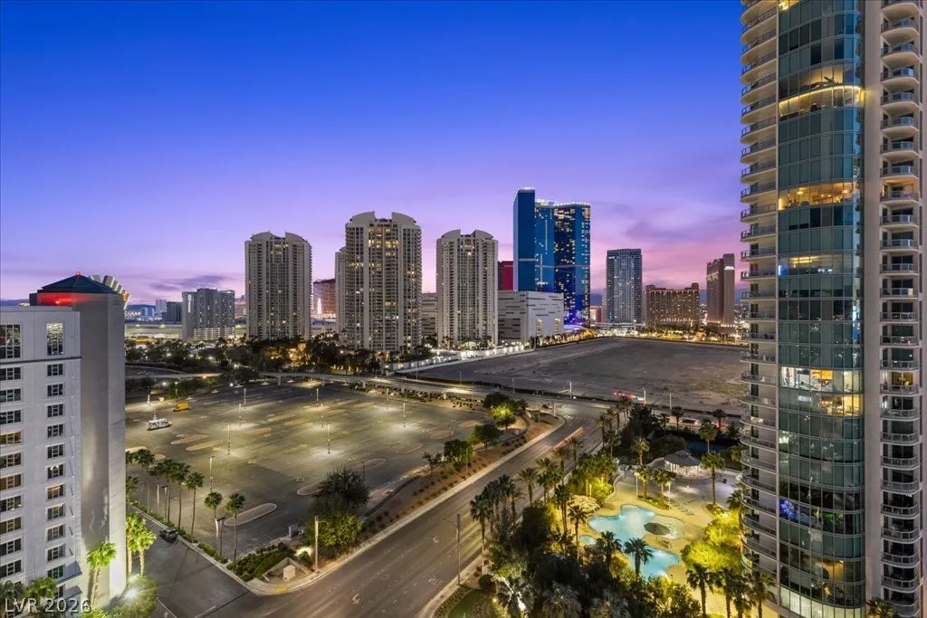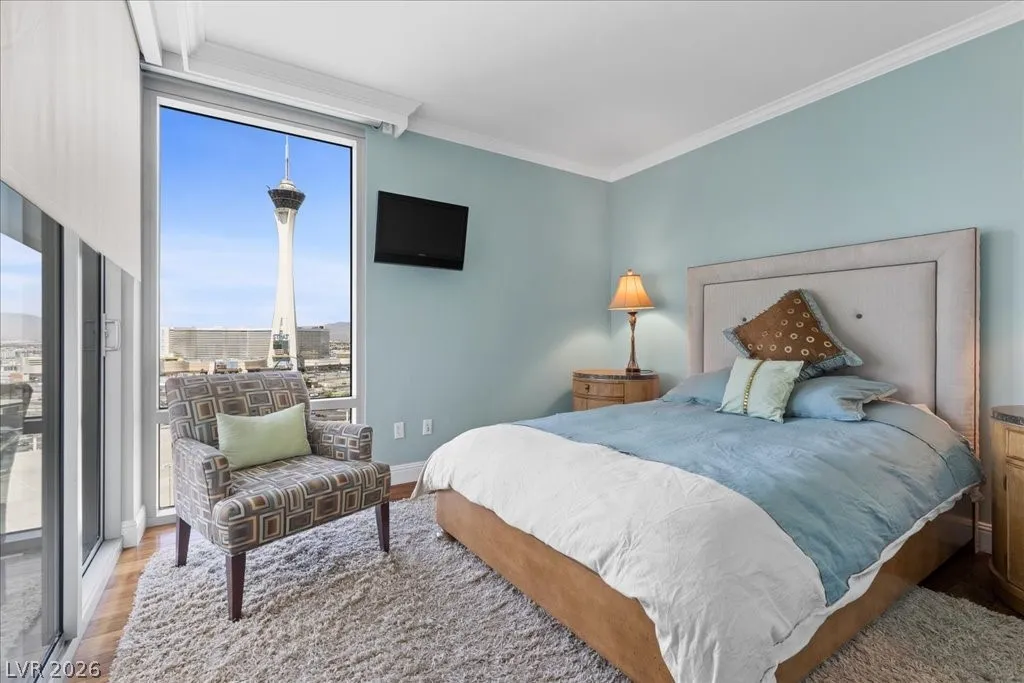 Residence 1608 at Turnberry Towers Las Vegas offers luxury high-rise living with panoramic views of the Las Vegas Strip, city skyline, and resort-style pool. This 2-bedroom + den, 2-bath condo features floor-to-ceiling windows, wood flooring, granite countertops, custom cabinetry, and stainless steel appliances. The open layout is ideal for entertaining, while the spacious primary suite includes terrace access and a marble spa-inspired bath. Timeless design in an iconic high rise in Las Vegas. Turnberry Towers is a guard-gated luxury high-rise community near the Strip, Fontainebleau Las Vegas, and the Las Vegas Convention Center. Amenities include resort-style pools, spa, fitness center, tennis and pickleball courts, valet, and 24-hour security. A premier Las Vegas luxury condo offering resort living in the heart of the city.