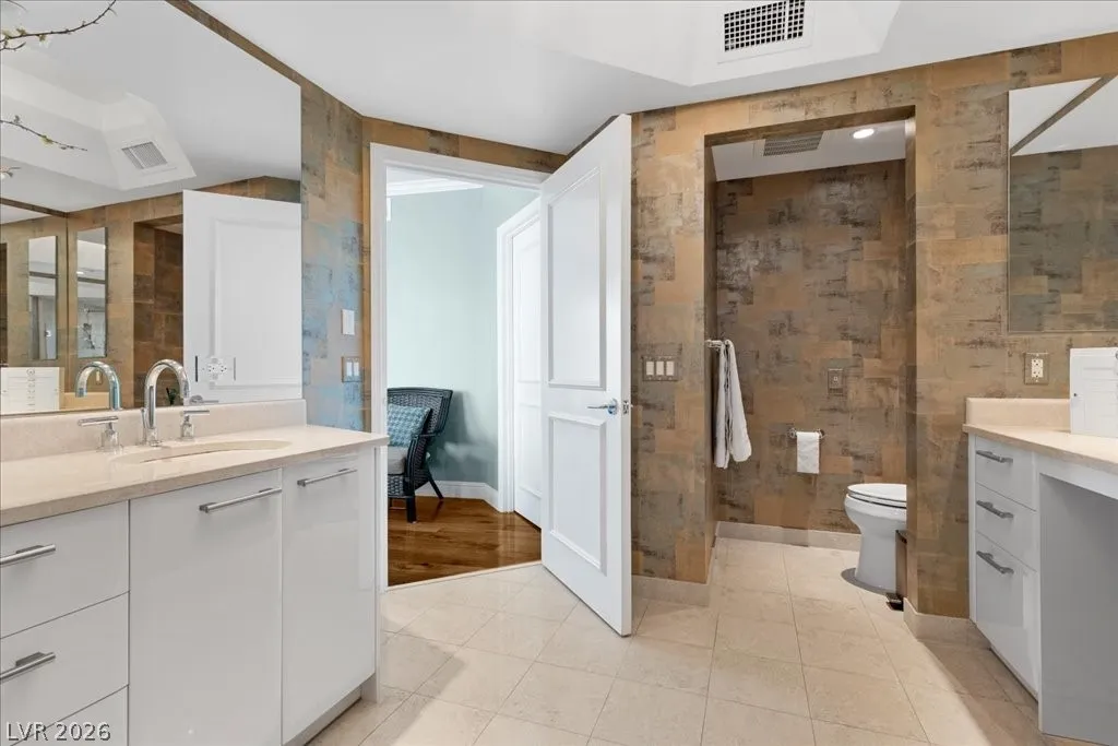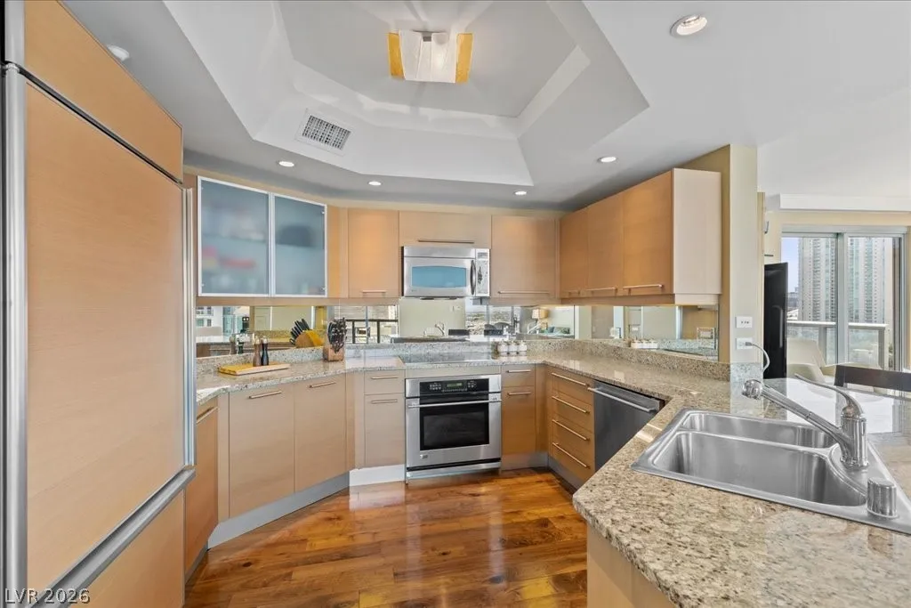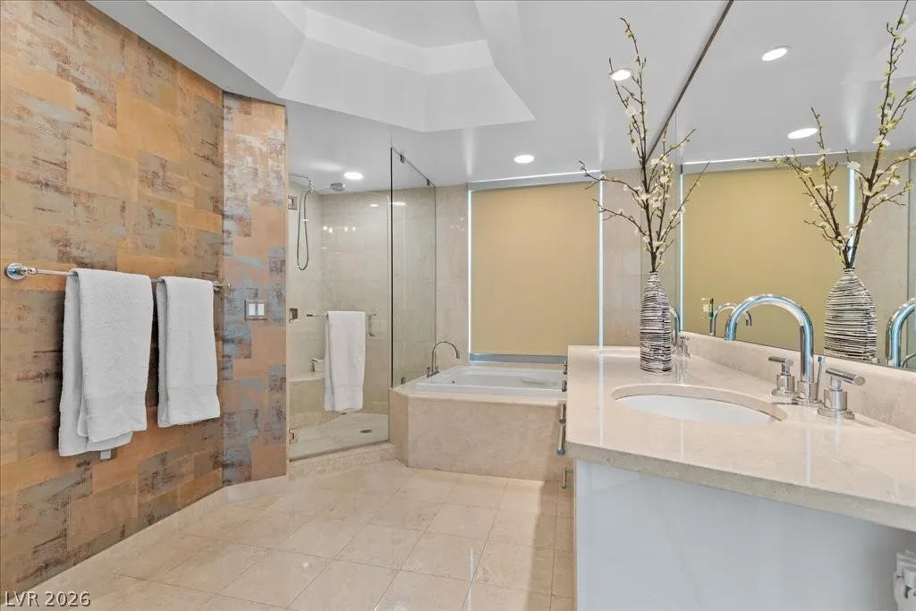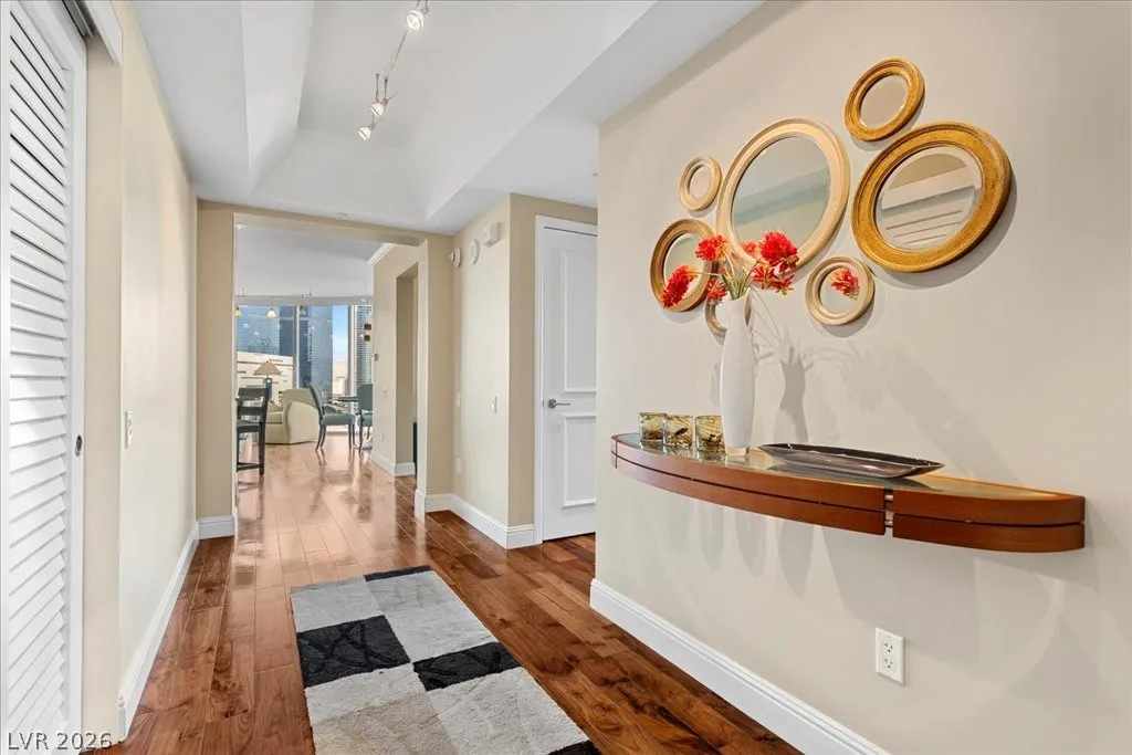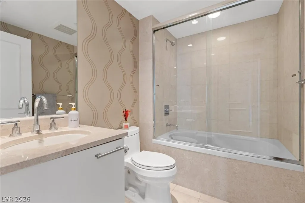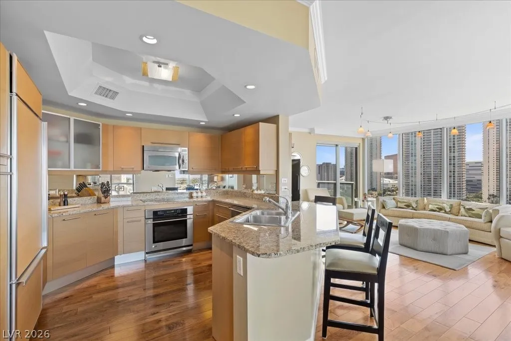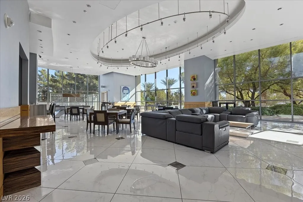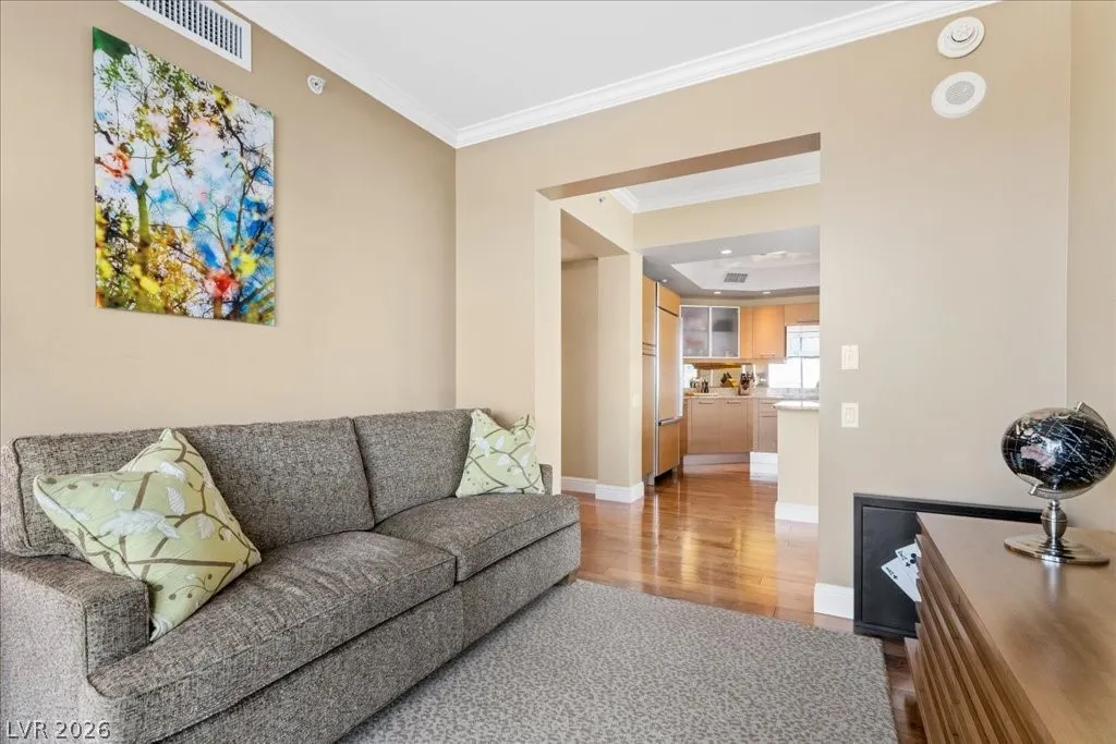 Residence 1608 at Turnberry Towers Las Vegas offers luxury high-rise living with panoramic views of the Las Vegas Strip, city skyline, and resort-style pool. This 2-bedroom + den, 2-bath condo features floor-to-ceiling windows, wood flooring, granite countertops, custom cabinetry, and stainless steel appliances. The open layout is ideal for entertaining, while the spacious primary suite includes terrace access and a marble spa-inspired bath. Timeless design in an iconic high rise in Las Vegas. Turnberry Towers is a guard-gated luxury high-rise community near the Strip, Fontainebleau Las Vegas, and the Las Vegas Convention Center. Amenities include resort-style pools, spa, fitness center, tennis and pickleball courts, valet, and 24-hour security. A premier Las Vegas luxury condo offering resort living in the heart of the city.