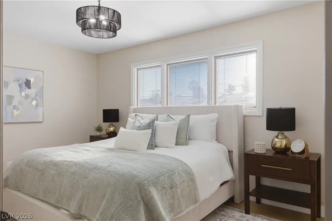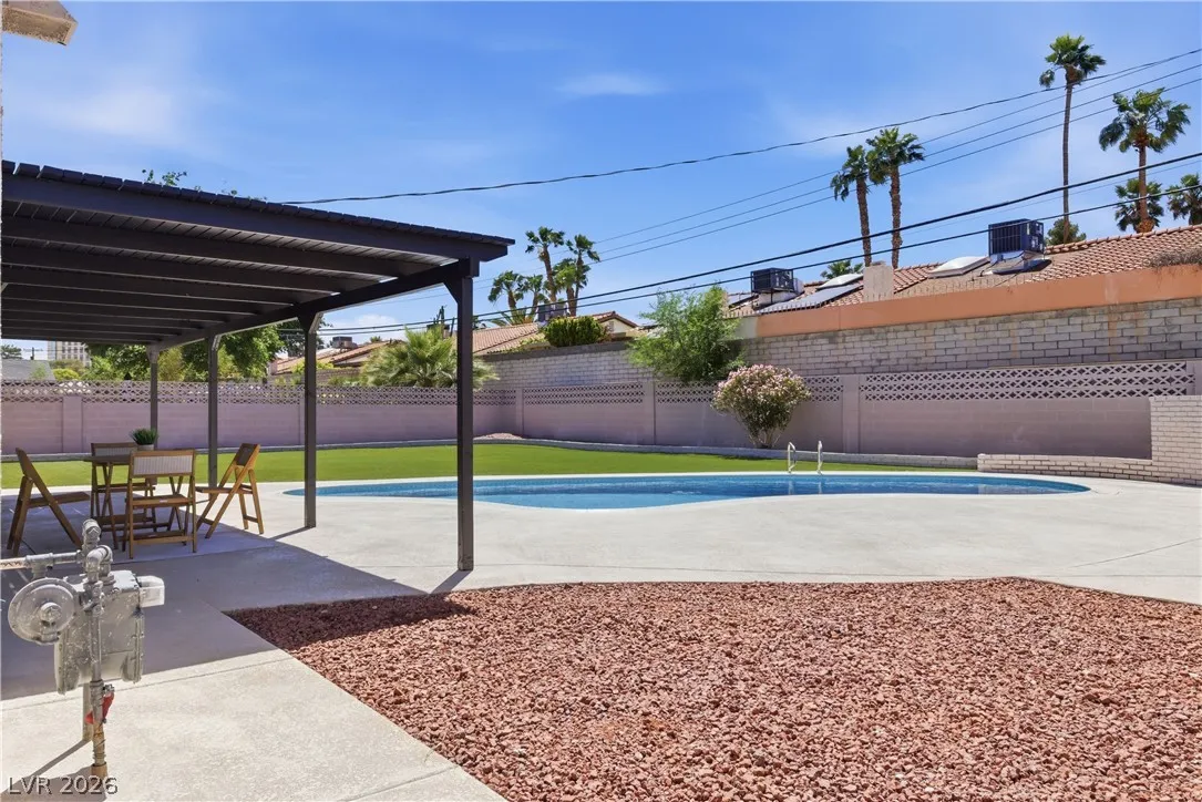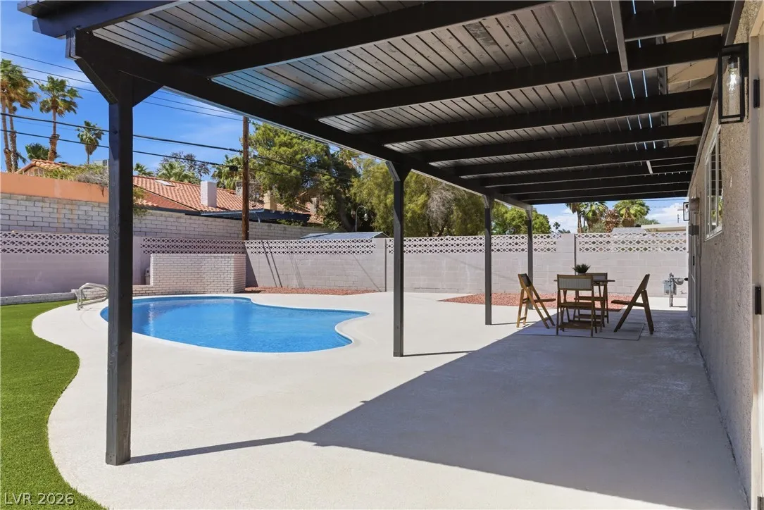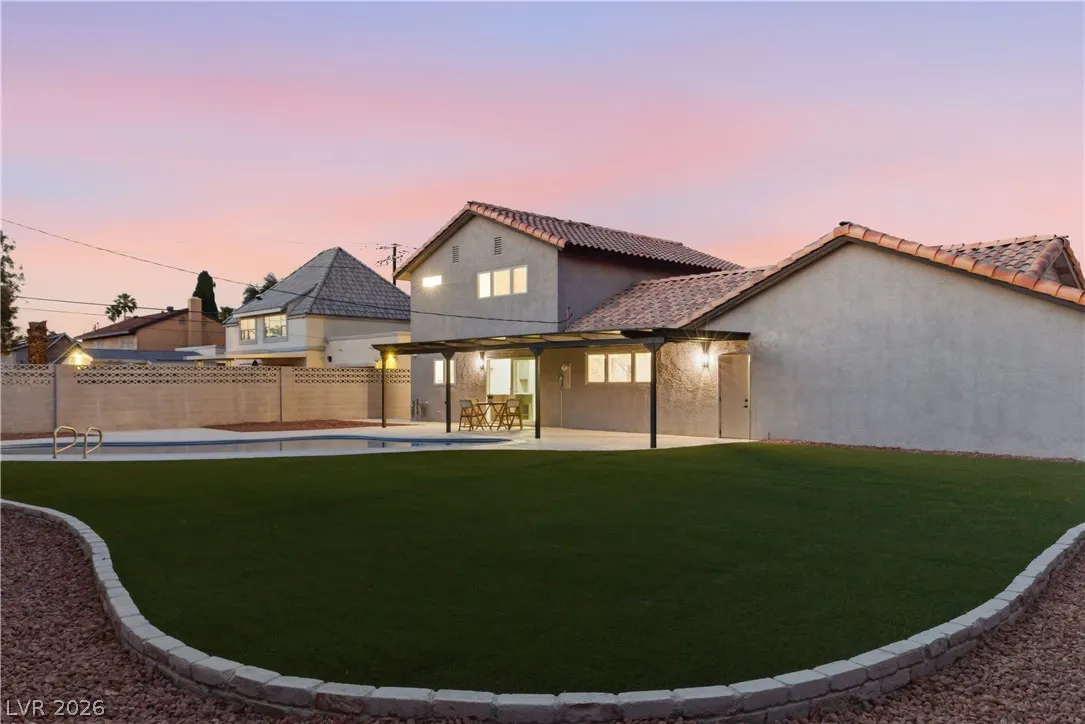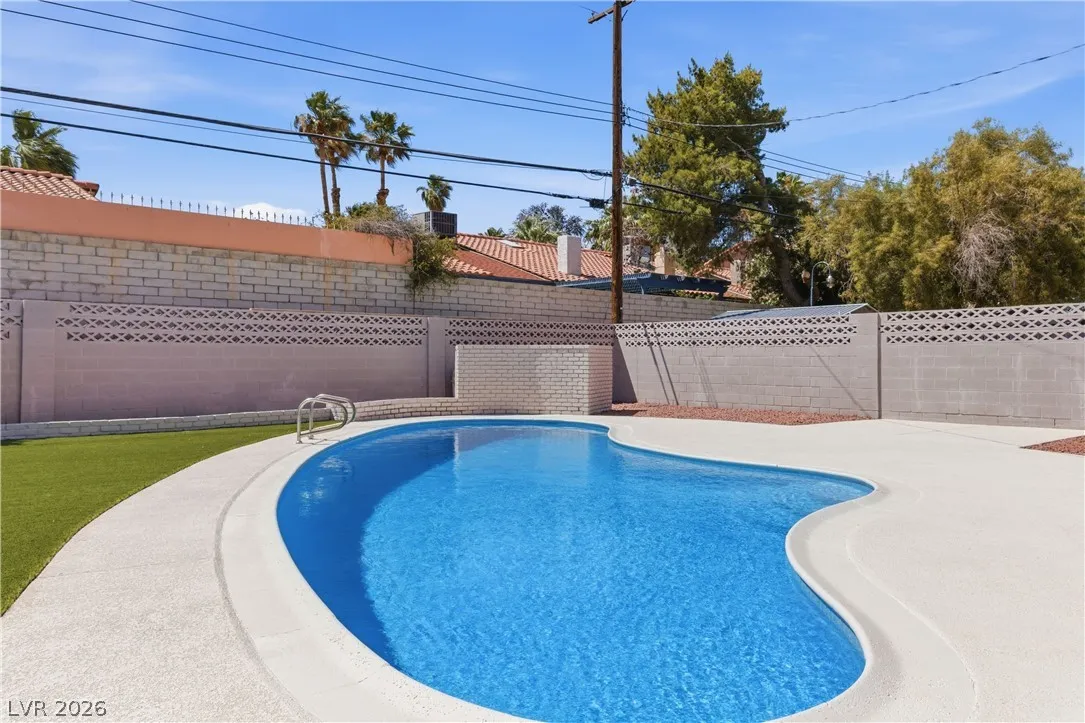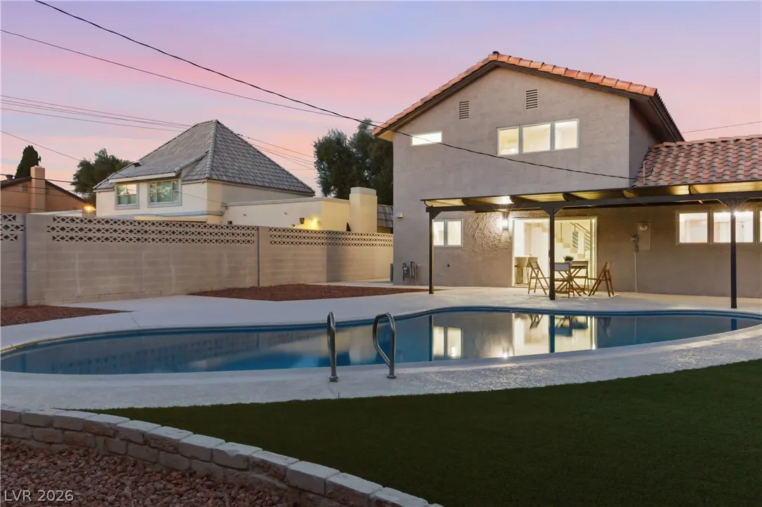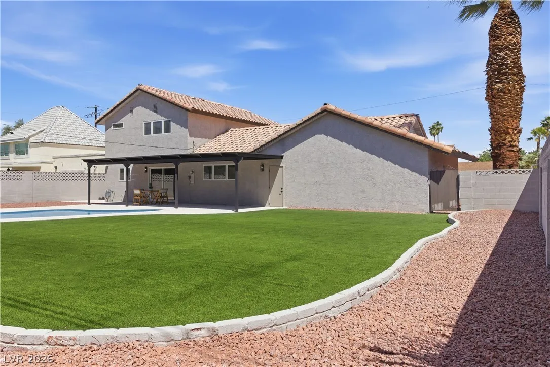 Conveniently located with quick access to Interstate 15 and less than 10 minutes from the world-class entertainment, dining, and casinos of Downtown Las Vegas and the Las Vegas Strip! This beautifully updated 2-story home features 3 bedrooms and a spacious backyard complete with a covered patio and in-ground pool—perfect for outdoor living and entertaining. Inside, the home offers abundant natural light and an open-concept floor plan enhanced by custom light fixtures, a tiled fireplace, plush carpeting, and laminate wood flooring throughout. The upgraded kitchen showcases garden views, recessed lighting, shaker-style cabinetry with modern hardware, custom countertops, stainless steel appliances, floating shelves, tiled backsplash, & a breakfast bar w/seating. Spa-inspired bathrooms feature dual vanities with framed mirrors, upgraded lighting, and modern tiled showers with built-in niches & rainfall shower heads. Move-in ready and designed for comfort and style—this home is a must-see!