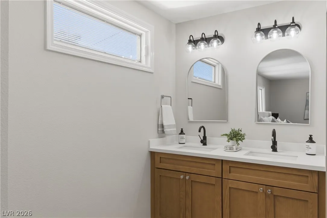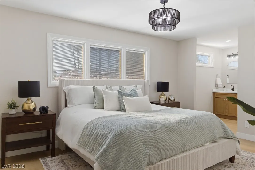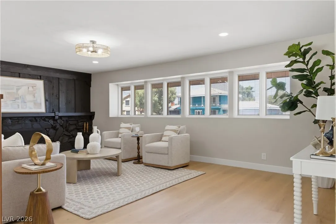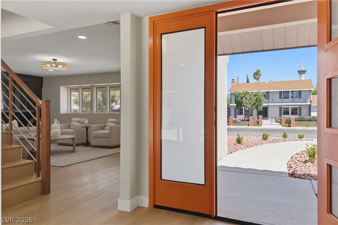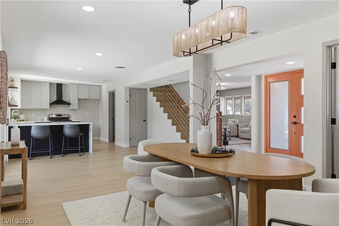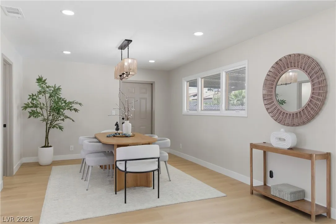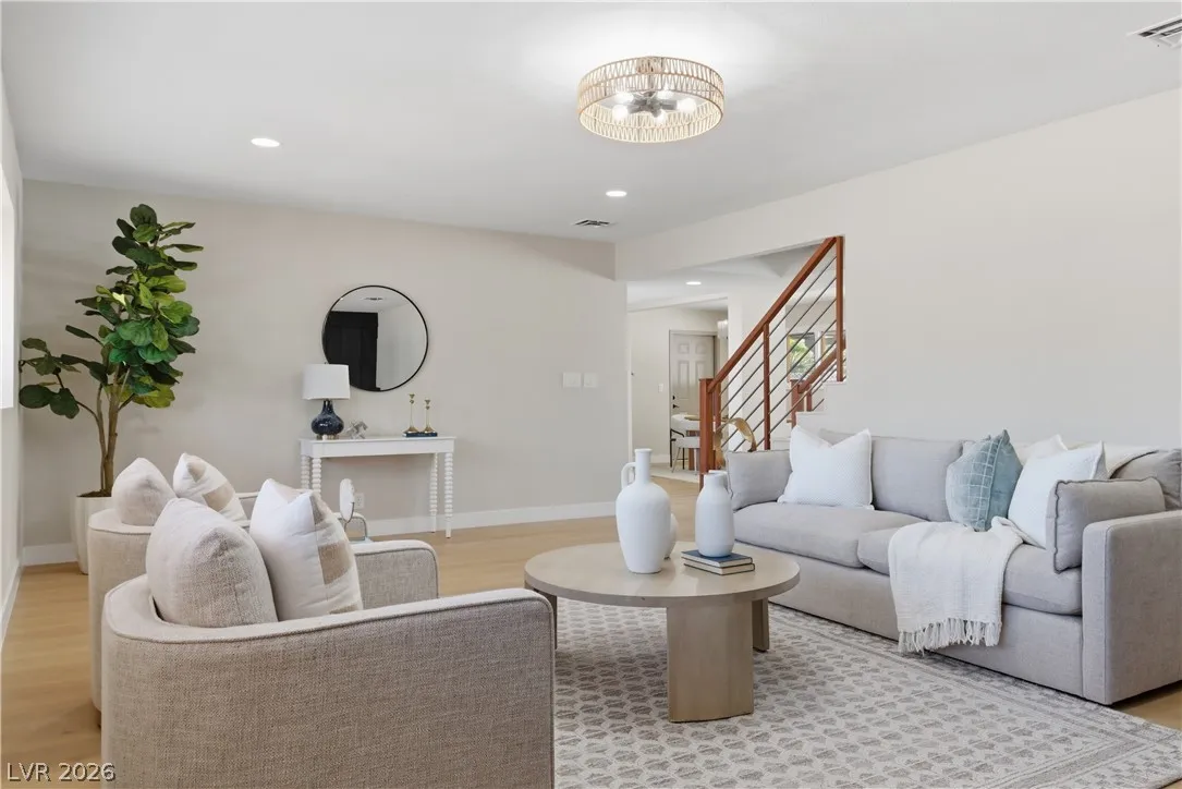 Conveniently located with quick access to Interstate 15 and less than 10 minutes from the world-class entertainment, dining, and casinos of Downtown Las Vegas and the Las Vegas Strip! This beautifully updated 2-story home features 3 bedrooms and a spacious backyard complete with a covered patio and in-ground pool—perfect for outdoor living and entertaining. Inside, the home offers abundant natural light and an open-concept floor plan enhanced by custom light fixtures, a tiled fireplace, plush carpeting, and laminate wood flooring throughout. The upgraded kitchen showcases garden views, recessed lighting, shaker-style cabinetry with modern hardware, custom countertops, stainless steel appliances, floating shelves, tiled backsplash, & a breakfast bar w/seating. Spa-inspired bathrooms feature dual vanities with framed mirrors, upgraded lighting, and modern tiled showers with built-in niches & rainfall shower heads. Move-in ready and designed for comfort and style—this home is a must-see!