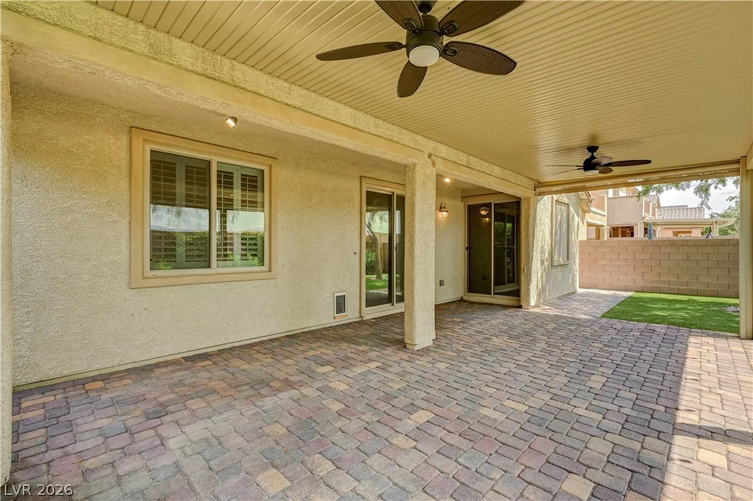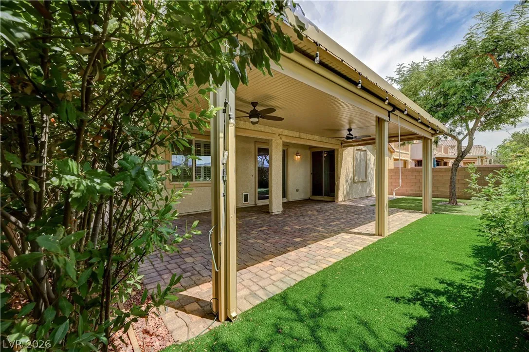 throughout the home.Gorgeous unobstructed backyard w/ turf, pavers & covered patio w/ fans for those
