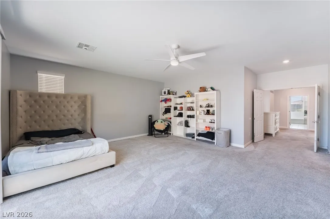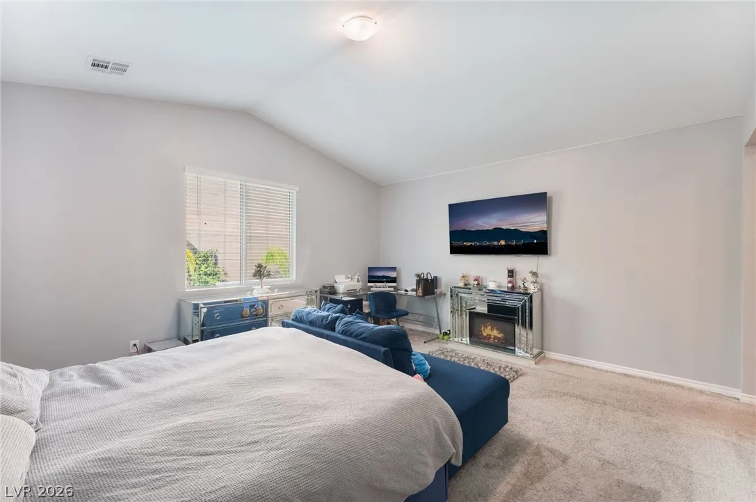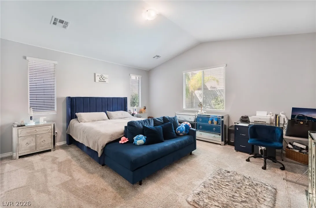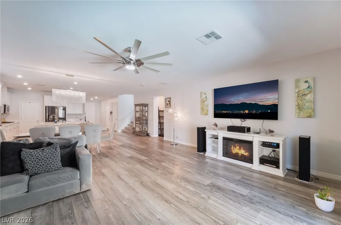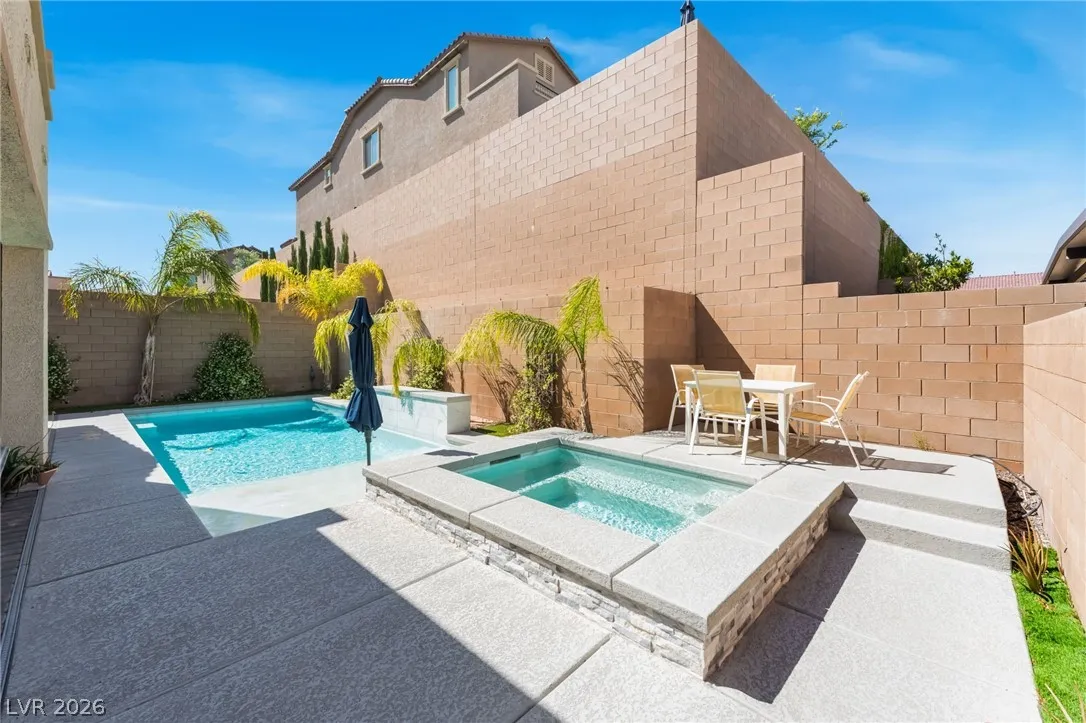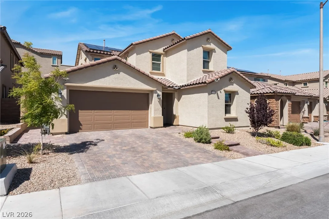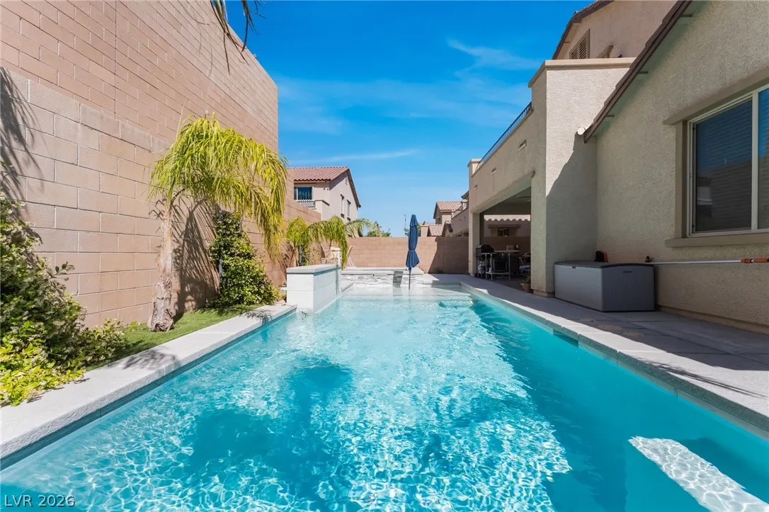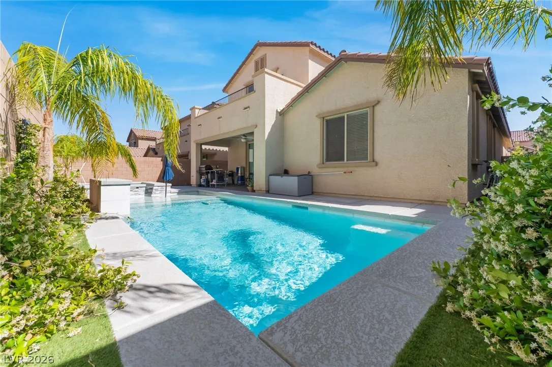 Step into luxury with this impressive five bedroom, four and a half bathroom residence nestled in the highly sought after Skye Canyon community. The primary suite is conveniently located on the main level, featuring a sophisticated bathroom and a private washer and dryer integrated directly into the walk in closet. The heart of the home is a sprawling gourmet kitchen equipped with elegant quartz countertops, stainless steel appliances, abundant cabinetry, and a spacious walk in pantry. The second floor offers generously sized bedrooms with walk in closets, alongside a versatile loft, a dedicated office, and a full laundry room. Outdoor living is a highlight, with a beautiful balcony perfect for seasonal relaxation and a spectacular inground pool in the backyard. Just a short walk from the community center, residents enjoy full access to premium Skye Canyon amenities in a location that perfectly blends comfort and convenience.