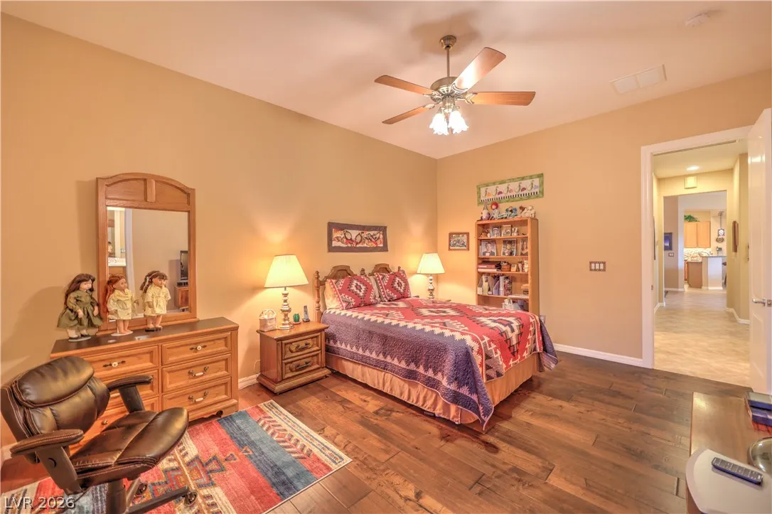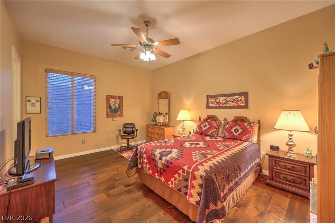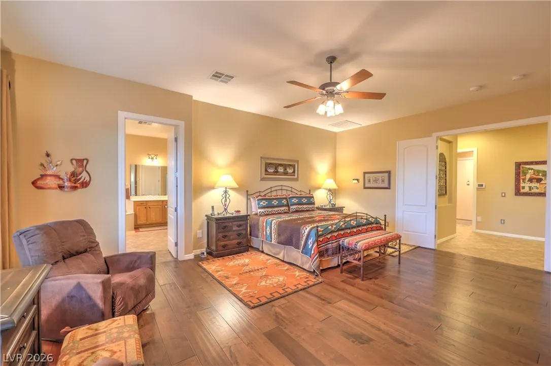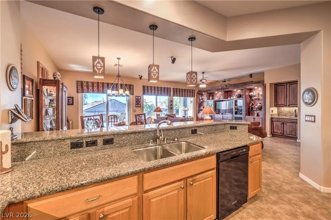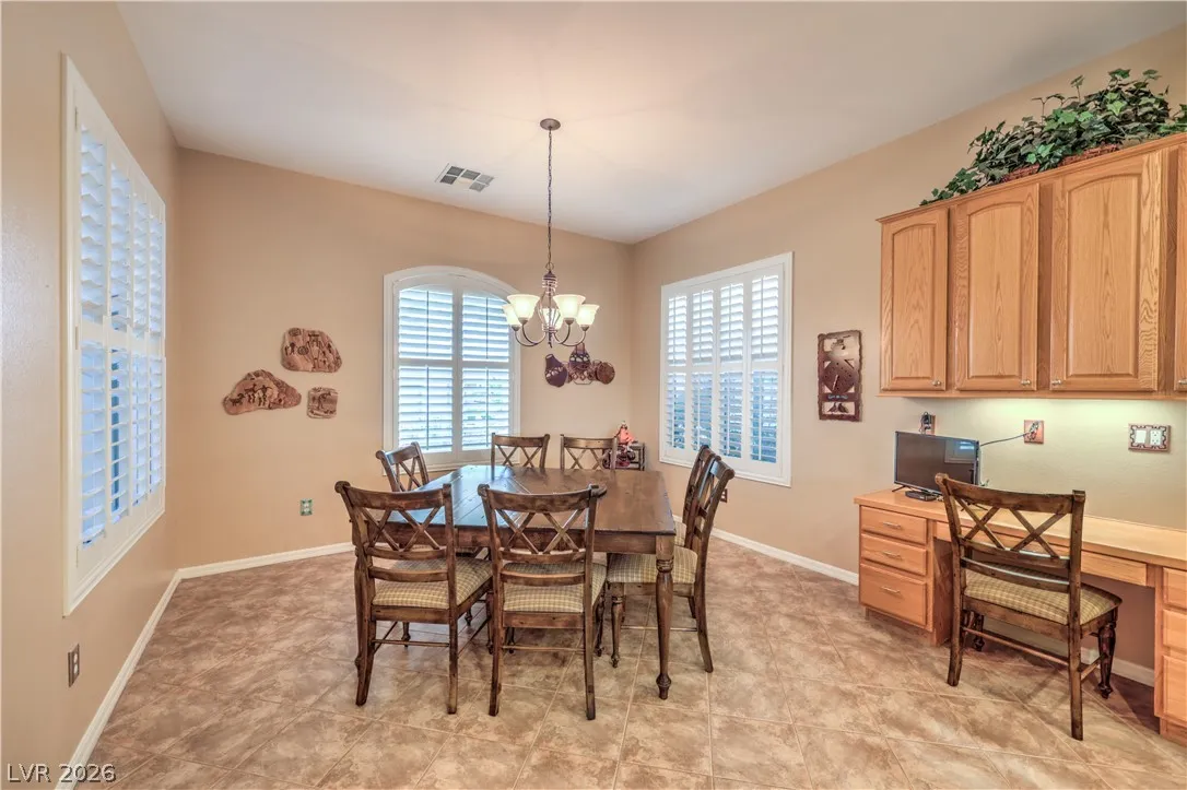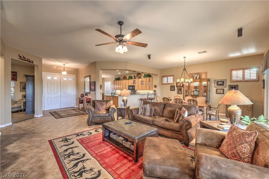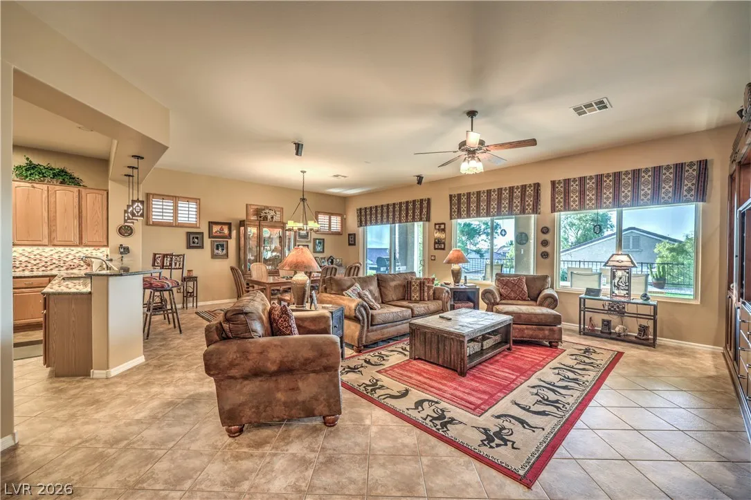 Spectacular Saratoga model on premium elevated lot with mountain views! Featuring 2 bedroom suites, den/office, 2.5 baths, & a 2.5 car garage. Gated courtyard entry with upgraded security doors leads to a spacious great room with celling fan, wet bar, surround sound, custom built-in, and tile flooring. Island kitchen boasts granite countertops, upgraded cabinets w/pull-pot shelves & under cabinet lighting, pendant lights, breakfast bar, nook, and pantry. Owner’s suite w/ ceiling fan, sitting area, walk-in closet, patio access, & luxurious bathroom. Jr suite w/ceiling fan, walk-in closet, & private bath. Den w/ ceiling fan & porcelain tile flooring, guest powder bath, laundry room w/ utility sink, two Lennox HVAC systems (Oct 2025), exterior paint (Aug 2025), plantation shutters, water conditioning system, solar screens, & security features. Backyard features a covered patio w/ pergola extension, ceiling fans, & low-maintenance landscaping. Premier 55+ community with top-tier amenities!