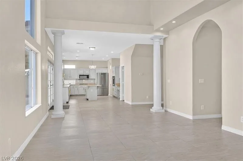 Located in the guard gated community of Grand Legacy in Henderson, this six bedroom, four bathroom home offers over 3,900 square feet with a layout that’s both open and functional. The kitchen sits at the center of the home with stainless steel appliances, ample counter space, and plenty of cabinetry, flowing easily into the main living areas. The bedroom count provides flexibility for a variety of needs, including work from home or multigenerational living along with a ton of storage throughout.. The primary suite is well sized with generous closet space and a comfortable, private feel. The backyard features a pool and spa, creating an easy space to relax or entertain. With its size, location, and overall layout, this property