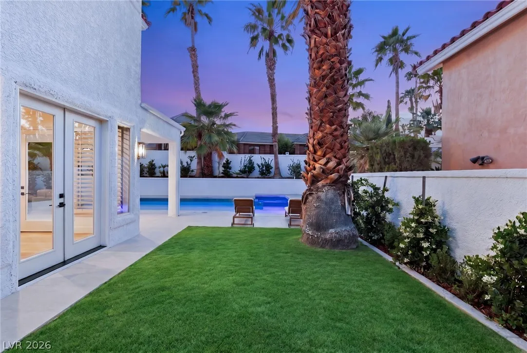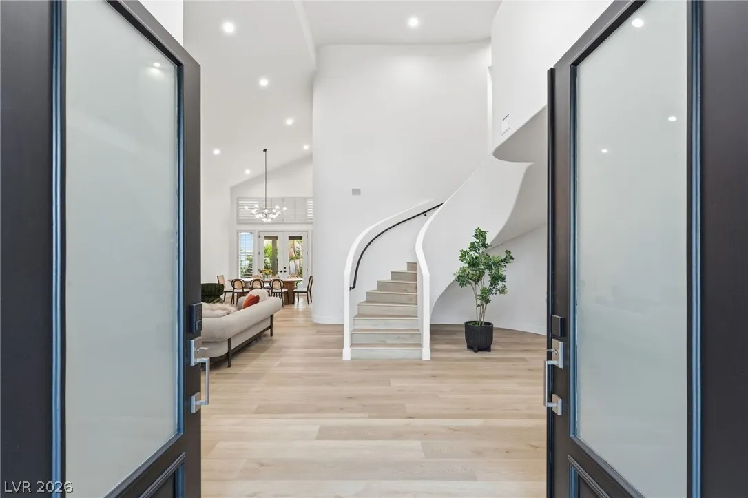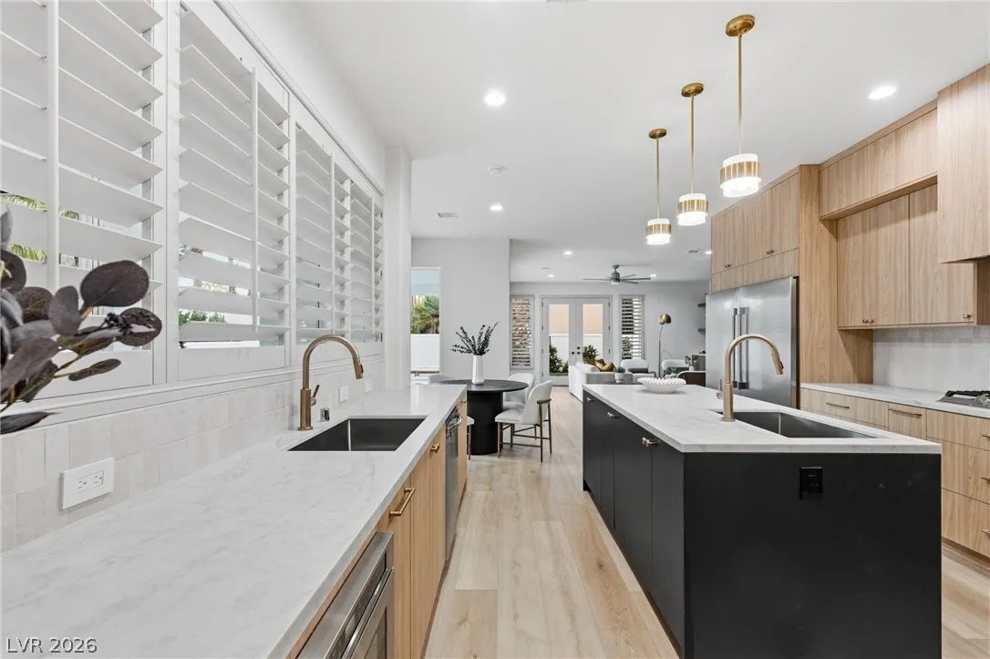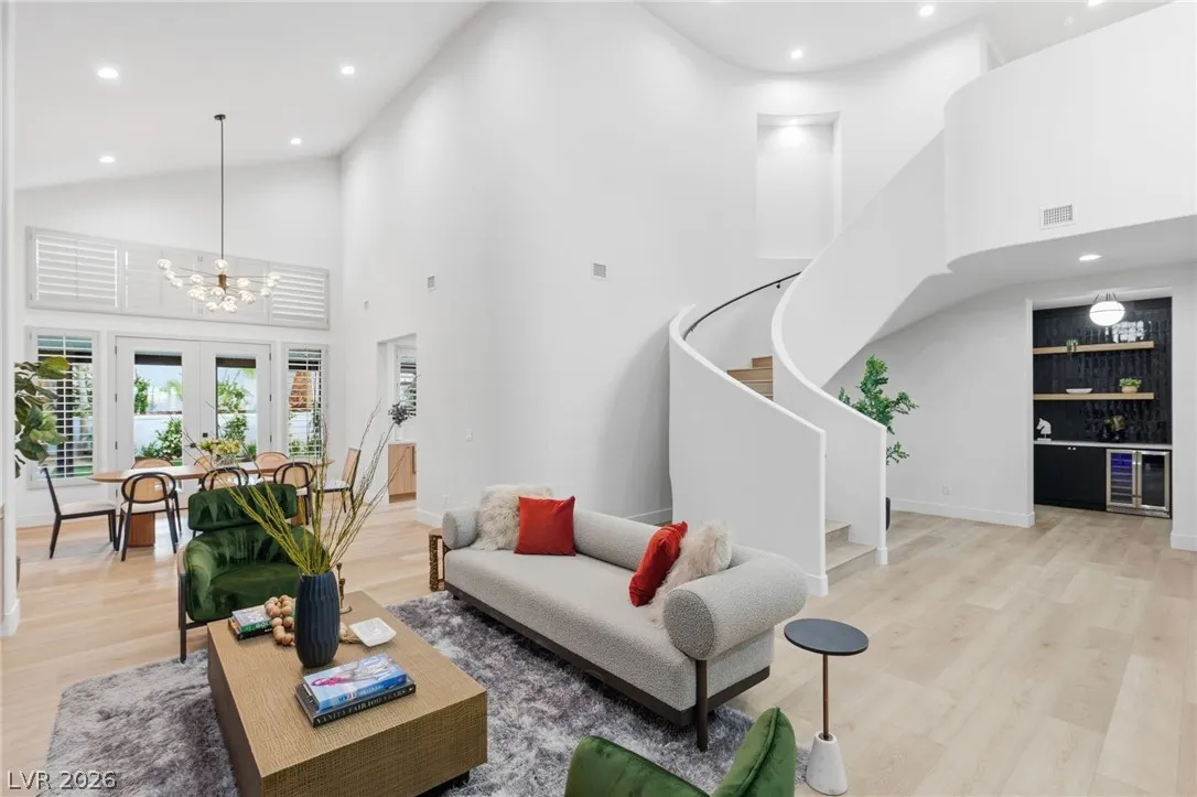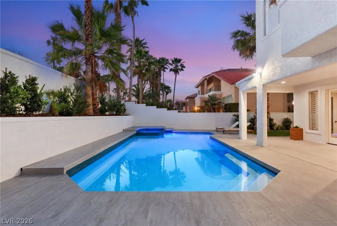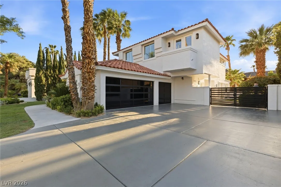 Reimagined with a modern edge, this 2-story luxury home offers 4,202 sq ft, 4 bedrooms, 4 baths, and a 3-car garage in guard-gated Canyon Gate Club. An abundance of natural light highlights new flooring, custom built-ins, updated fireplaces, and sleek designer finishes throughout. The chef’s kitchen features top-of-the-line appliances, commercial-grade fridge/freezer, new sinks, and quartz countertops. The primary suite delivers a spa-like experience with a freestanding soaking tub, oversized dual-entry shower with two systems, and custom floor-to-ceiling closet. Outdoors, enjoy a redesigned pool and spa, new landscaping, built-in BBQ, and covered patio with awning. With new front and garage doors and refined upgrades throughout, this is a rare opportunity to own a fully renovated home in one of Las Vegas’ most established golf course communities.