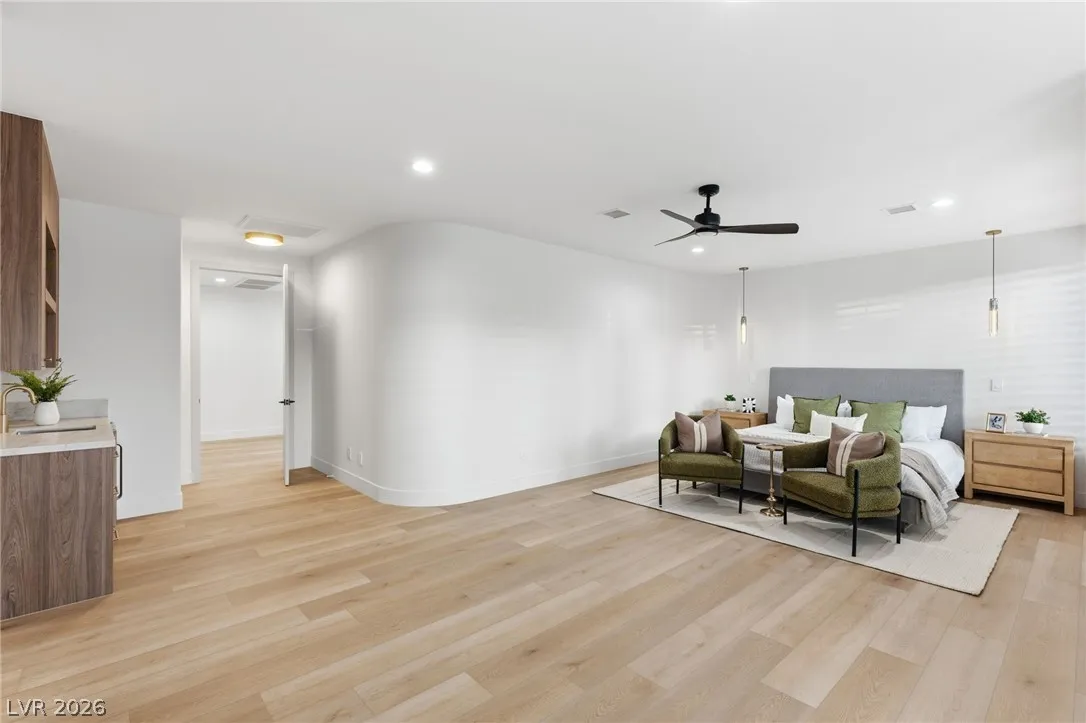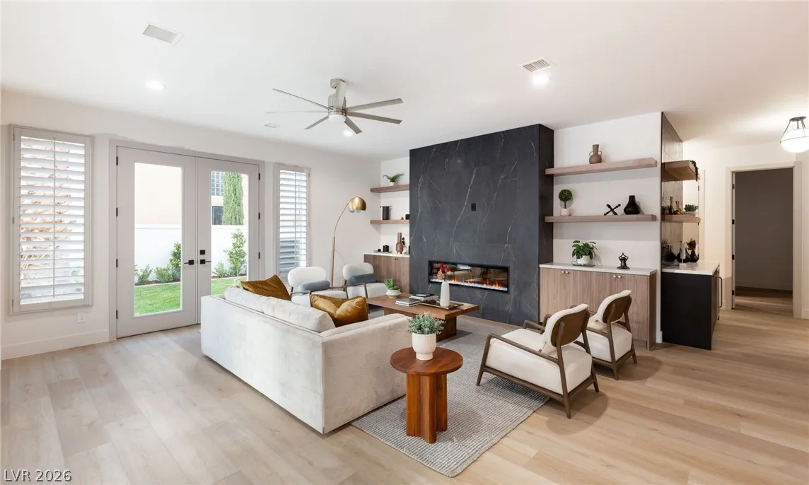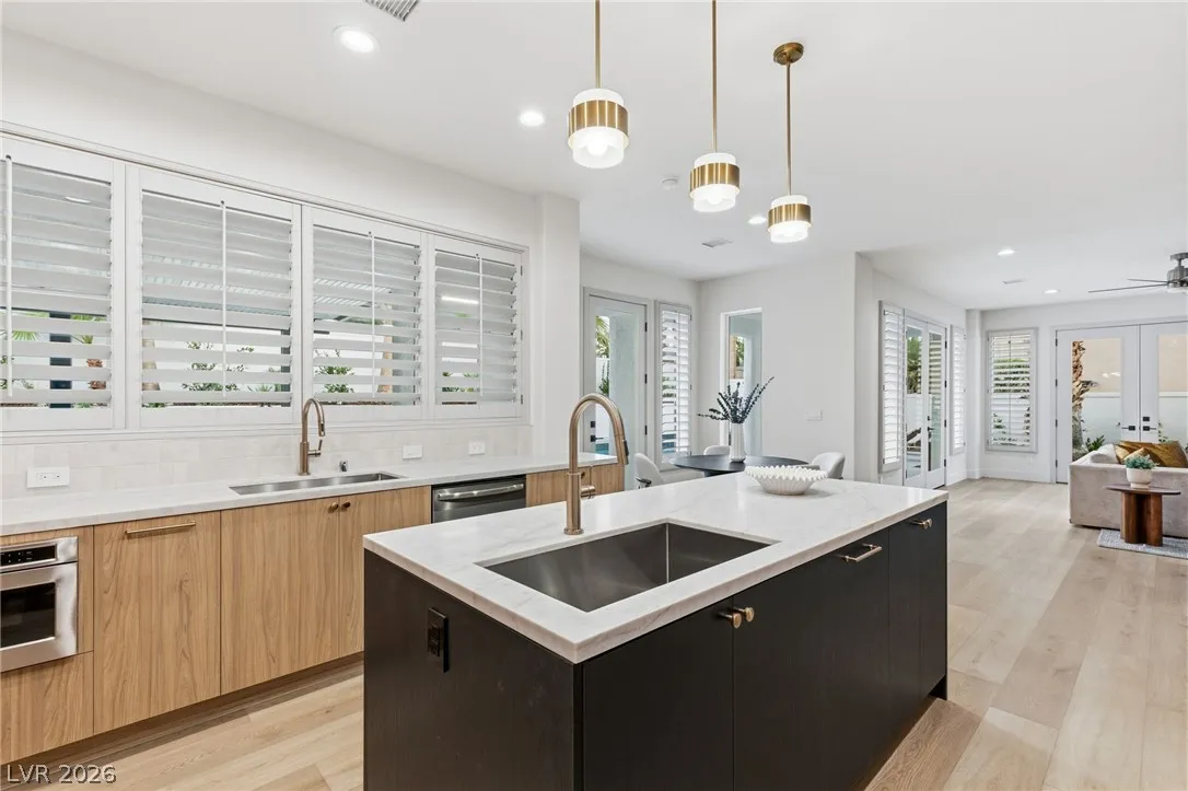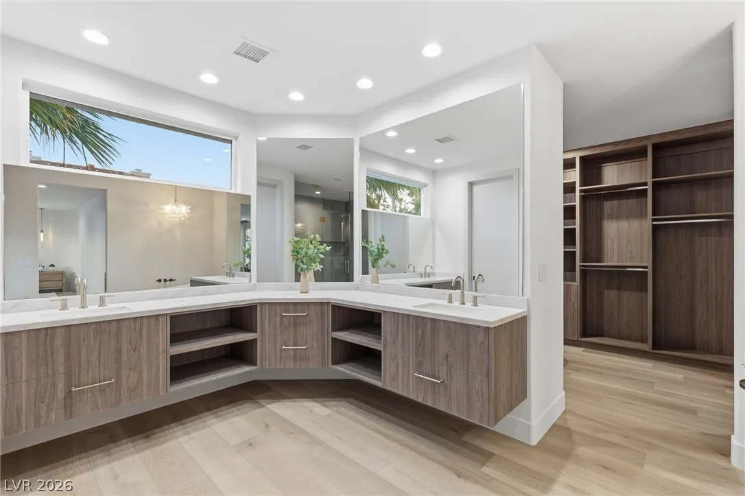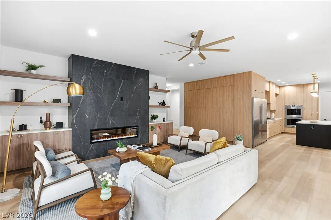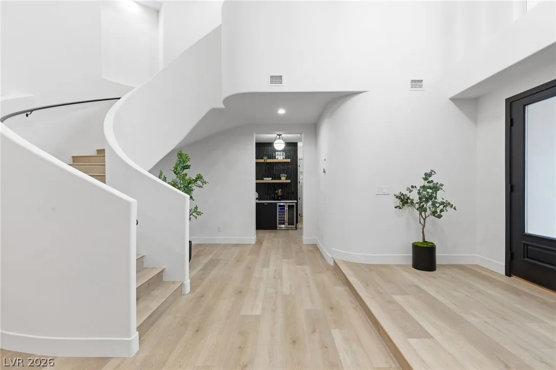 Reimagined with a modern edge, this 2-story luxury home offers 4,202 sq ft, 4 bedrooms, 4 baths, and a 3-car garage in guard-gated Canyon Gate Club. An abundance of natural light highlights new flooring, custom built-ins, updated fireplaces, and sleek designer finishes throughout. The chef’s kitchen features top-of-the-line appliances, commercial-grade fridge/freezer, new sinks, and quartz countertops. The primary suite delivers a spa-like experience with a freestanding soaking tub, oversized dual-entry shower with two systems, and custom floor-to-ceiling closet. Outdoors, enjoy a redesigned pool and spa, new landscaping, built-in BBQ, and covered patio with awning. With new front and garage doors and refined upgrades throughout, this is a rare opportunity to own a fully renovated home in one of Las Vegas’ most established golf course communities.