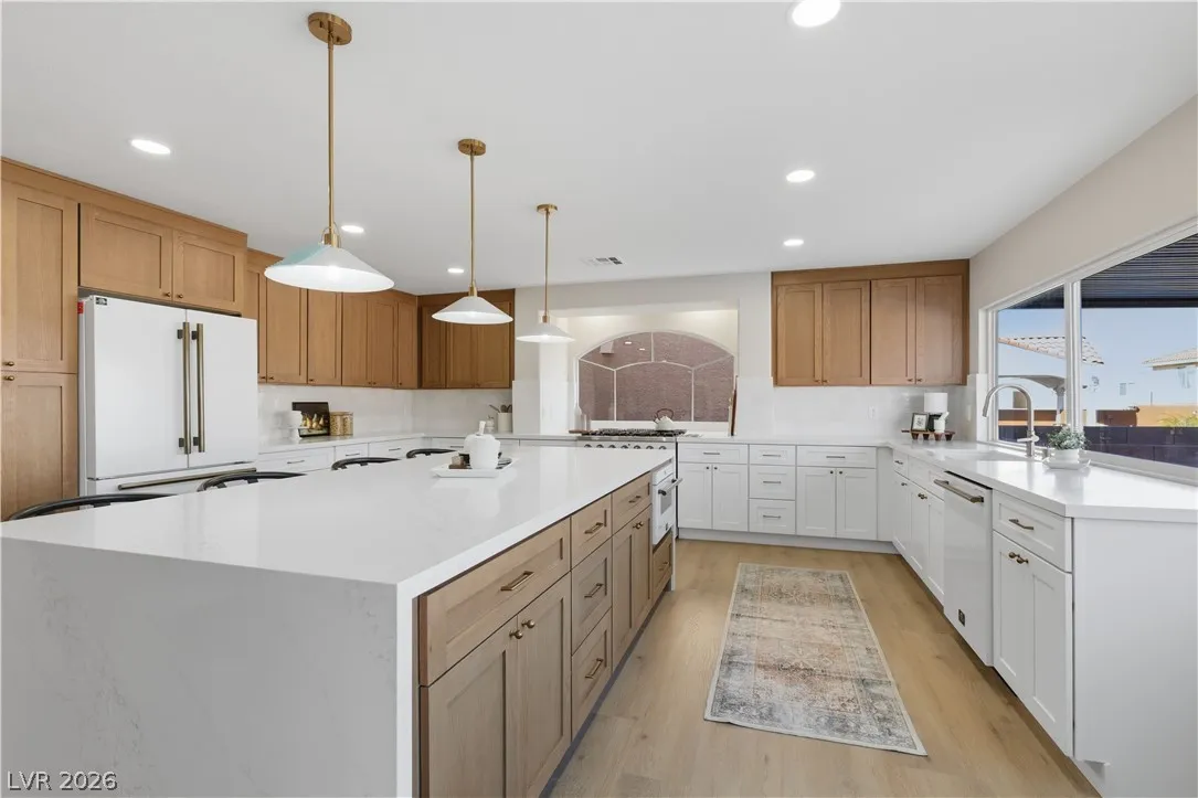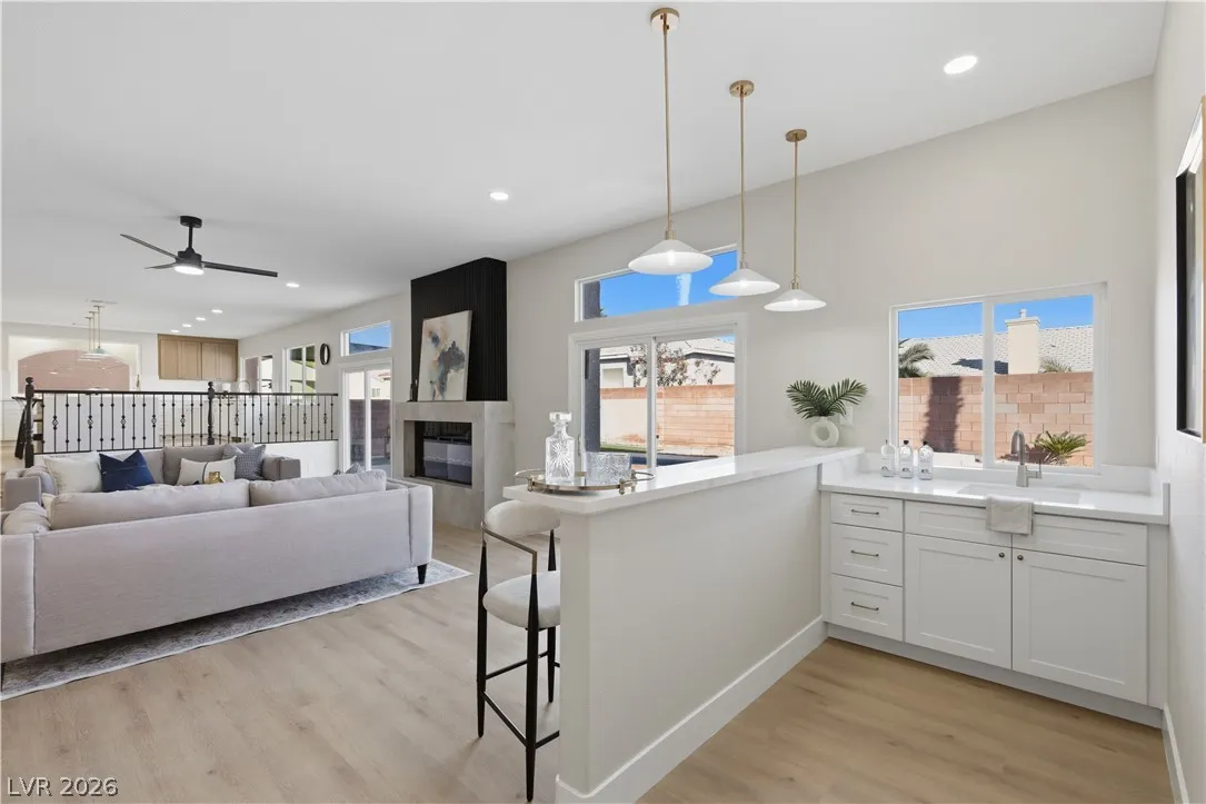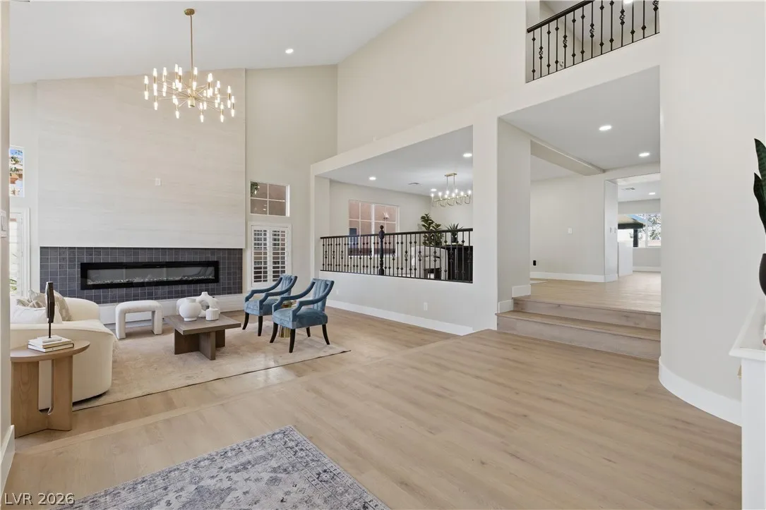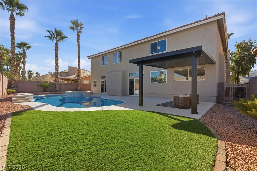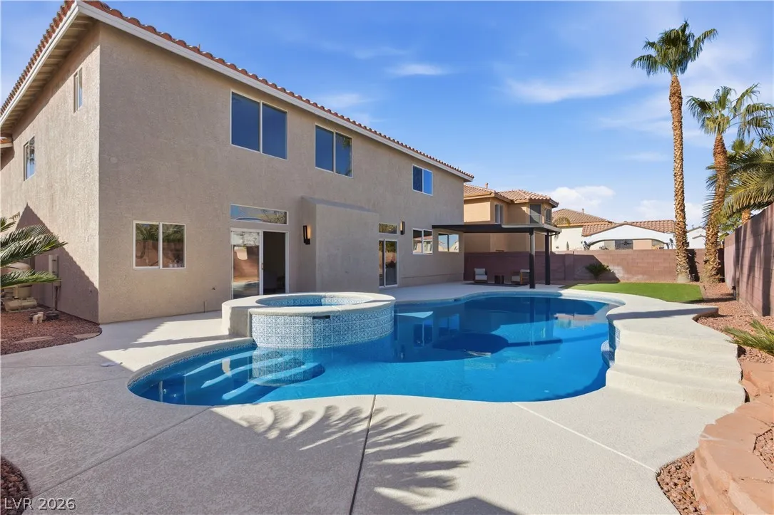 Enjoy the stunning remodeled, 2-story home featuring 6 bed. loft & a basement, nestled within the sought after gated community of Coronado Ranch. Designed for elevated living and refined entertaining, the property offers a private backyard w/ a covered patio, in-ground pool & spa, a 3-car garage, balcony & elegant custom-paved driveway. The interior is filled w/natural light, showcases vaulted ceilings, chandeliers, modern lighting, tiled fireplaces, custom built-ins, and a wet bar w/seating. Plush carpeting & laminate wood flooring create a seamless blend of comfort and contemporary style. The kitchen is a true centerpiece with custom oak cabinetry, quartz countertops, premium stainless steel appliances, recessed lighting, a cooktop w/ garden views, and a waterfall-edge island. Spa-inspired baths feature dual vanities, framed mirrors, modern lighting, separate soaking tub in primary,custom-tiled showers w/built-in niches & rainfall shower heads. Beautifully finished & move-in ready!