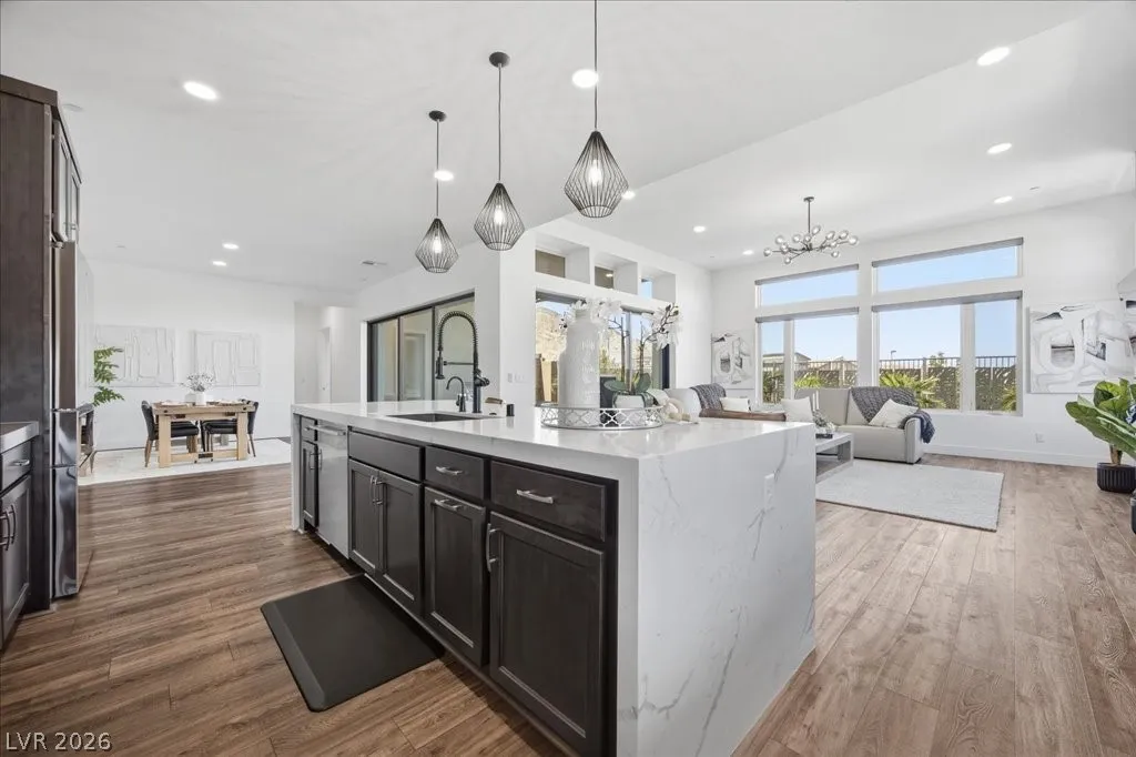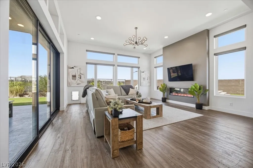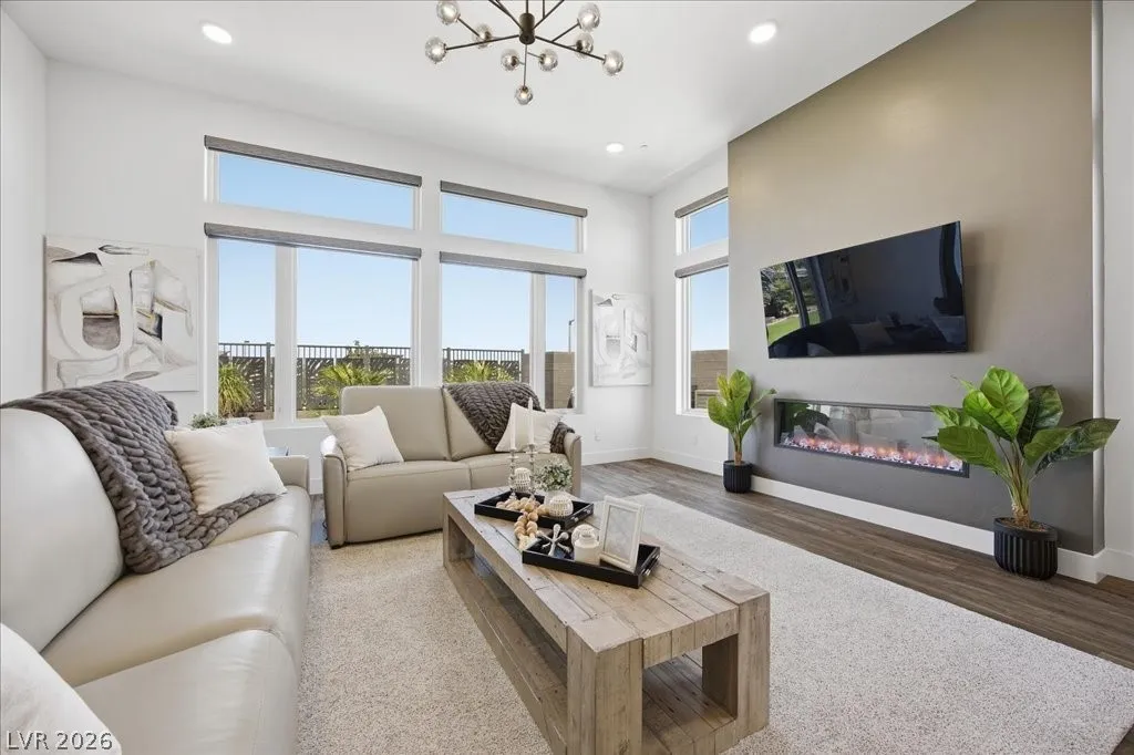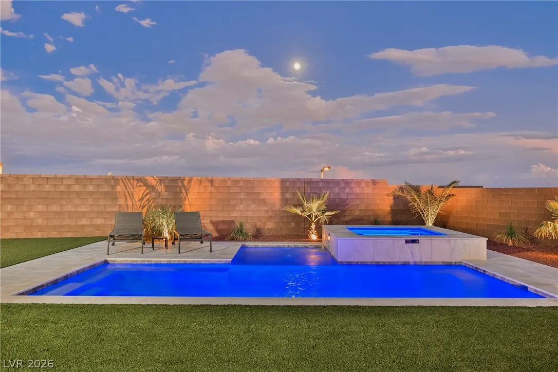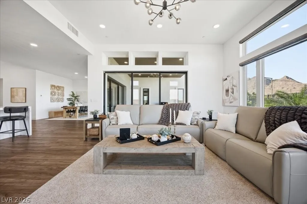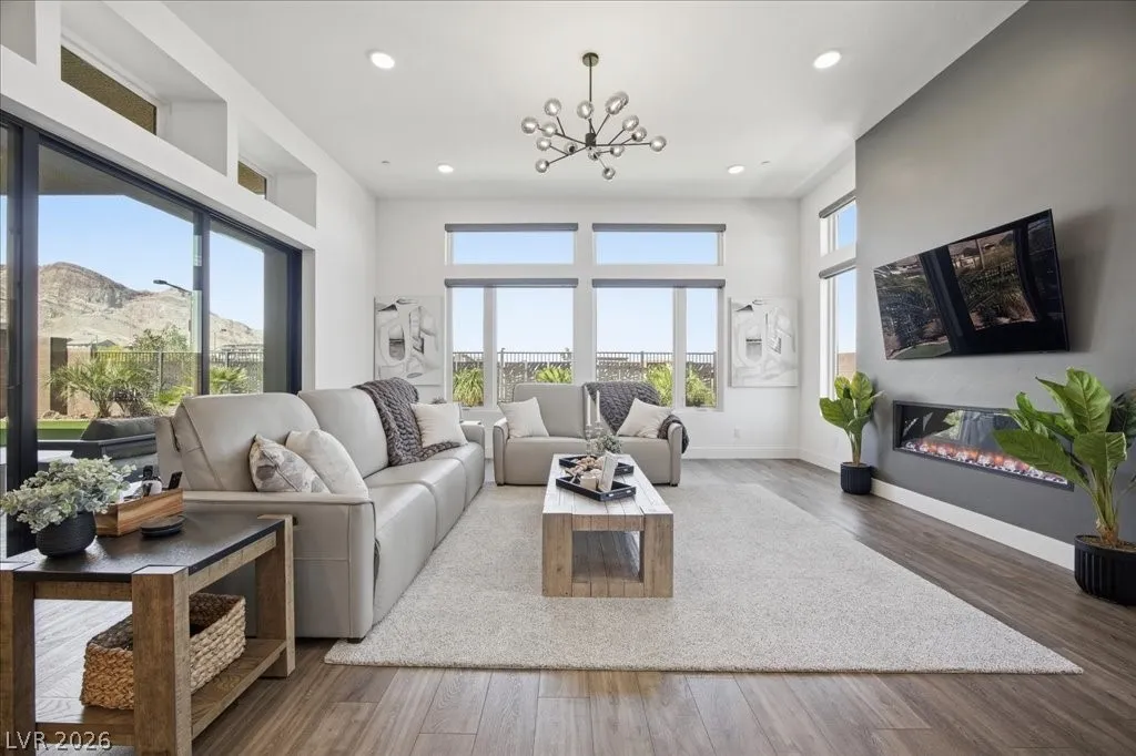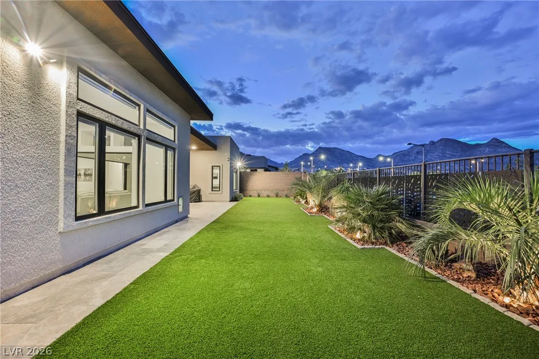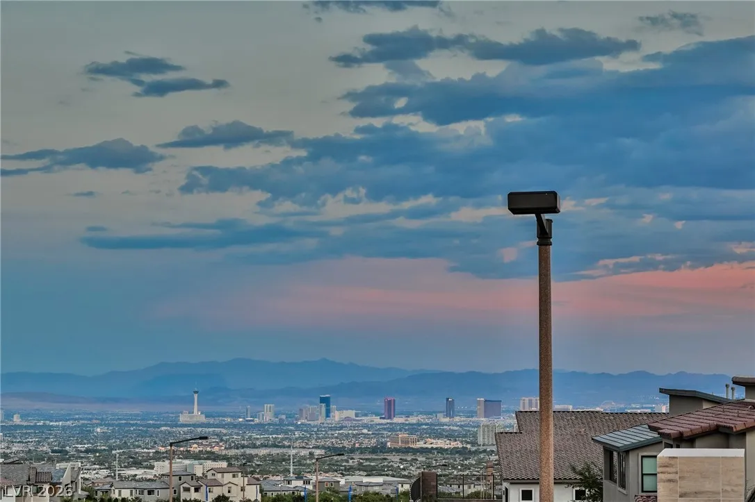 Modern single-story in the highly coveted Overlook Community of Summerlin West! Perched on a 1/3-acre elevated lot, this home offers sweeping mountain views along with partial city and Strip views. The floorplan features 4 spacious bedrooms in separate wings, including a primary suite with stunning mountain views. Designer finishes include a waterfall-edge quartz island, Monogram stainless-steel appliances with wine fridge, tankless water heater, whole-home water conditioner, and a 3-car garage with epoxy floors.The backyard is an entertainer’s dream with a travertine-finished pool with automated features and professional landscape lighting. Conveniently located near the Paseo walking trail, top-rated schools, parks, and just minutes from Downtown Summerlin’s shopping, dining, and entertainment. Welcome home!
