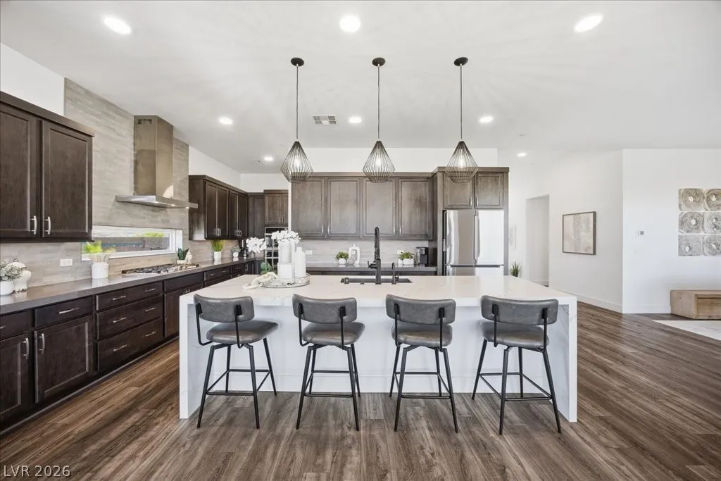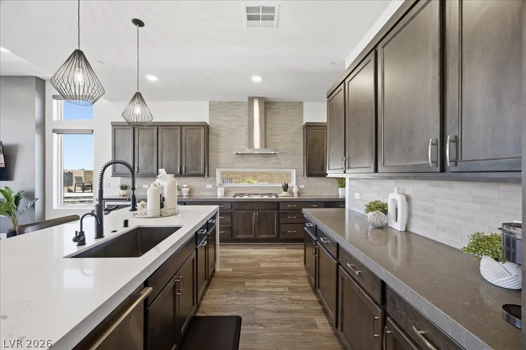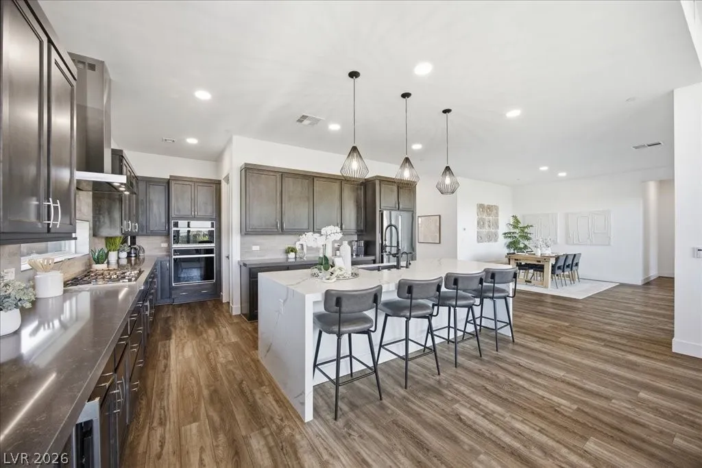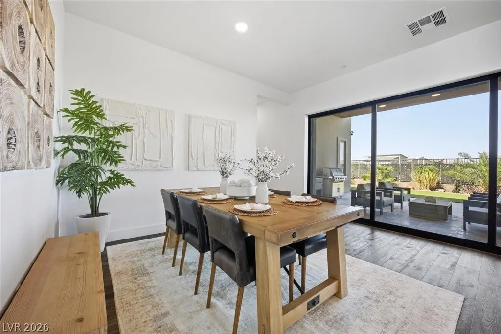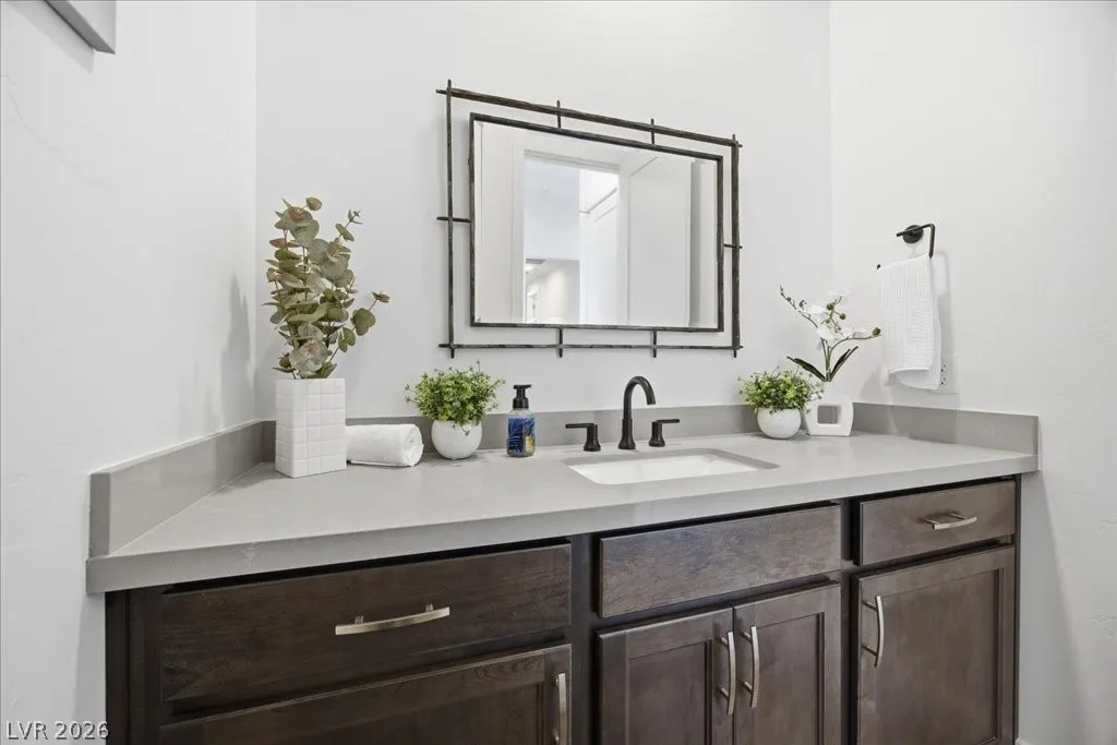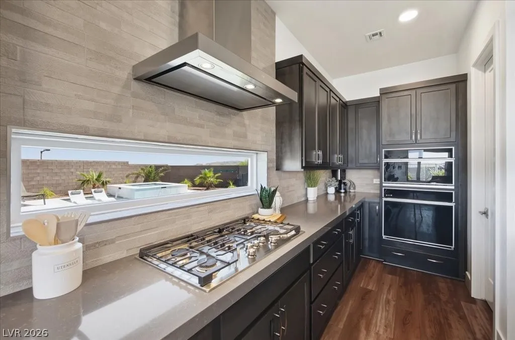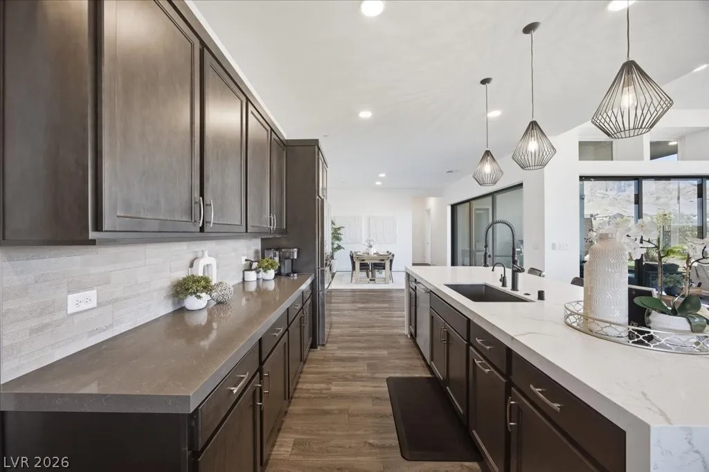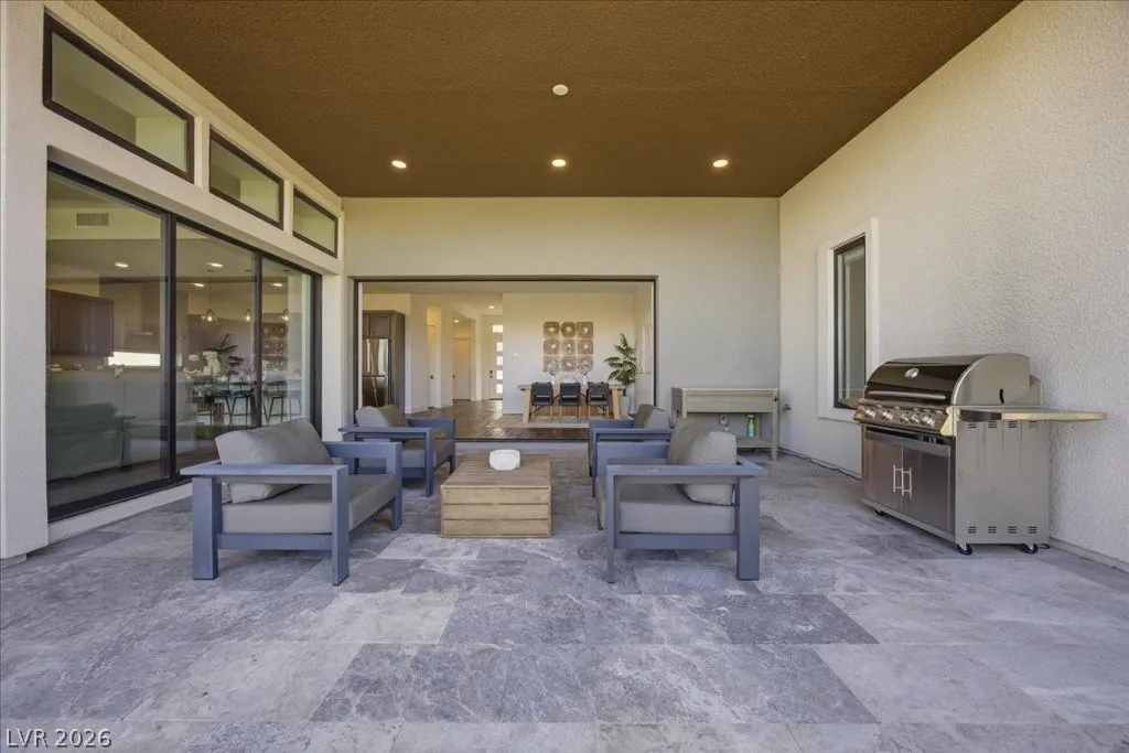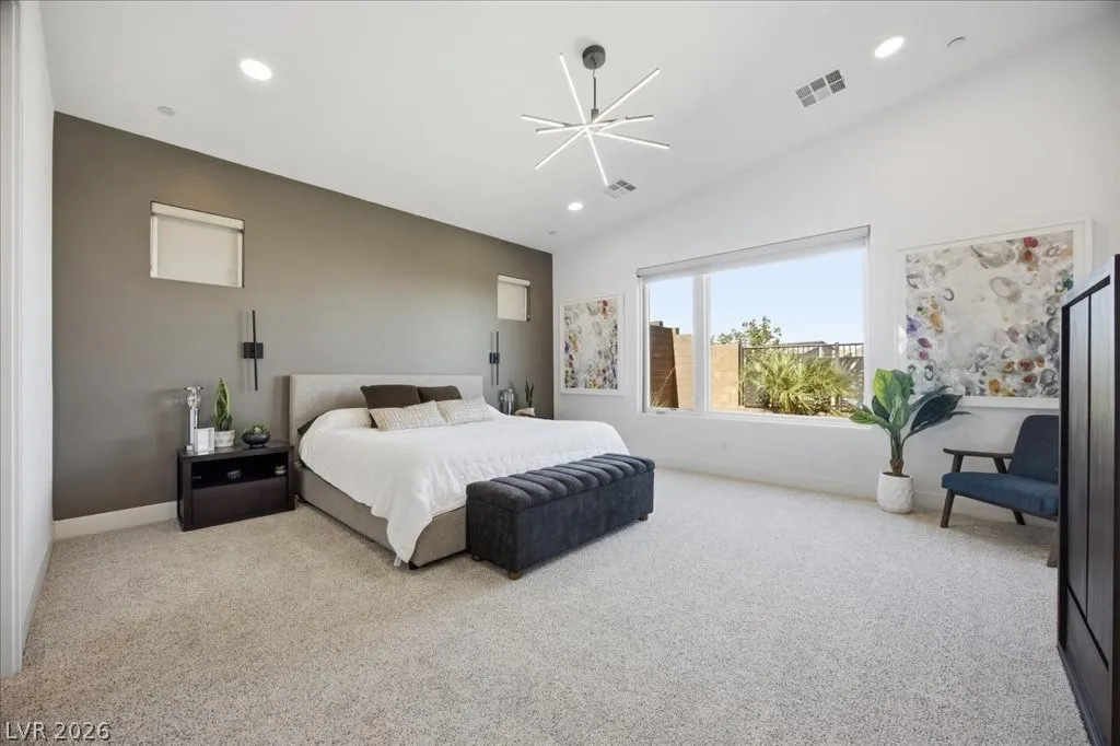 Modern single-story in the highly coveted Overlook Community of Summerlin West! Perched on a 1/3-acre elevated lot, this home offers sweeping mountain views along with partial city and Strip views. The floorplan features 4 spacious bedrooms in separate wings, including a primary suite with stunning mountain views. Designer finishes include a waterfall-edge quartz island, Monogram stainless-steel appliances with wine fridge, tankless water heater, whole-home water conditioner, and a 3-car garage with epoxy floors.The backyard is an entertainer’s dream with a travertine-finished pool with automated features and professional landscape lighting. Conveniently located near the Paseo walking trail, top-rated schools, parks, and just minutes from Downtown Summerlin’s shopping, dining, and entertainment. Welcome home!
