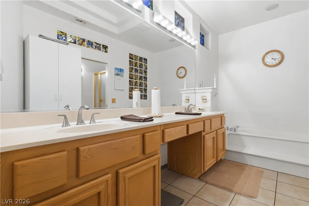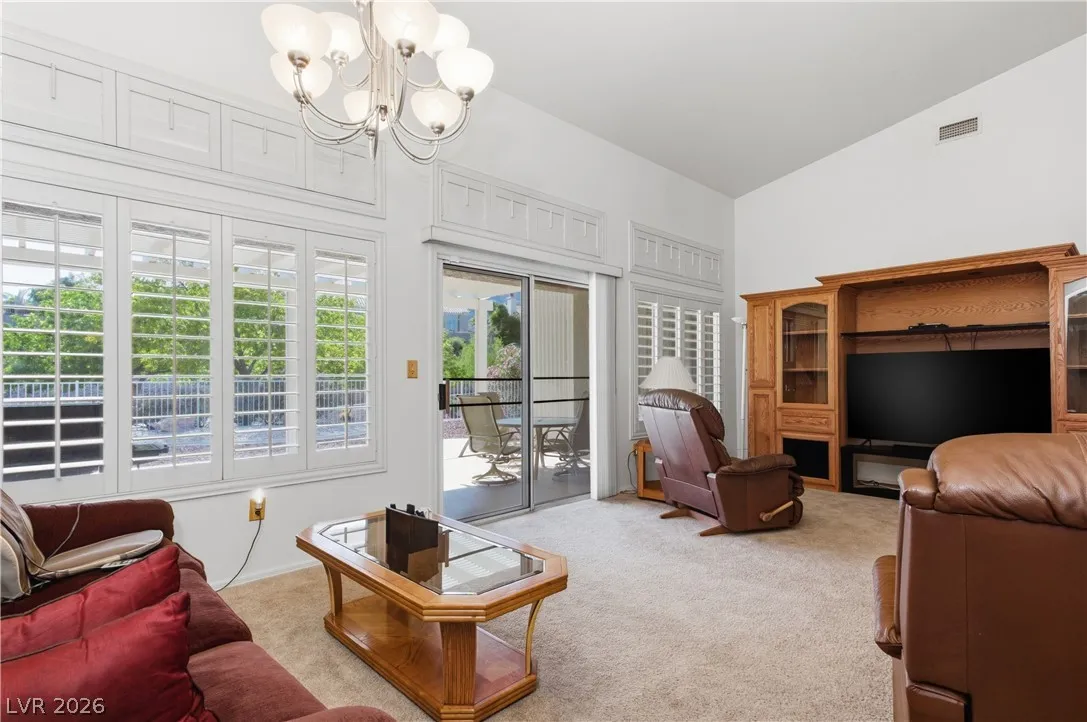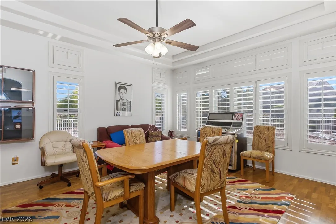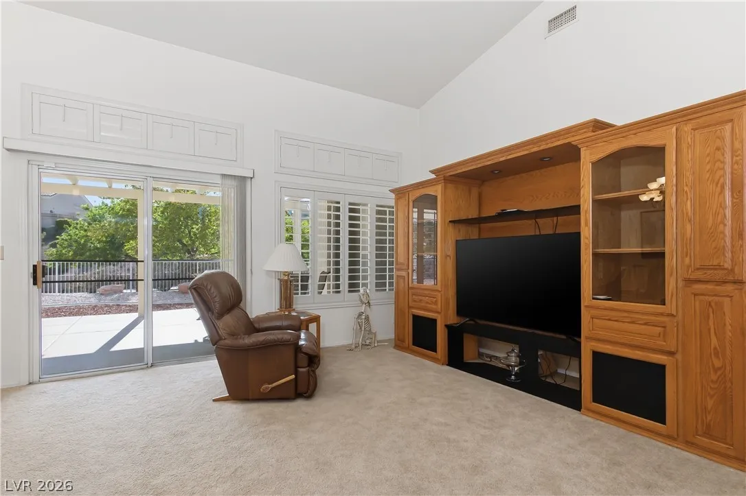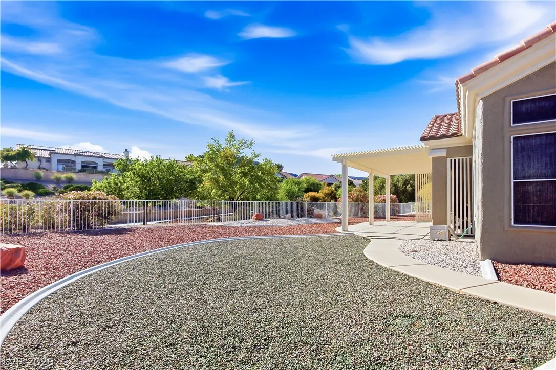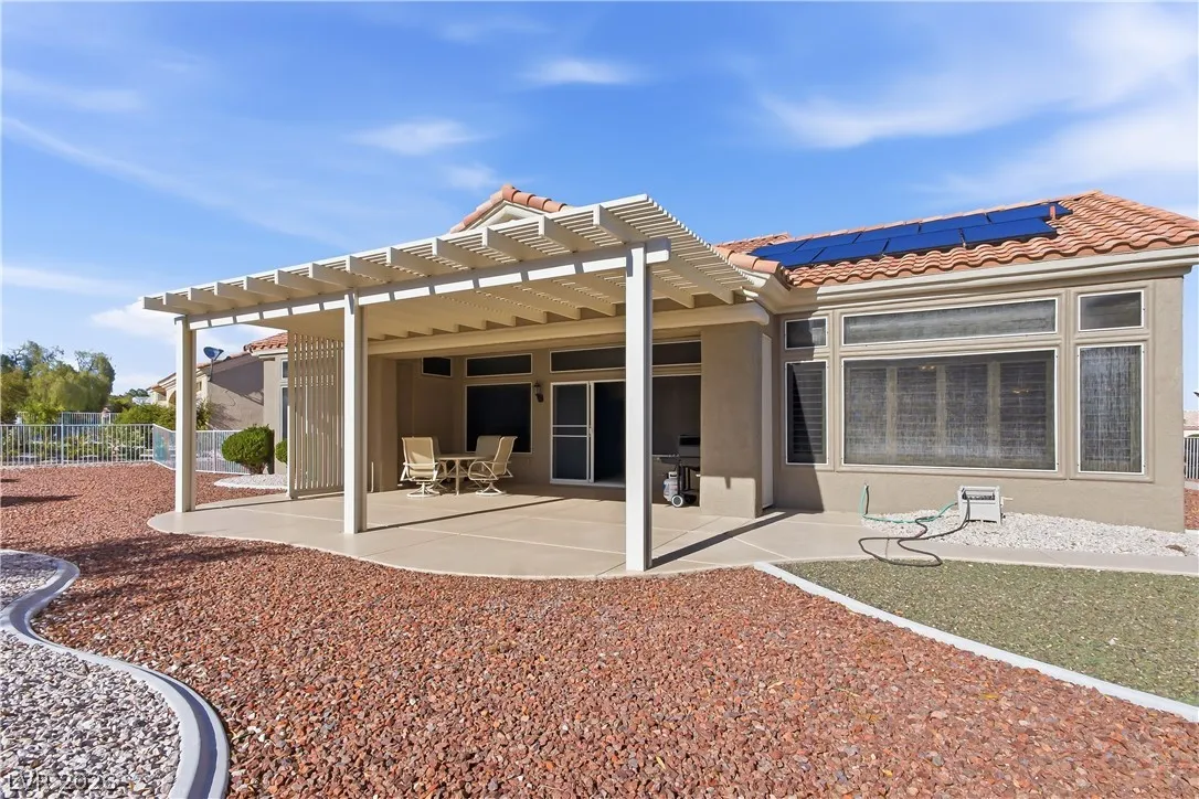 Located in the premier 55+ Sun City Summerlin community, this 2,210 sq ft, 3-bedroom Belmont model offers access to 3 golf courses, 4 clubhouses, pools, fitness centers, sports courts, clubs, and extensive amenities. The home includes an optional half bath off the kitchen/great room and backs to a greenbelt with no rear neighbors. A gated entry opens to a large foyer overlooking bright living and dining areas with expansive rear windows and serene greenery views. The open kitchen features updated appliances, granite tile counters, a curved breakfast bar, and a bay-window nook, flowing into a spacious great room with detailed ceilings. The rear primary suite offers a bay window, dual closets and vanities, plus separate tub and shower. Two additional bedrooms and a full bath are at the front. Extras include plantation shutters, ceiling fans, an oversized 2-car garage, covered patio, newer HVAC, and solar panels on a fixed PPA plan. Sun City Summerlin is a premier 55+ active community.