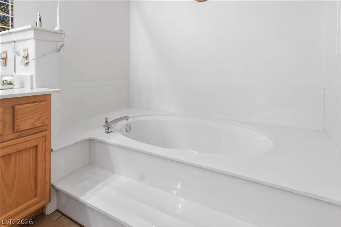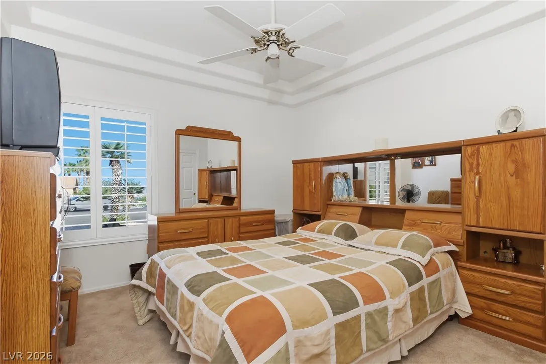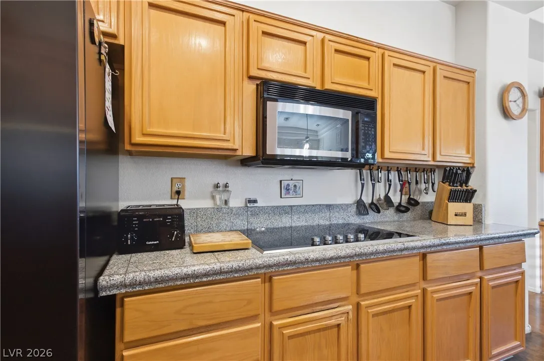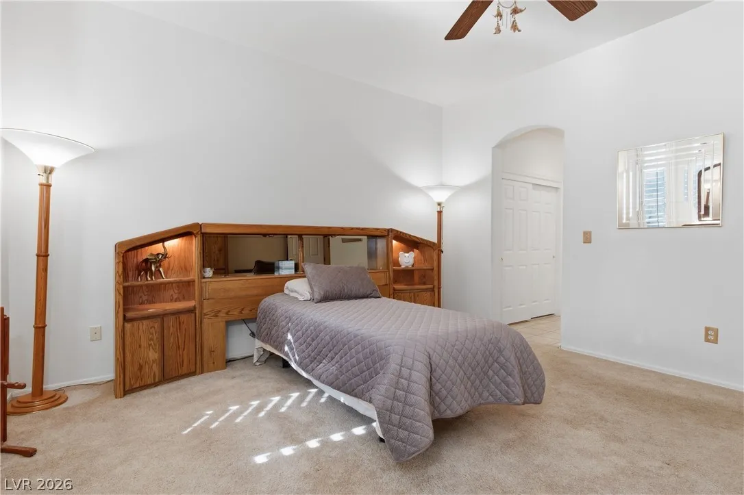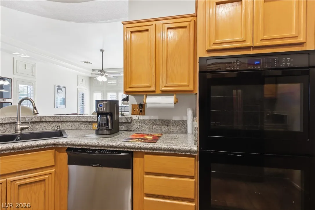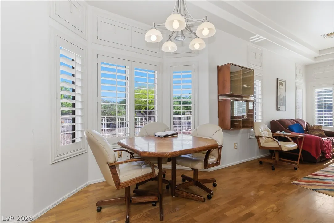 Located in the premier 55+ Sun City Summerlin community, this 2,210 sq ft, 3-bedroom Belmont model offers access to 3 golf courses, 4 clubhouses, pools, fitness centers, sports courts, clubs, and extensive amenities. The home includes an optional half bath off the kitchen/great room and backs to a greenbelt with no rear neighbors. A gated entry opens to a large foyer overlooking bright living and dining areas with expansive rear windows and serene greenery views. The open kitchen features updated appliances, granite tile counters, a curved breakfast bar, and a bay-window nook, flowing into a spacious great room with detailed ceilings. The rear primary suite offers a bay window, dual closets and vanities, plus separate tub and shower. Two additional bedrooms and a full bath are at the front. Extras include plantation shutters, ceiling fans, an oversized 2-car garage, covered patio, newer HVAC, and solar panels on a fixed PPA plan. Sun City Summerlin is a premier 55+ active community.