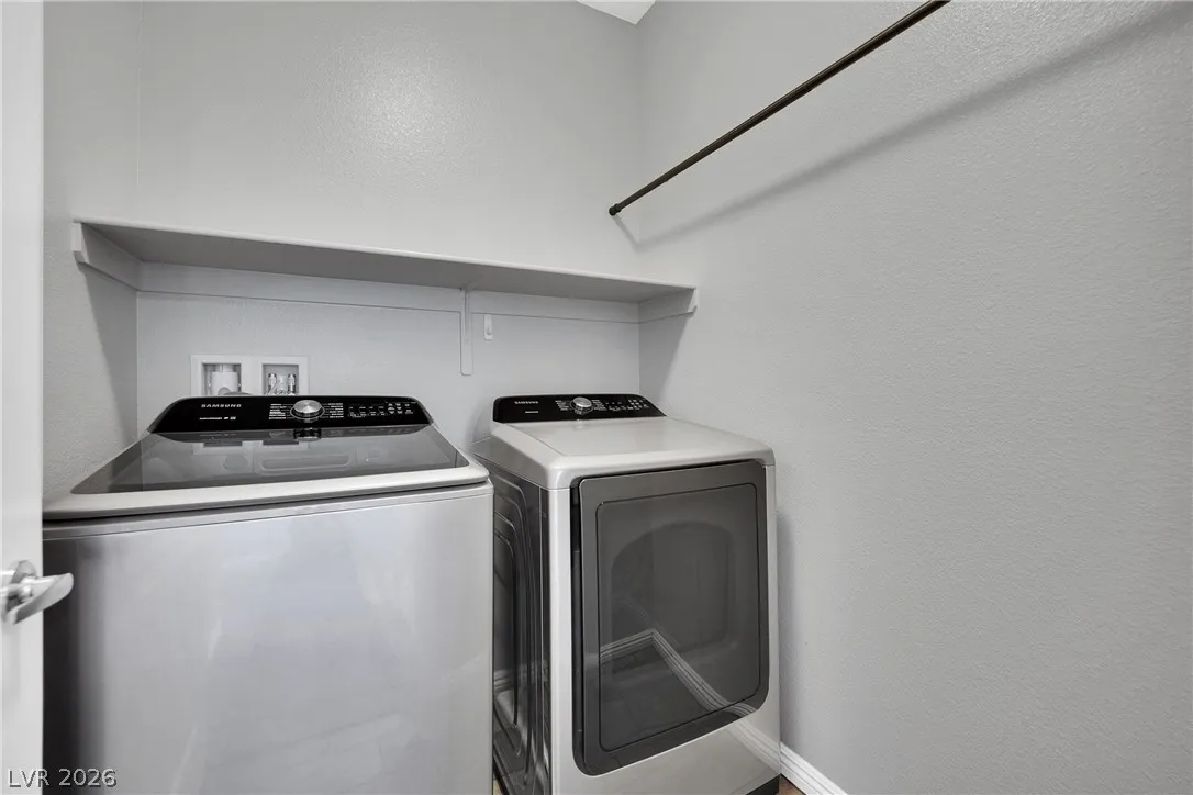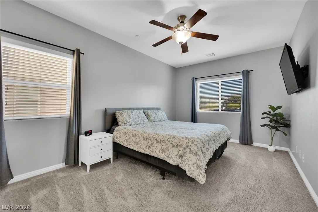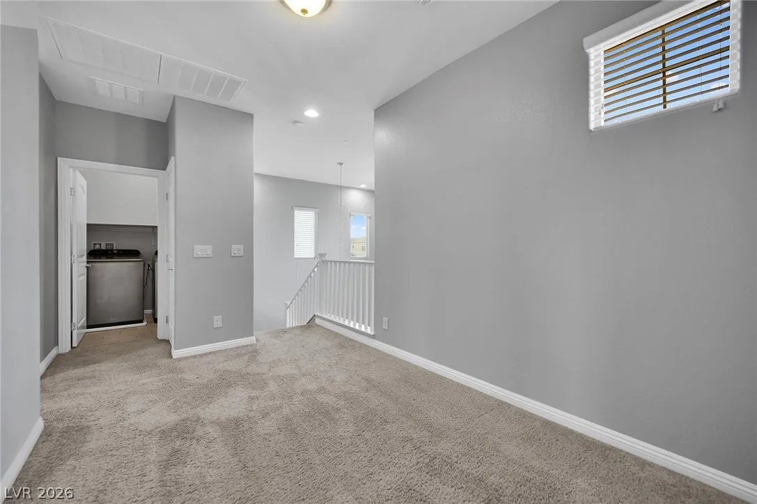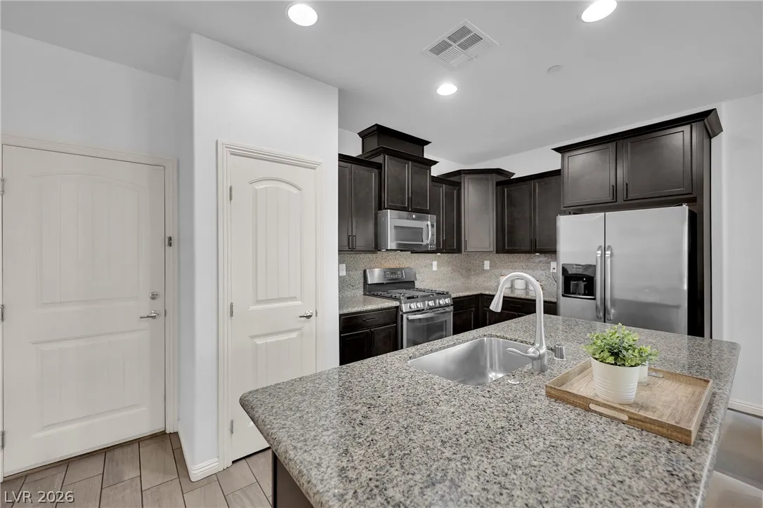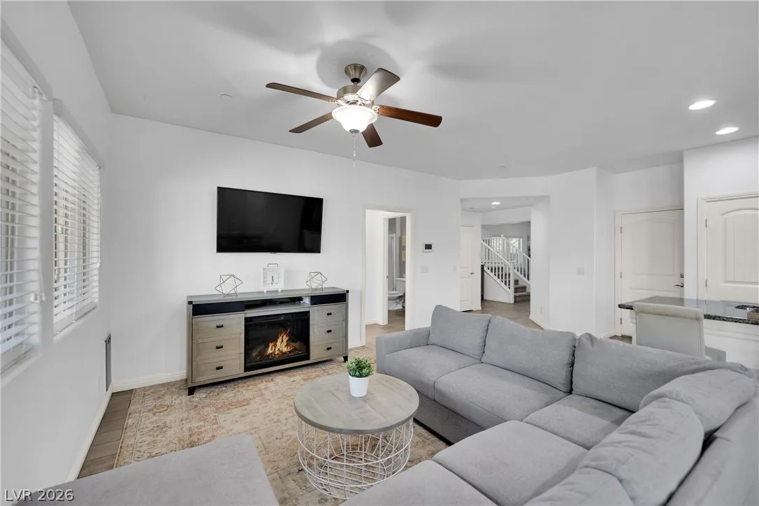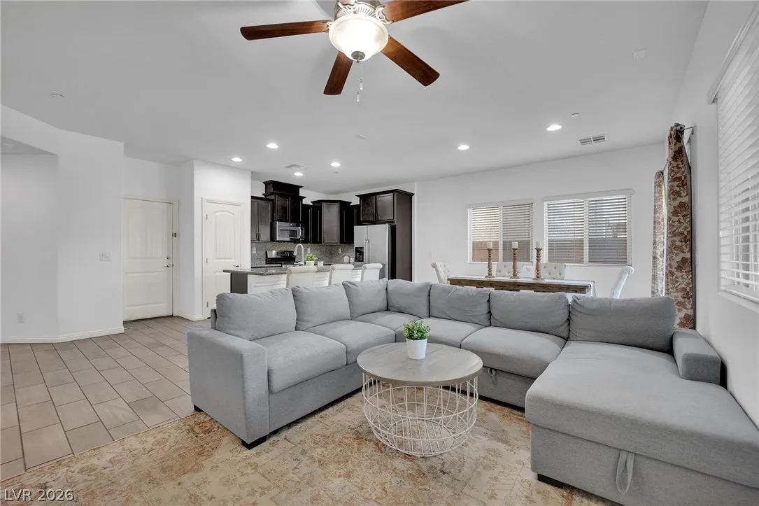Stunning 2-story home in sought-after Warm Springs Ranch in Henderson! This 3-bedroom home features an ideal open floor plan with a spacious great room, an upstairs loft, and modern smart home features. The upgraded kitchen is the heart of the home, showcasing custom cabinets, granite countertops, a designer backsplash, and stainless steel appliances. Elegant wood plank ceramic tile flooring enhances the main living spaces. Step into the expansive pool-sized backyard with a covered patio, pavers, and synthetic grass—perfect for entertaining, relaxing, or future pool plans. Residents enjoy fantastic community amenities including a pool, park, and barbecue area. Beautifully upgraded and move-in ready, this home offers comfort, style, and convenience all in one.