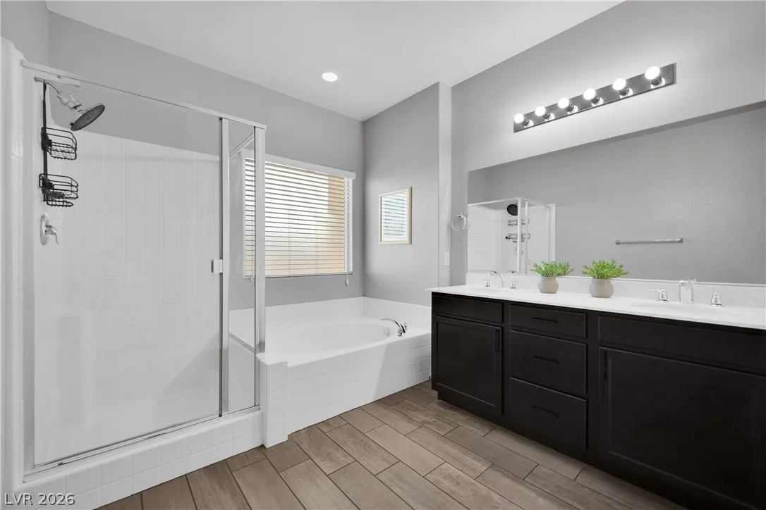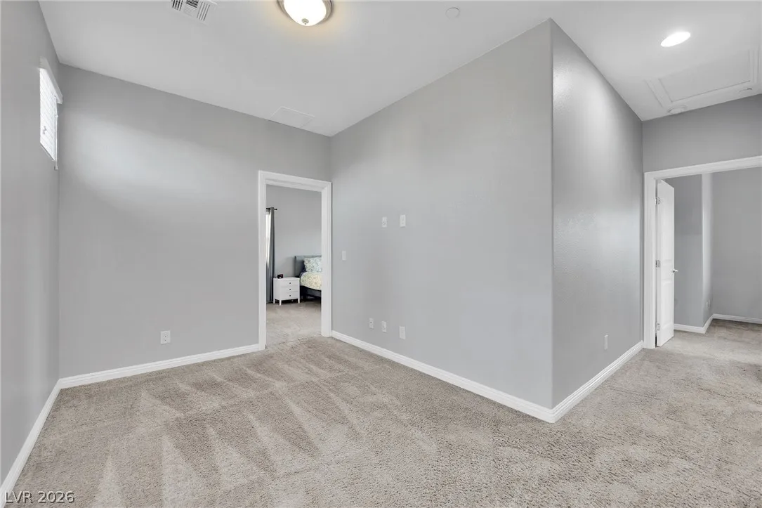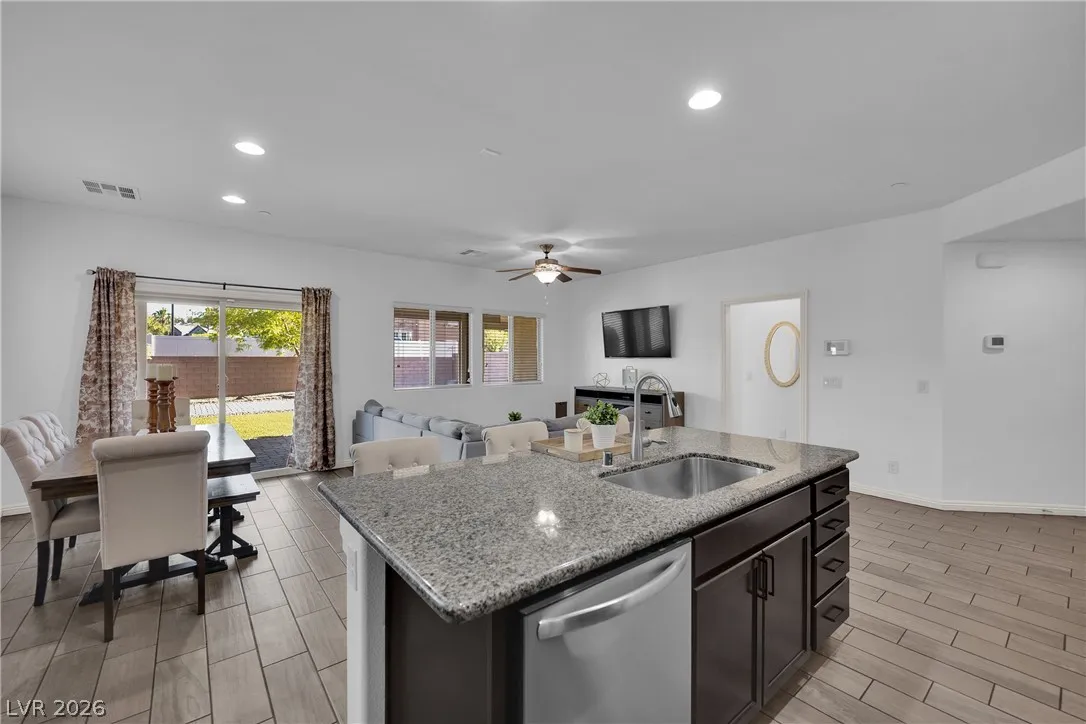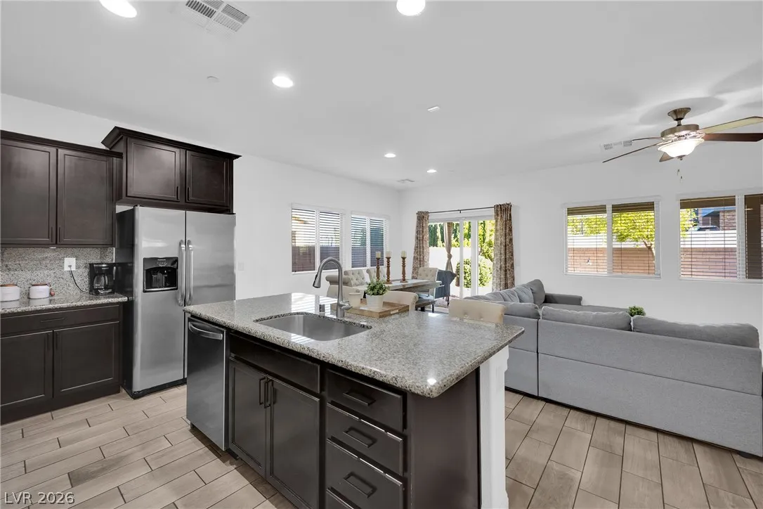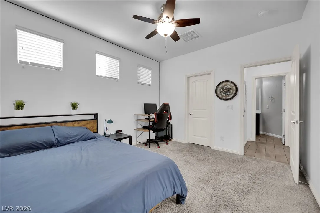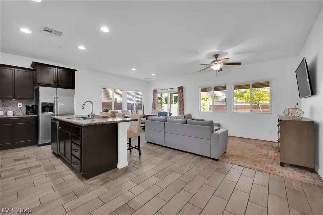 Stunning 2-story home in sought-after Warm Springs Ranch in Henderson! This 3-bedroom home features an ideal open floor plan with a spacious great room, an upstairs loft, and modern smart home features. The upgraded kitchen is the heart of the home, showcasing custom cabinets, granite countertops, a designer backsplash, and stainless steel appliances. Elegant wood plank ceramic tile flooring enhances the main living spaces. Step into the expansive pool-sized backyard with a covered patio, pavers, and synthetic grass—perfect for entertaining, relaxing, or future pool plans. Residents enjoy fantastic community amenities including a pool, park, and barbecue area. Beautifully upgraded and move-in ready, this home offers comfort, style, and convenience all in one.
