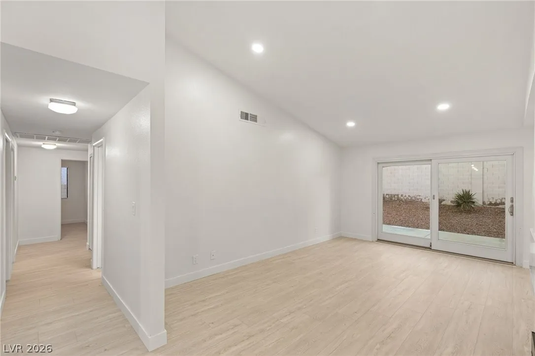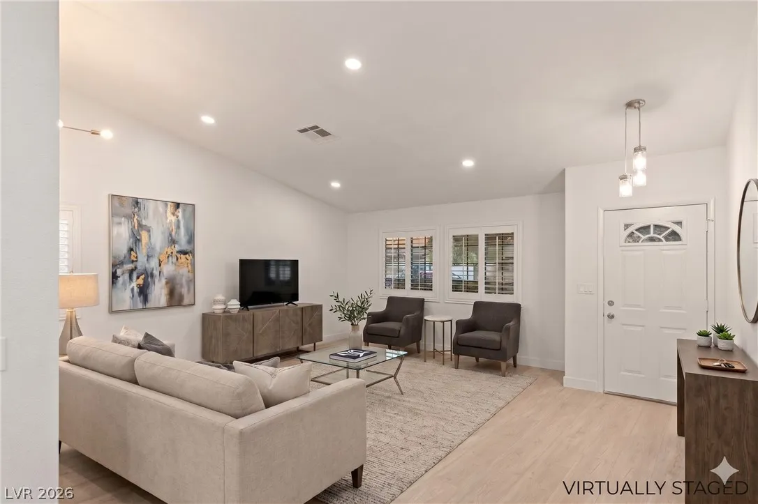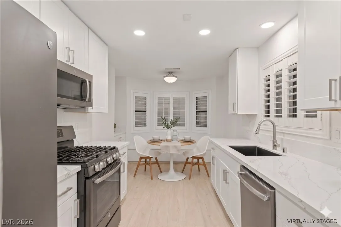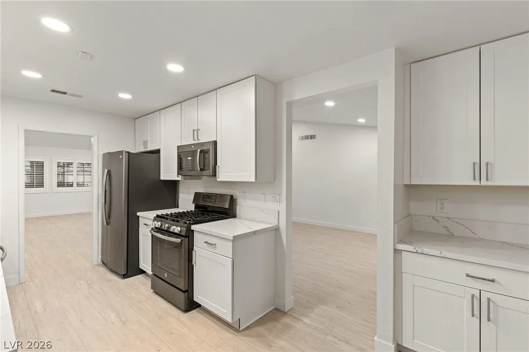 Welcome to 373 Santali Ct, a fully remodeled 3 bed 2 bath single-story home in the desirable Green Valley area of Henderson. This move-in ready residence features newer luxury vinyl plank flooring throughout, high vaulted ceilings and a bright, open layout enhanced by newer light fixtures and ceiling fans. The upgraded kitchen showcases quartz countertops, shaker cabinets, and black stainless steel appliances, blending modern style with everyday functionality. Both bathrooms have been fully renovated with matching quartz counters, updated vanities, and contemporary finishes for a cohesive, upscale feel. The primary bedroom is spacious with a large walk-in custom closet, double sinks in the bath and a newer tiled shower. A 2-car garage and quiet cul-de-sac location add convenience and privacy. Close to schools, parks, shopping, dining, and freeway access, this home offers comfort, style, and a prime Henderson location—all with no HOA.