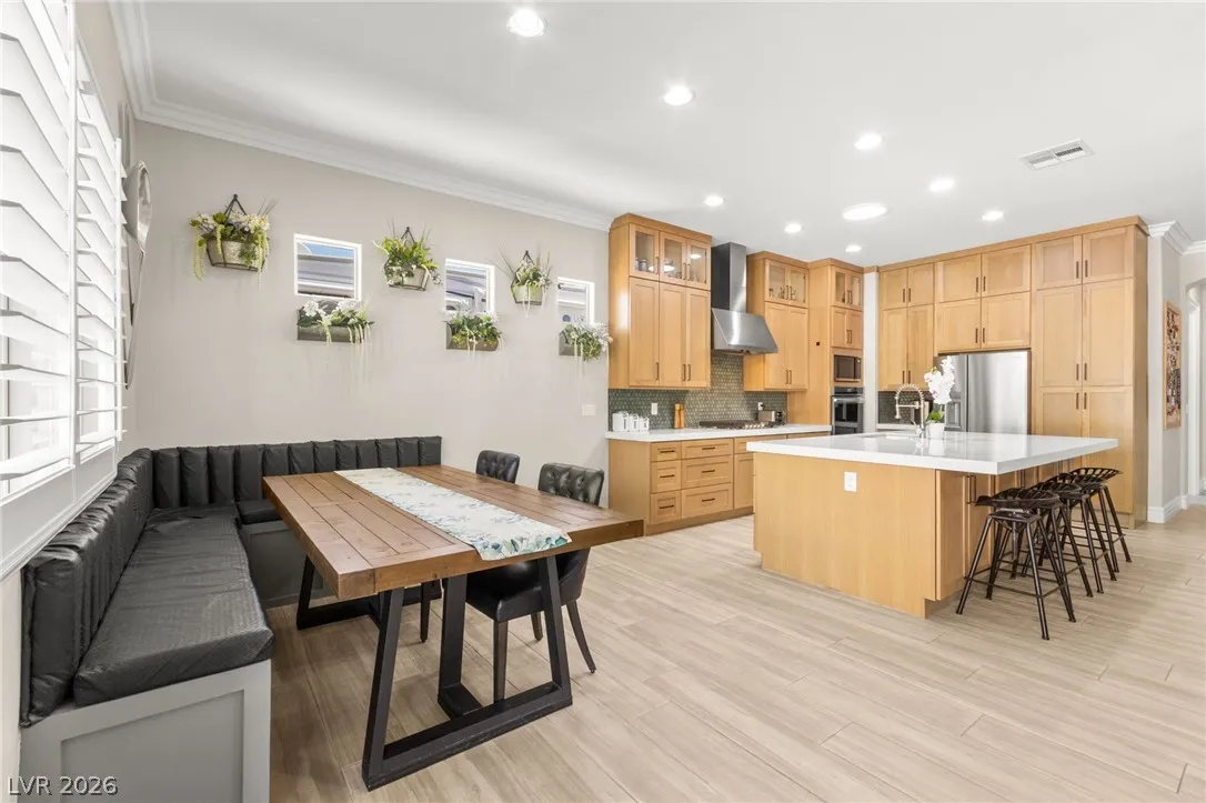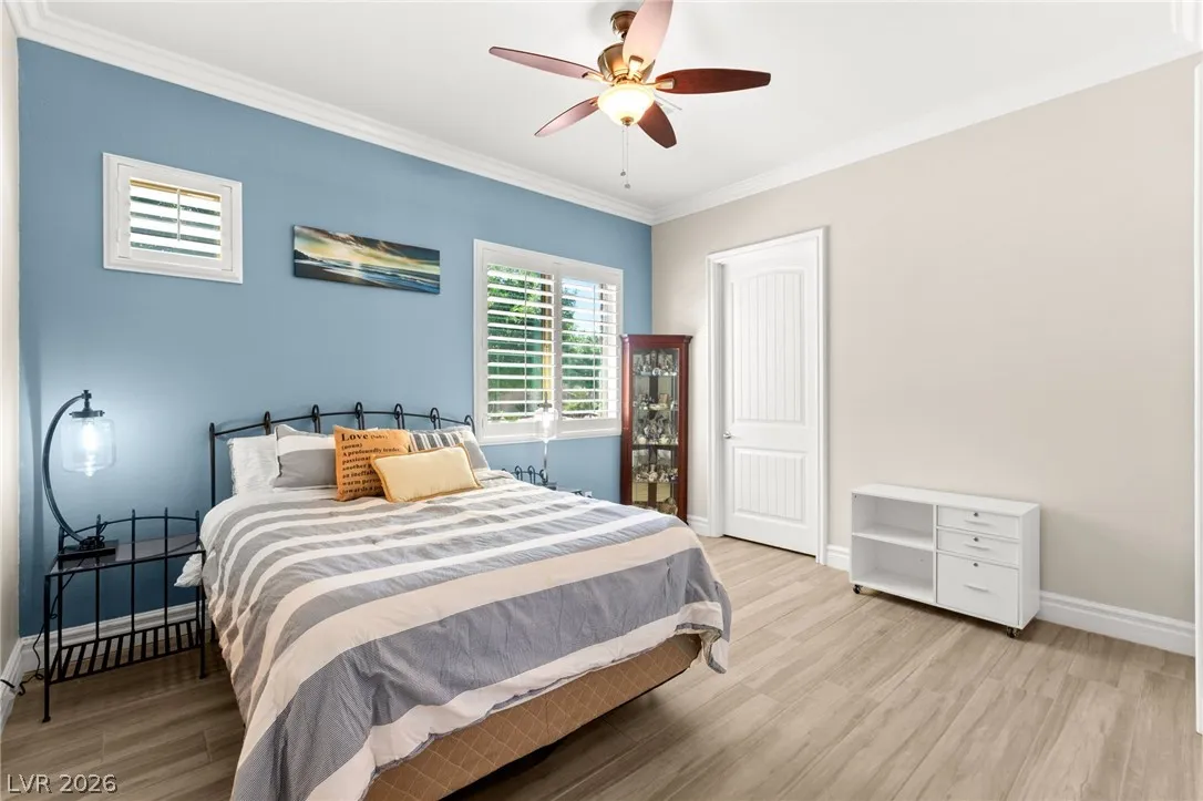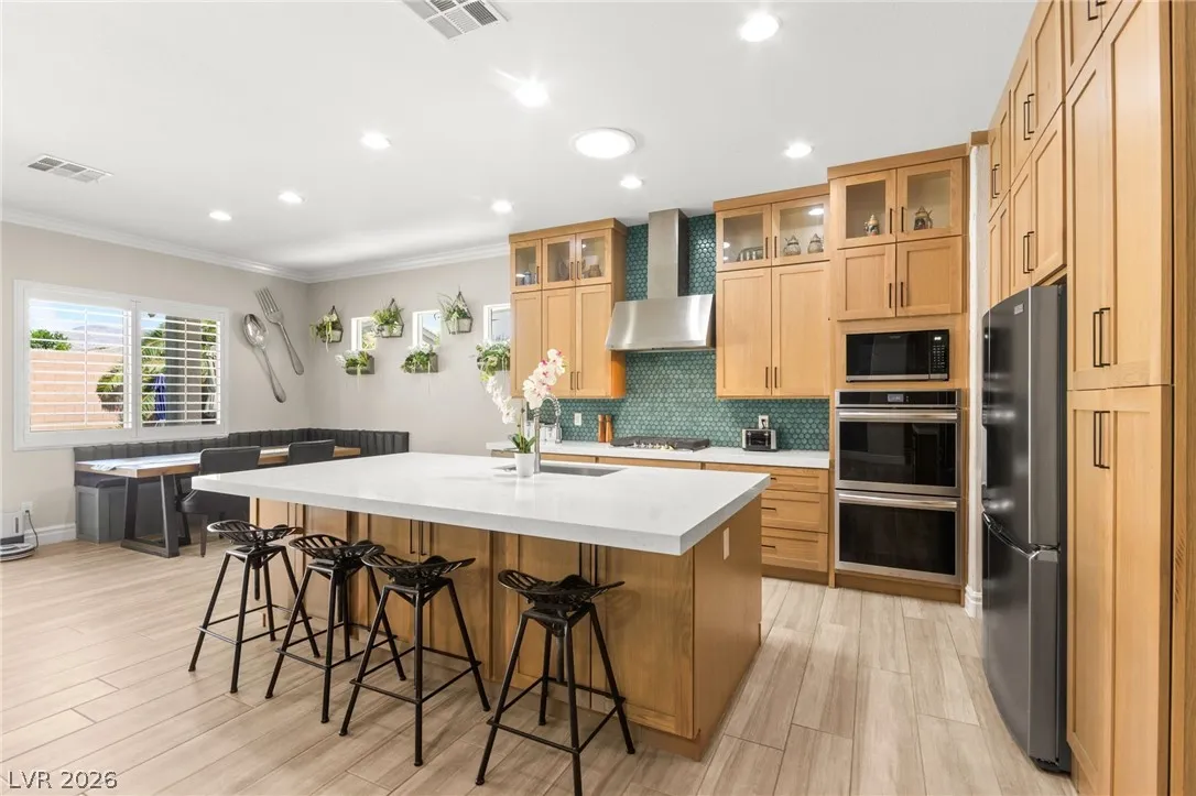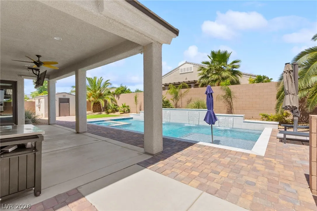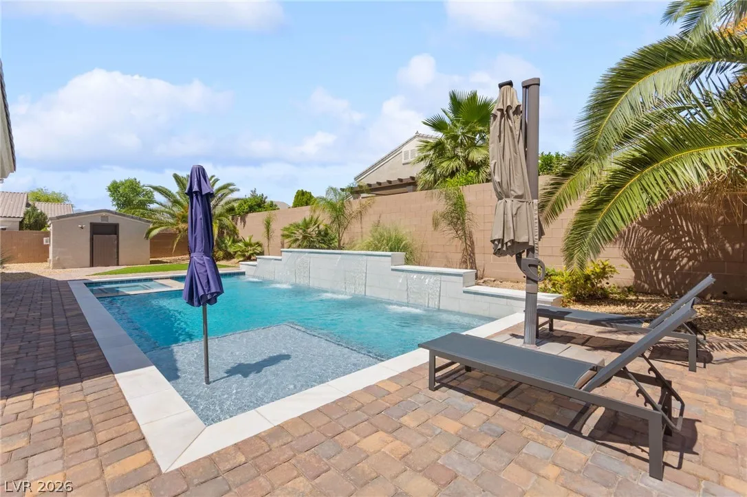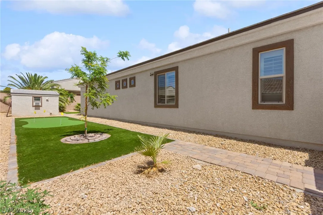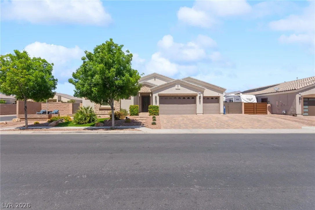 Beautifully remodeled single-story home on a ¼-acre corner lot in the gated Orchards community in NW Las Vegas. Exceptional curb appeal with a front sitting area, 3-car garage, gated RV/boat parking, and a private putting green. Inside, the open-concept layout features high ceilings, crown molding, shutters, modern ceiling fans, wood-look flooring and a stylish family room fireplace. The chef’s kitchen offers quartz countertops, stainless steel appliances, oversized island, built-in breakfast nook, hidden pantry, and designer backsplash. This 3-bedroom home includes a spacious primary suite with direct backyard access and a spa-inspired bathroom with dual sinks, large walk-in shower, and walk-in closets. Secondary bedrooms also feature walk-in closets. The resort-style backyard is designed for entertaining with a newly added pool and spa, covered patio, and insulated storage with AC. Conveniently located near premier shopping, dining, and outdoor recreation.