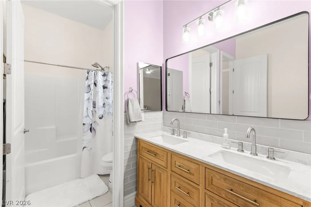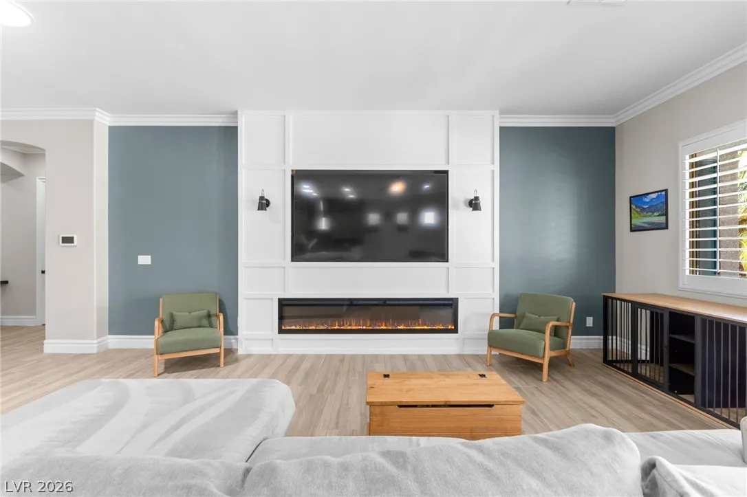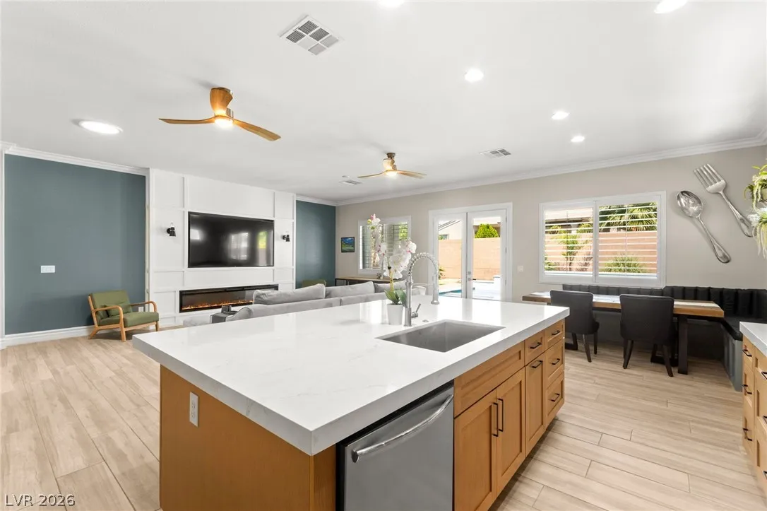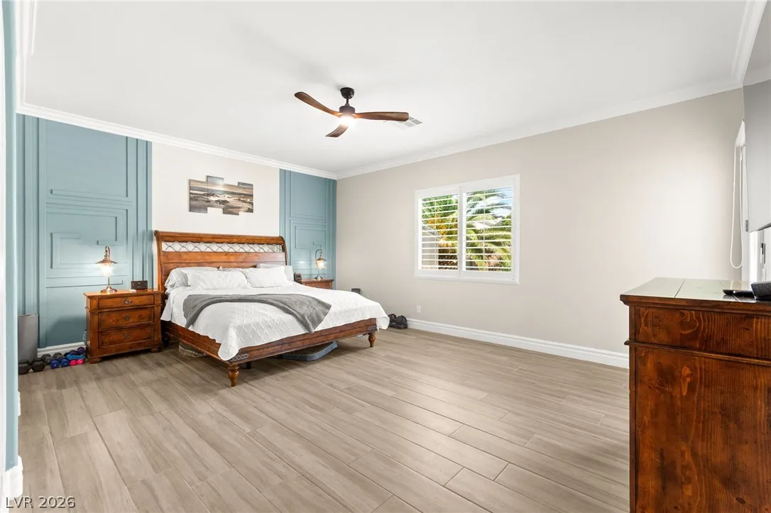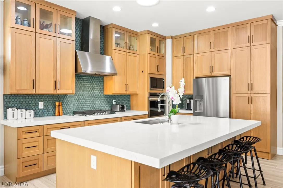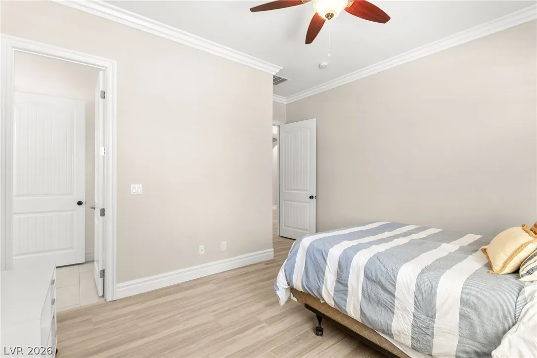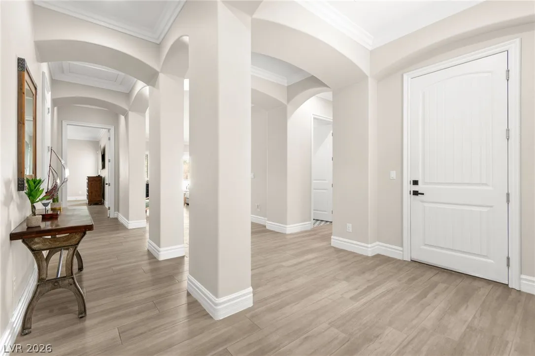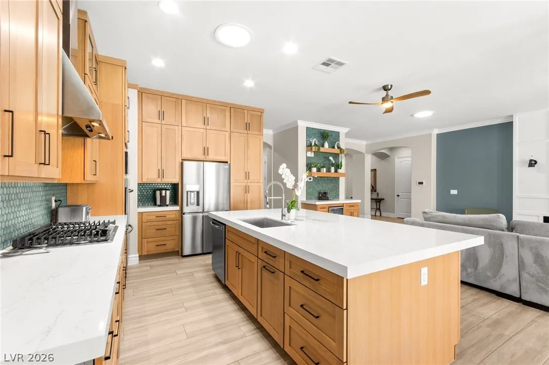 Beautifully remodeled single-story home on a ¼-acre corner lot in the gated Orchards community in NW Las Vegas. Exceptional curb appeal with a front sitting area, 3-car garage, gated RV/boat parking, and a private putting green. Inside, the open-concept layout features high ceilings, crown molding, shutters, modern ceiling fans, wood-look flooring and a stylish family room fireplace. The chef’s kitchen offers quartz countertops, stainless steel appliances, oversized island, built-in breakfast nook, hidden pantry, and designer backsplash. This 3-bedroom home includes a spacious primary suite with direct backyard access and a spa-inspired bathroom with dual sinks, large walk-in shower, and walk-in closets. Secondary bedrooms also feature walk-in closets. The resort-style backyard is designed for entertaining with a newly added pool and spa, covered patio, and insulated storage with AC. Conveniently located near premier shopping, dining, and outdoor recreation.