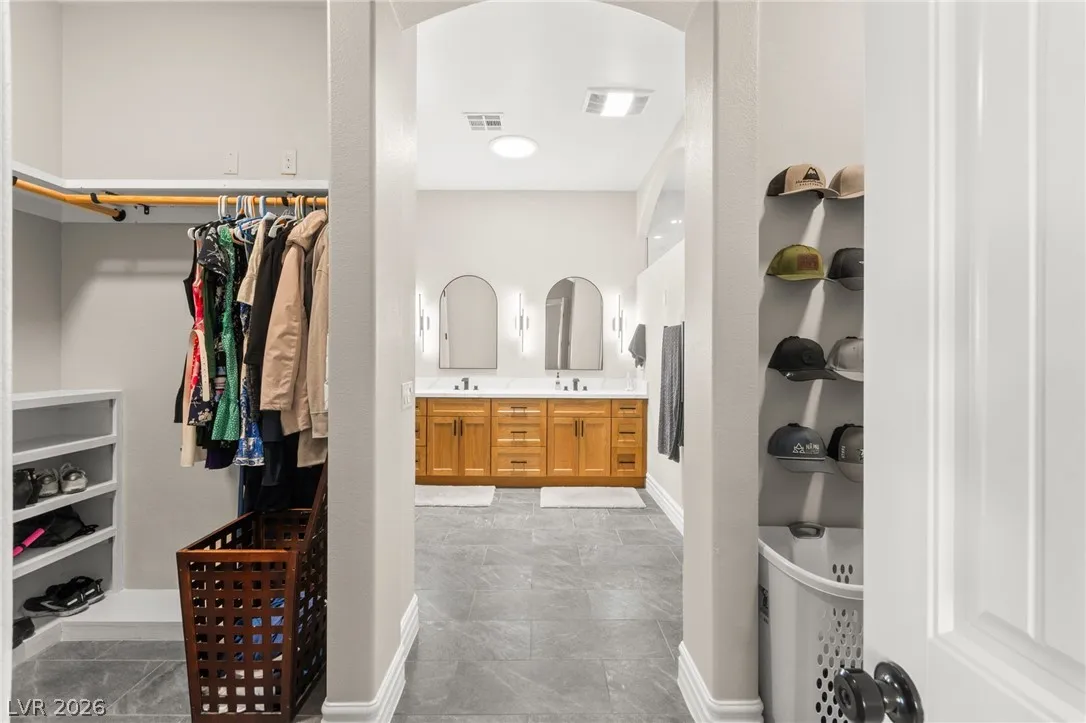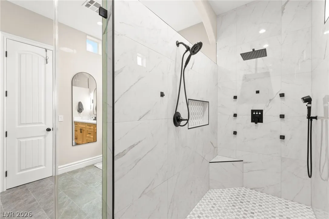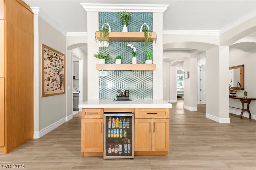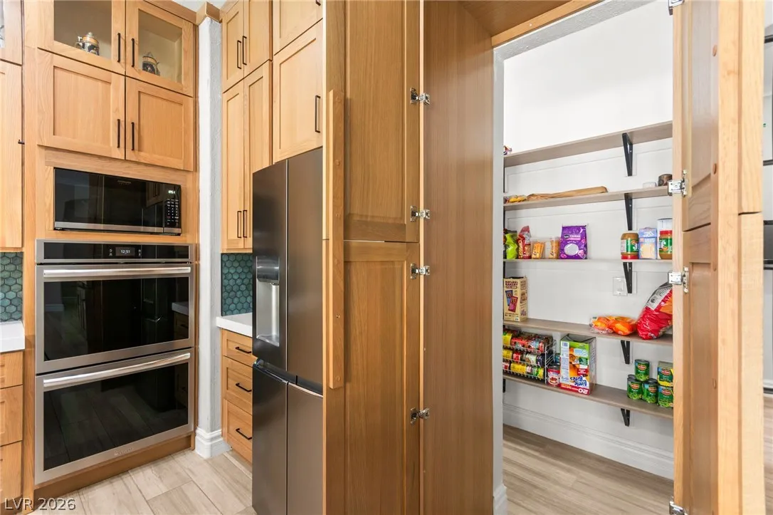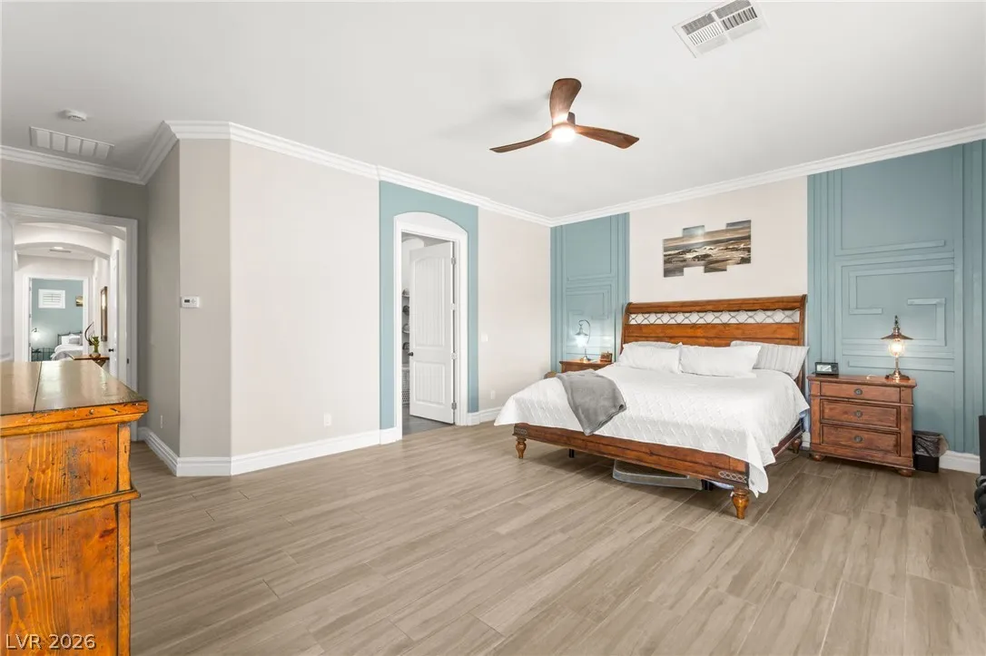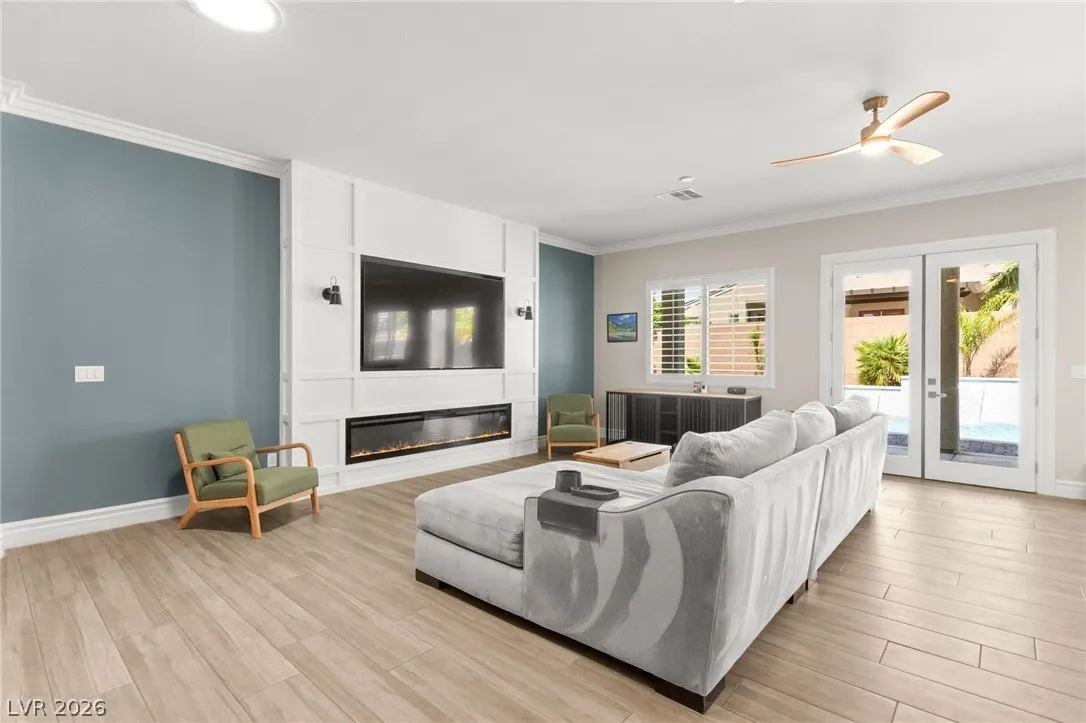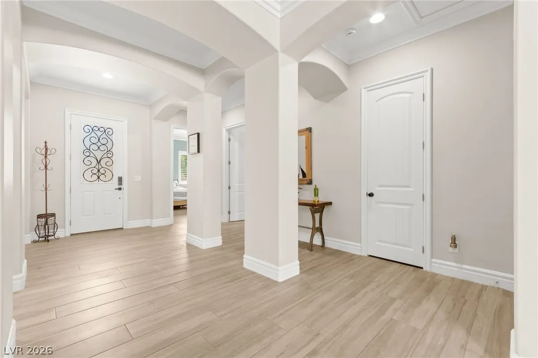 Beautifully remodeled single-story home on a ¼-acre corner lot in the gated Orchards community in NW Las Vegas. Exceptional curb appeal with a front sitting area, 3-car garage, gated RV/boat parking, and a private putting green. Inside, the open-concept layout features high ceilings, crown molding, shutters, modern ceiling fans, wood-look flooring and a stylish family room fireplace. The chef’s kitchen offers quartz countertops, stainless steel appliances, oversized island, built-in breakfast nook, hidden pantry, and designer backsplash. This 3-bedroom home includes a spacious primary suite with direct backyard access and a spa-inspired bathroom with dual sinks, large walk-in shower, and walk-in closets. Secondary bedrooms also feature walk-in closets. The resort-style backyard is designed for entertaining with a newly added pool and spa, covered patio, and insulated storage with AC. Conveniently located near premier shopping, dining, and outdoor recreation.