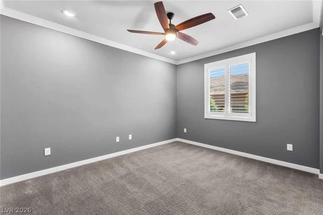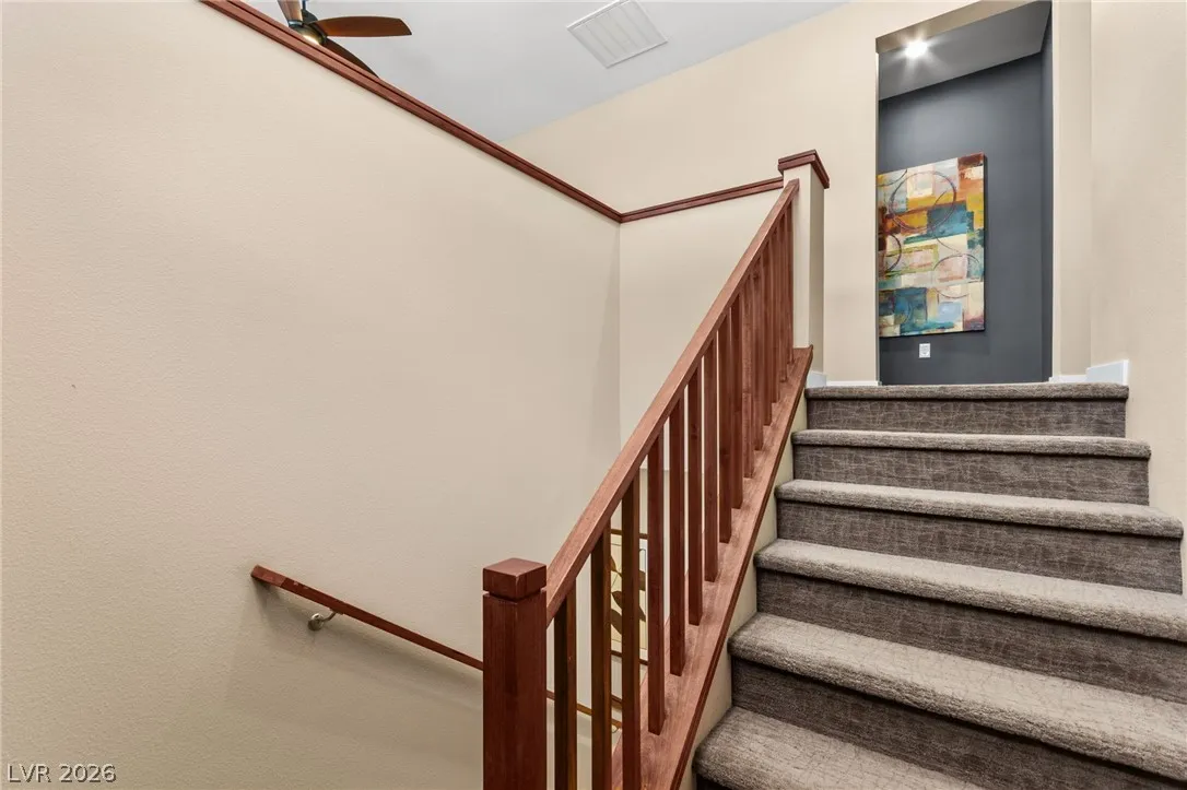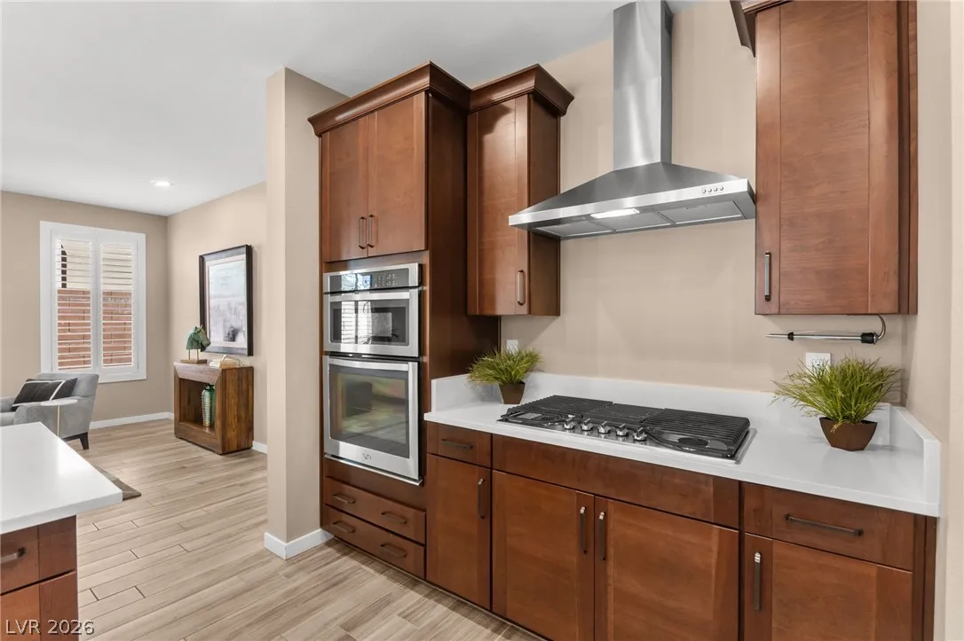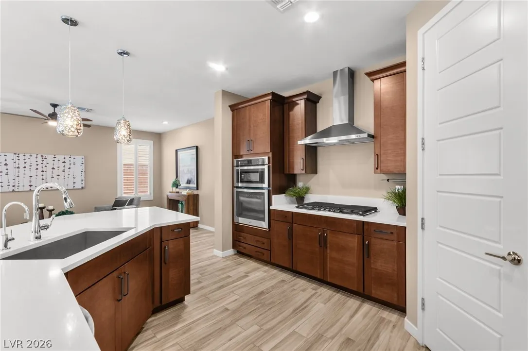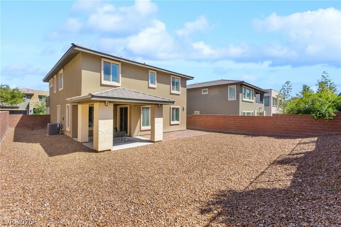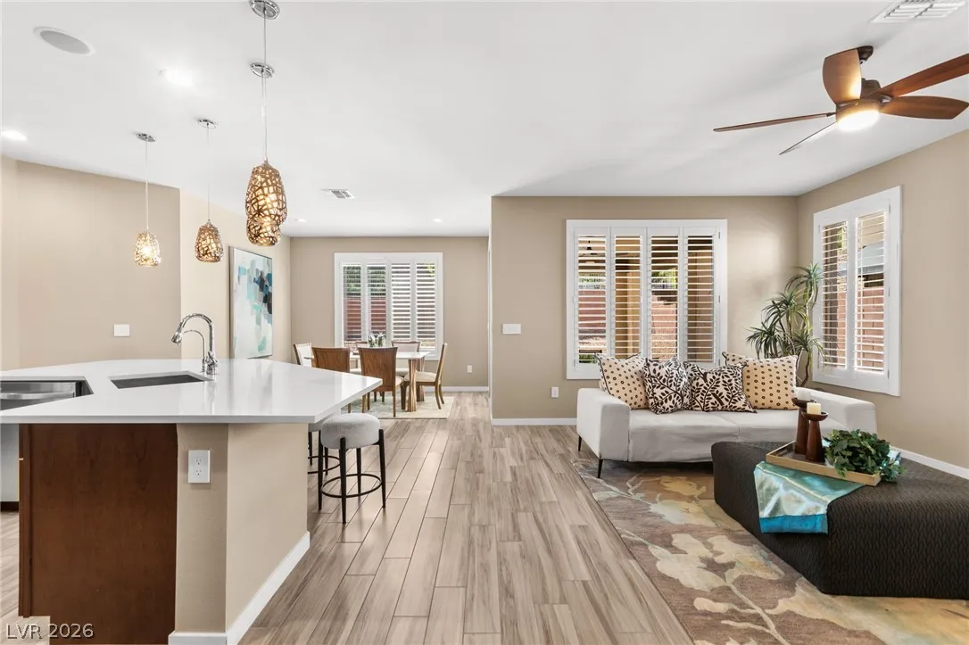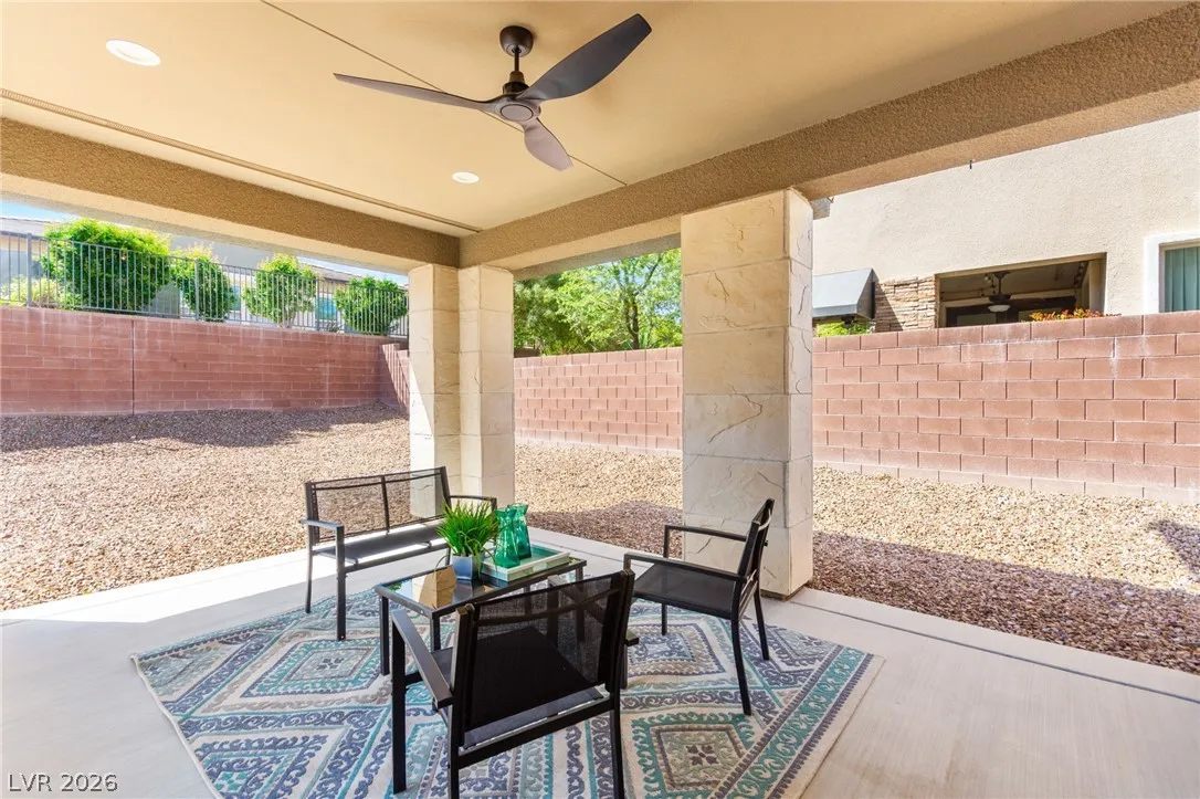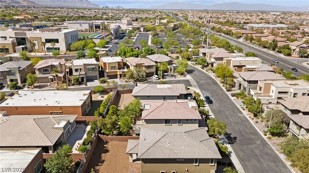 Tucked behind the gates of Vistara in The Cliffs of Summerlin, this exceptional home blends privacy, technology, and elevated living just moments from Bishop Gorman High School. Thoughtful layout features a stunning kitchen with rich walnut cabinetry, oversized island, and seamless flow into the great room and dining nook, perfect for everyday living and entertaining. Expansive picture windows with shutters fill the space with natural light and frame the, private backyard with beautiful mountain views. With 5 bedrooms and 3 full baths, including a bedroom and full bath down ideal for long-term guests or multigen living, this home offers both flexibility and comfort. Upgrades include whole-home ethernet wiring, surround sound, and a smart cabinet system in the laundry room for modern convenience. Finished 2-car garage with epoxy floors and EV charging. This gated community is known for its tranquility and prestige, a rare balance of seclusion and connection. Check out the Virtual Tour