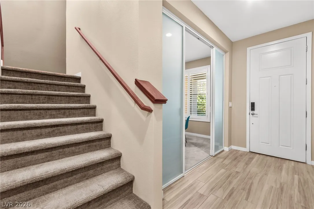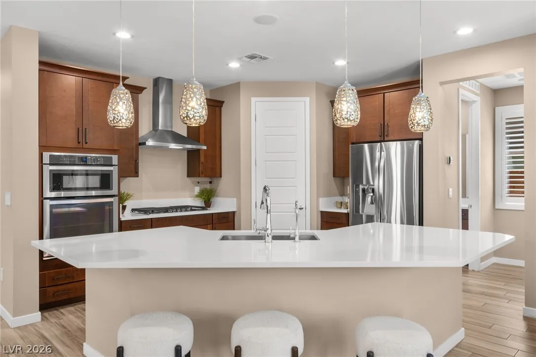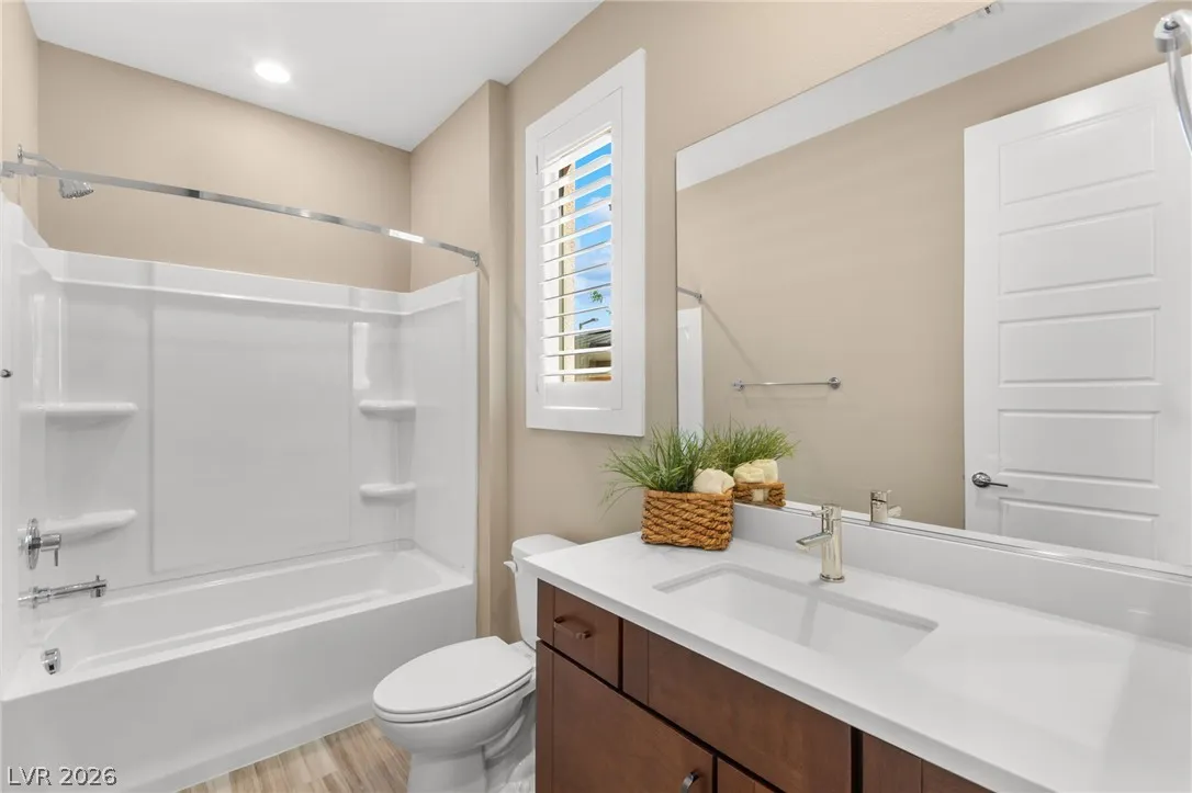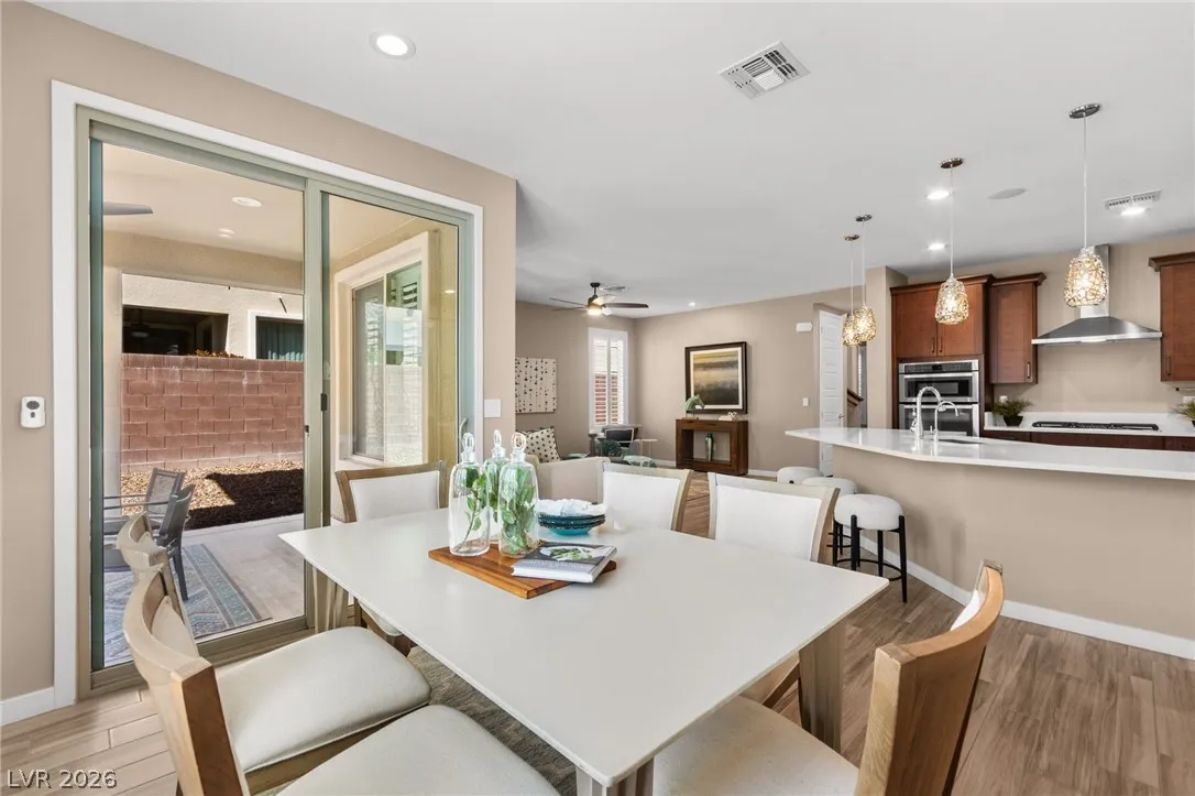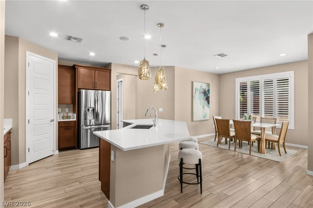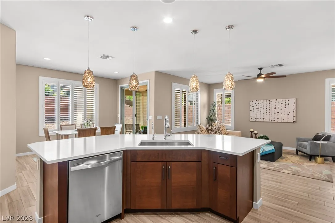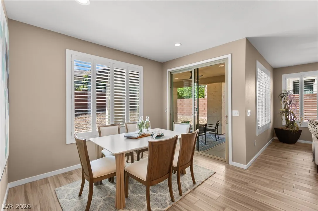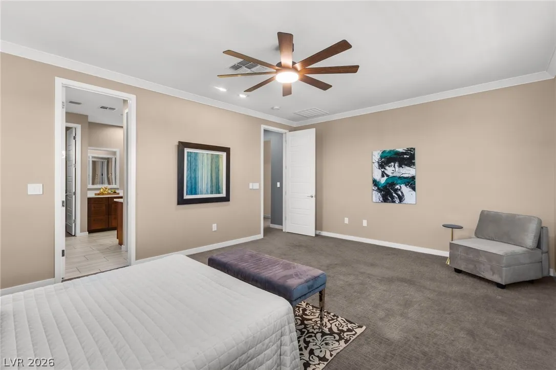 Tucked behind the gates of Vistara in The Cliffs of Summerlin, this exceptional home blends privacy, technology, and elevated living just moments from Bishop Gorman High School. Thoughtful layout features a stunning kitchen with rich walnut cabinetry, oversized island, and seamless flow into the great room and dining nook, perfect for everyday living and entertaining. Expansive picture windows with shutters fill the space with natural light and frame the, private backyard with beautiful mountain views. With 5 bedrooms and 3 full baths, including a bedroom and full bath down ideal for long-term guests or multigen living, this home offers both flexibility and comfort. Upgrades include whole-home ethernet wiring, surround sound, and a smart cabinet system in the laundry room for modern convenience. Finished 2-car garage with epoxy floors and EV charging. This gated community is known for its tranquility and prestige, a rare balance of seclusion and connection. Check out the Virtual Tour