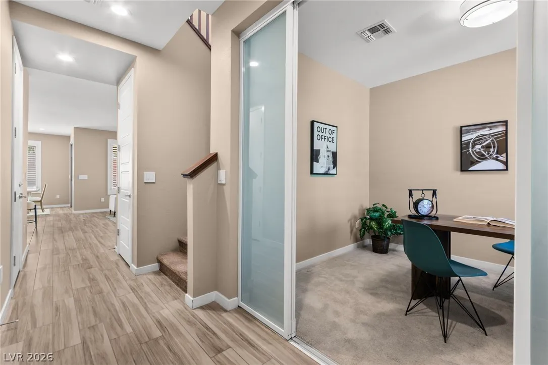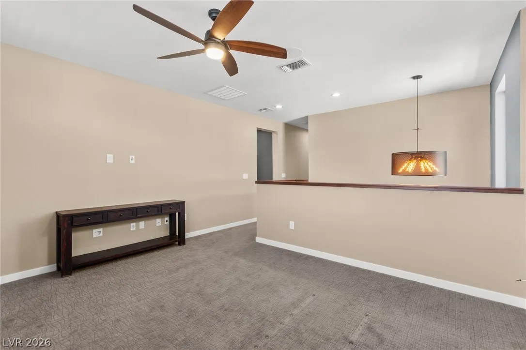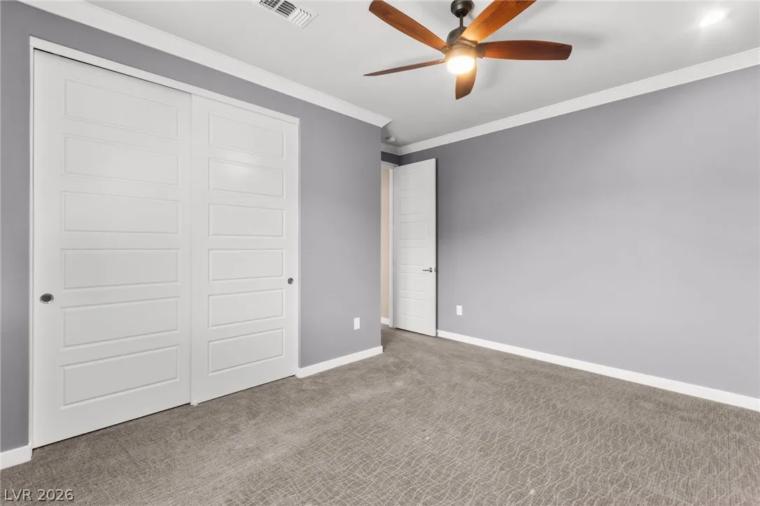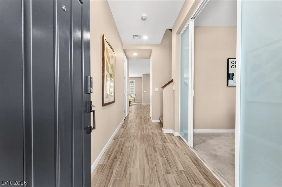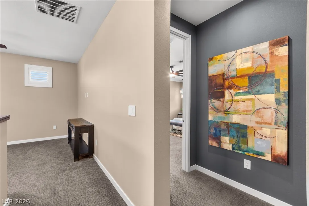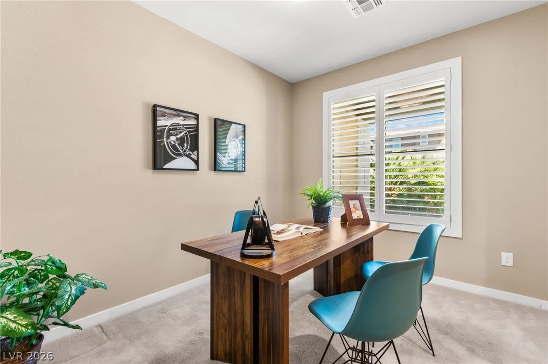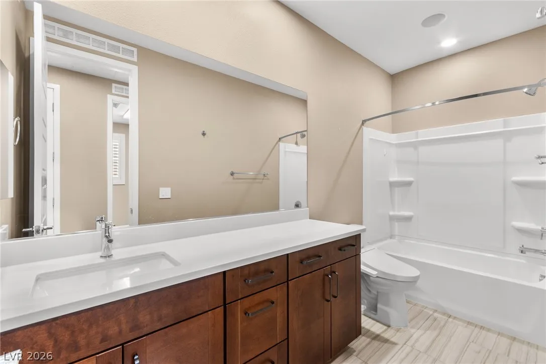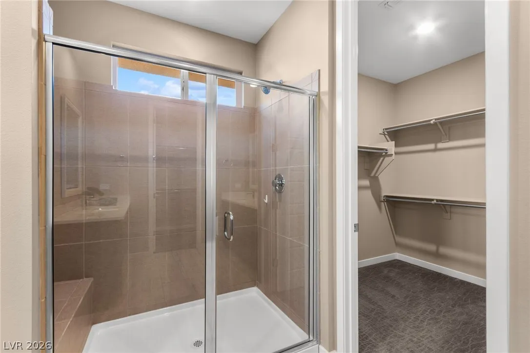 Tucked behind the gates of Vistara in The Cliffs of Summerlin, this exceptional home blends privacy, technology, and elevated living just moments from Bishop Gorman High School. Thoughtful layout features a stunning kitchen with rich walnut cabinetry, oversized island, and seamless flow into the great room and dining nook, perfect for everyday living and entertaining. Expansive picture windows with shutters fill the space with natural light and frame the, private backyard with beautiful mountain views. With 5 bedrooms and 3 full baths, including a bedroom and full bath down ideal for long-term guests or multigen living, this home offers both flexibility and comfort. Upgrades include whole-home ethernet wiring, surround sound, and a smart cabinet system in the laundry room for modern convenience. Finished 2-car garage with epoxy floors and EV charging. This gated community is known for its tranquility and prestige, a rare balance of seclusion and connection. Check out the Virtual Tour